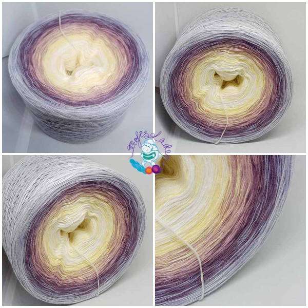 Bobbel, gefachtes Garn, d. h, dass einzelne Fäden nebeneinander laufen und nicht verzwirnt sind. Beim Farbwechsel entstehen kleine Knötchen, die bei der Arbeit mit gestrickt/gehäkelt werden können, Die Knötchen sind bei der fertigen Arbeit nicht zu sehen. Es wird immer nur ein Faden gewechselt, so dass fließende Farbübergänge entstehen.