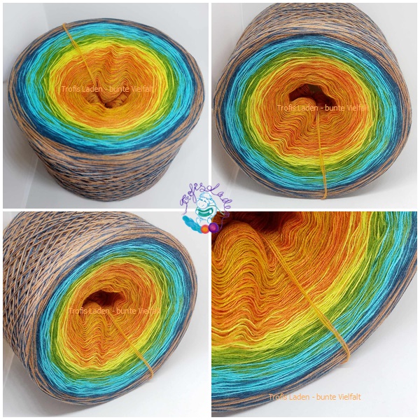 Bobbel, gefachtes Garn, d. h, dass einzelne Fäden nebeneinander laufen und nicht verzwirnt sind. Beim Farbwechsel entstehen kleine Knötchen, die bei der Arbeit mit gestrickt/gehäkelt werden können, Die Knötchen sind bei der fertigen Arbeit nicht zu sehen. Es wird immer nur ein Faden gewechselt, so dass fließende Farbübergänge entstehen.