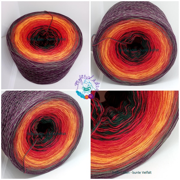 Bobbel, gefachtes Garn, d. h, dass einzelne Fäden nebeneinander laufen und nicht verzwirnt sind. Beim Farbwechsel entstehen kleine Knötchen, die bei der Arbeit mit gestrickt/gehäkelt werden können, Die Knötchen sind bei der fertigen Arbeit nicht zu sehen. Es wird immer nur ein Faden gewechselt, so dass fließende Farbübergänge entstehen.