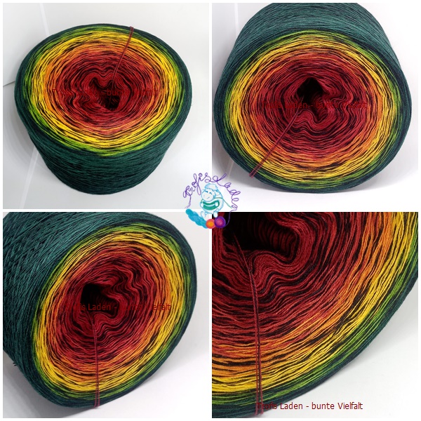 Bobbel, gefachtes Garn, d. h, dass einzelne Fäden nebeneinander laufen und nicht verzwirnt sind. Beim Farbwechsel entstehen kleine Knötchen, die bei der Arbeit mit gestrickt/gehäkelt werden können, Die Knötchen sind bei der fertigen Arbeit nicht zu sehen. Es wird immer nur ein Faden gewechselt, so dass fließende Farbübergänge entstehen.