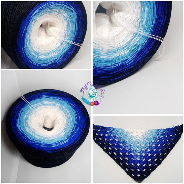 Bobbel, gefachtes Garn, d. h, dass einzelne Fäden nebeneinander laufen und nicht verzwirnt sind. Beim Farbwechsel entstehen kleine Knötchen, die bei der Arbeit mit gestrickt/gehäkelt werden können, Die Knötchen sind bei der fertigen Arbeit nicht zu sehen. Es wird immer nur ein Faden gewechselt, so dass fließende Farbübergänge entstehen.