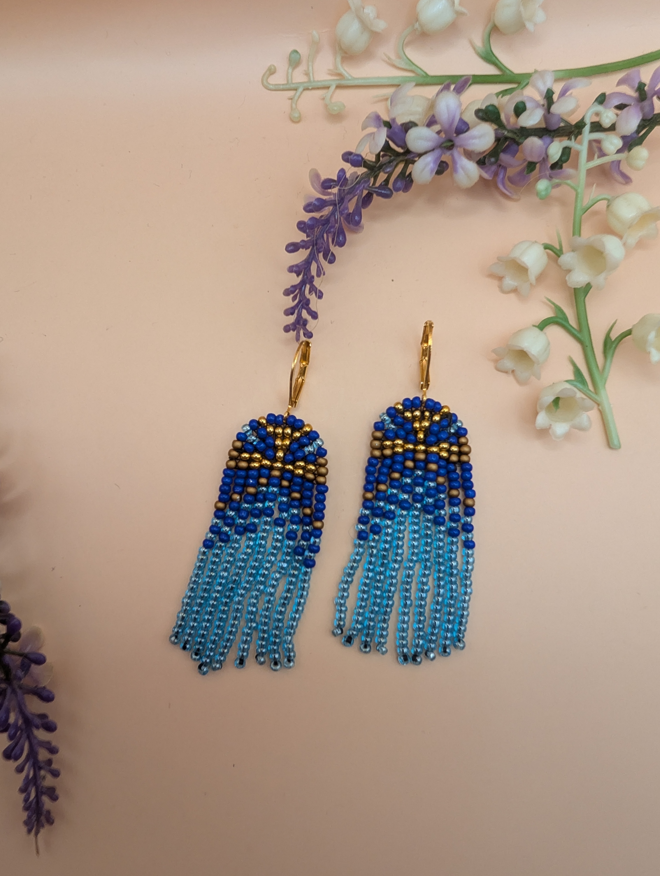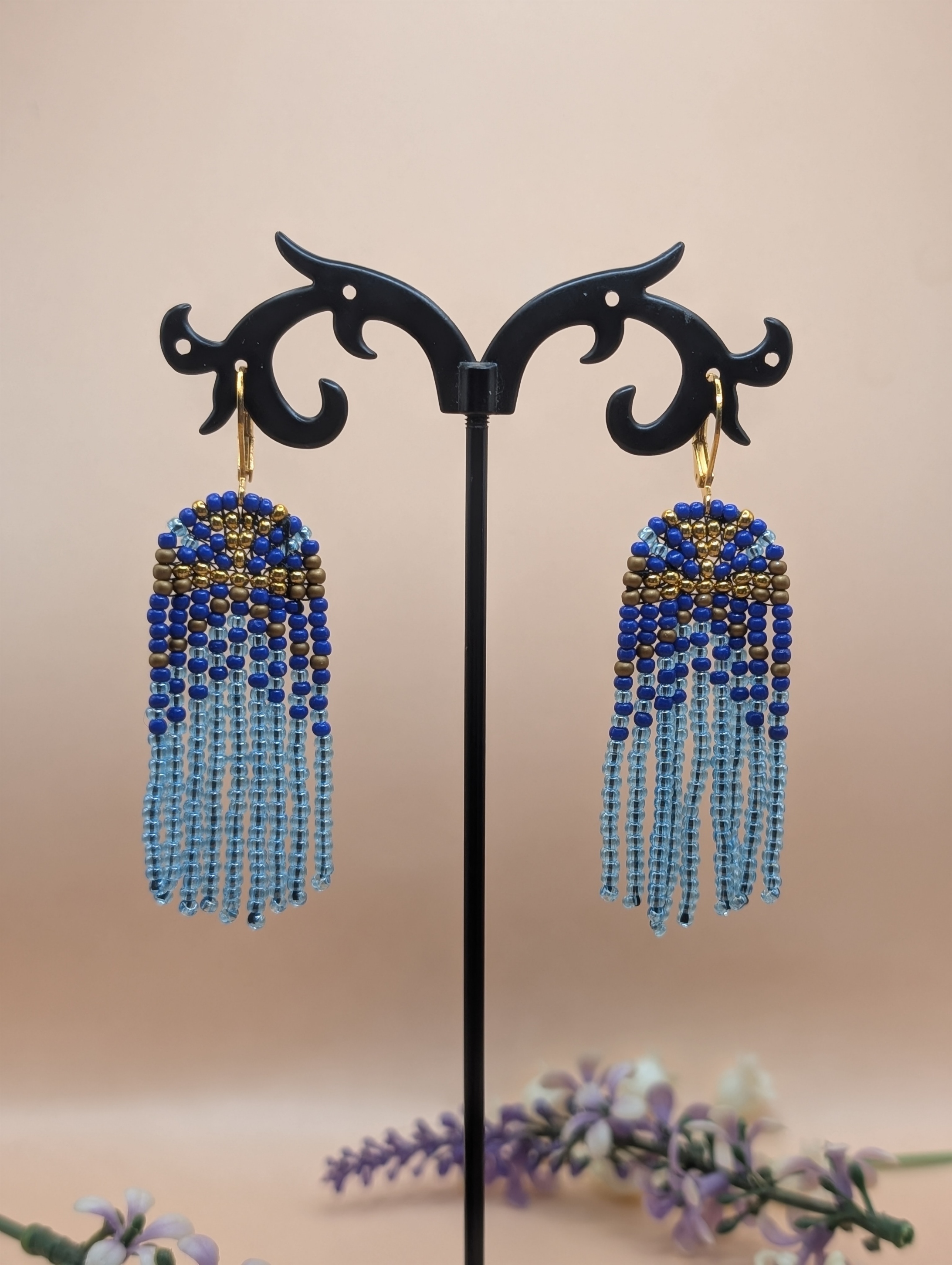 Diese wunderschönen Boho-Ohrringe in einer edlen Kombination aus Blau und schimmerndem Gold sind das perfekte Accessoire für Frauen, die das Besondere lieben. Jedes Paar wird mit viel Liebe zum Detail von Hand gefertigt und vereint künstlerisches Design mit zeitloser Eleganz.