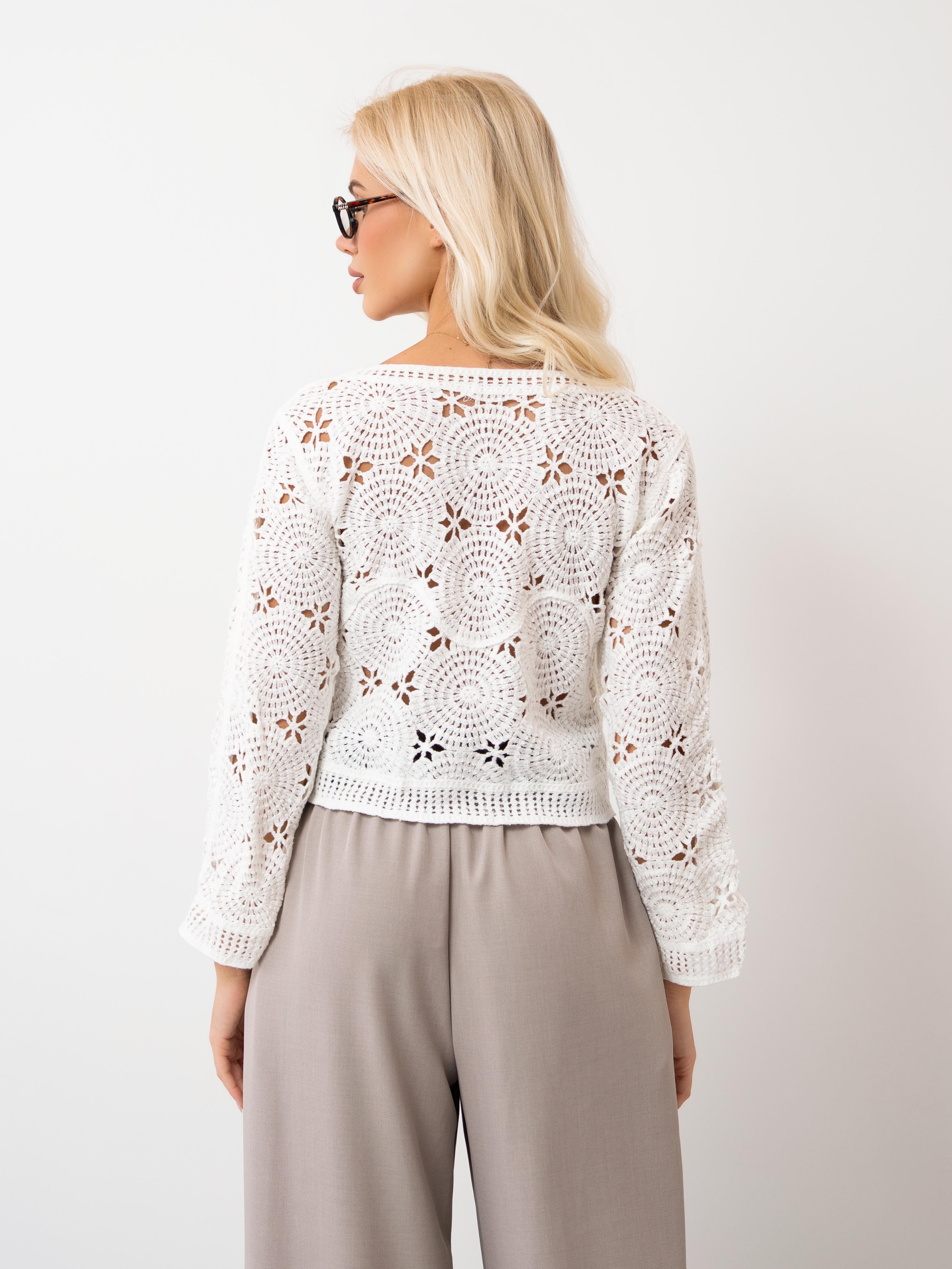 Diese einzigartige Bluse aus aufwendig gehäkeltem Strickstoff verkörpert romantischen Boho-Stil mit einem modernen Touch. Ihr markantestes Merkmal sind die dichten, dreidimensionalen Blumenapplikationen, die ihr eine besondere Textur verleihen. Die luftige Struktur des Stoffes mit dekorativen Transparenzen sorgt für einen bemerkenswert leichten und dezenten Look. Die Bluse hat einen klassischen Rundhalsausschnitt und lange, gerade Ärmel mit einem feinen Strickabschluss. Der kurze Schnitt harmoniert perfekt mit hochgeschnittenen Hosen und kreiert einen femininen und eleganten Look, ideal für Sommertage oder Abendveranstaltungen.