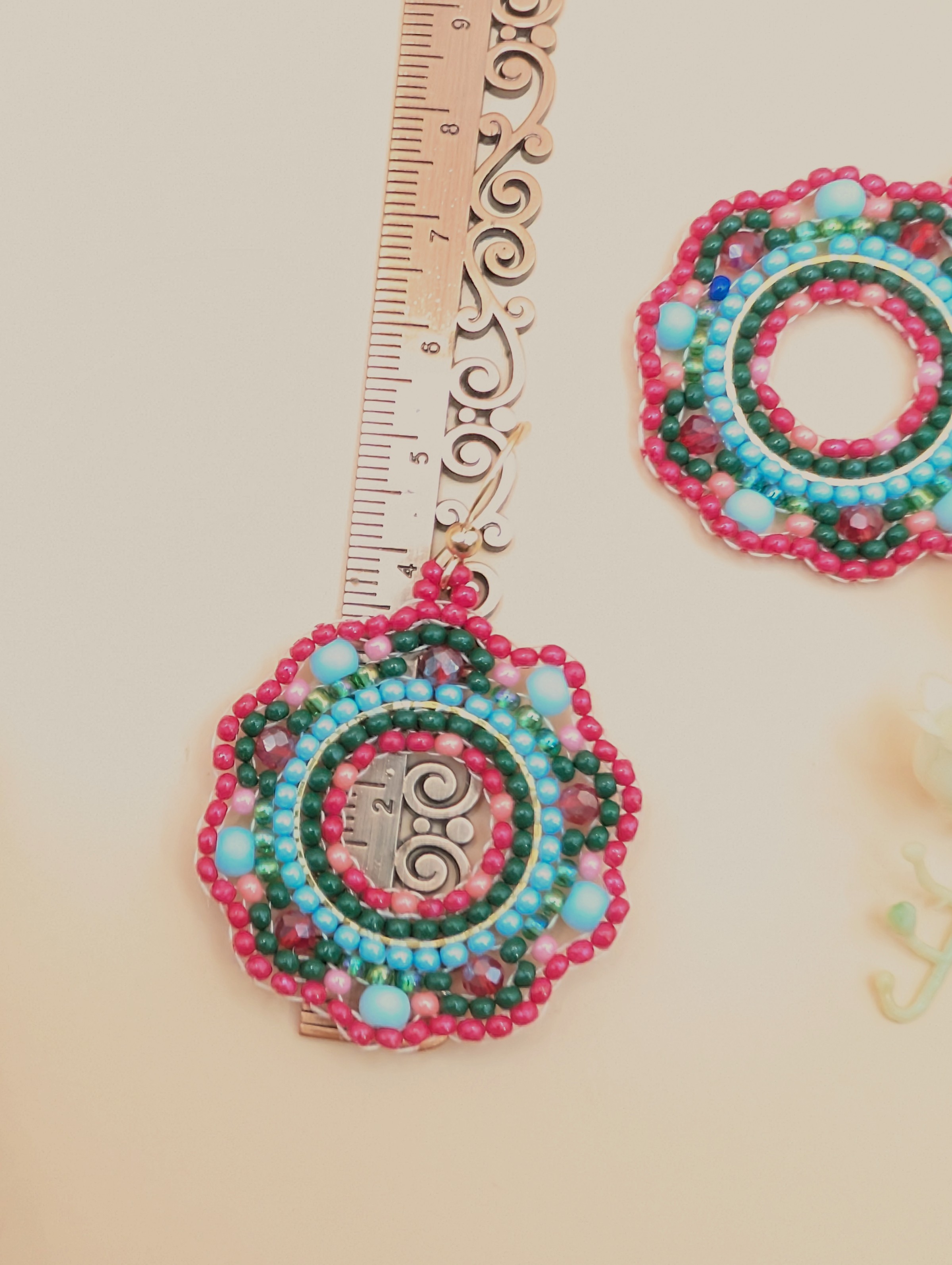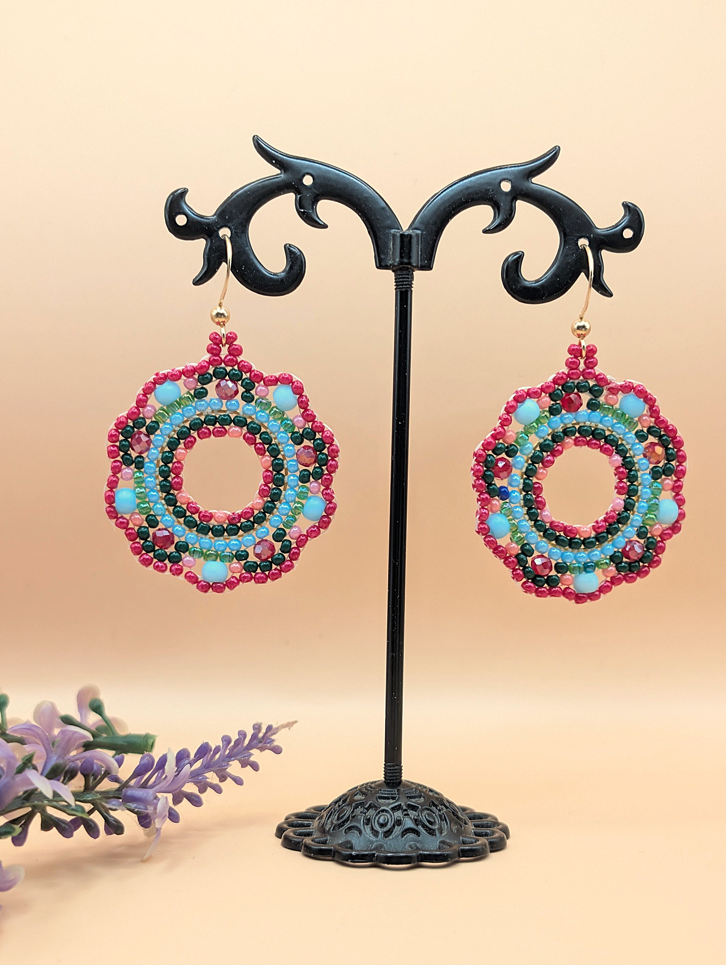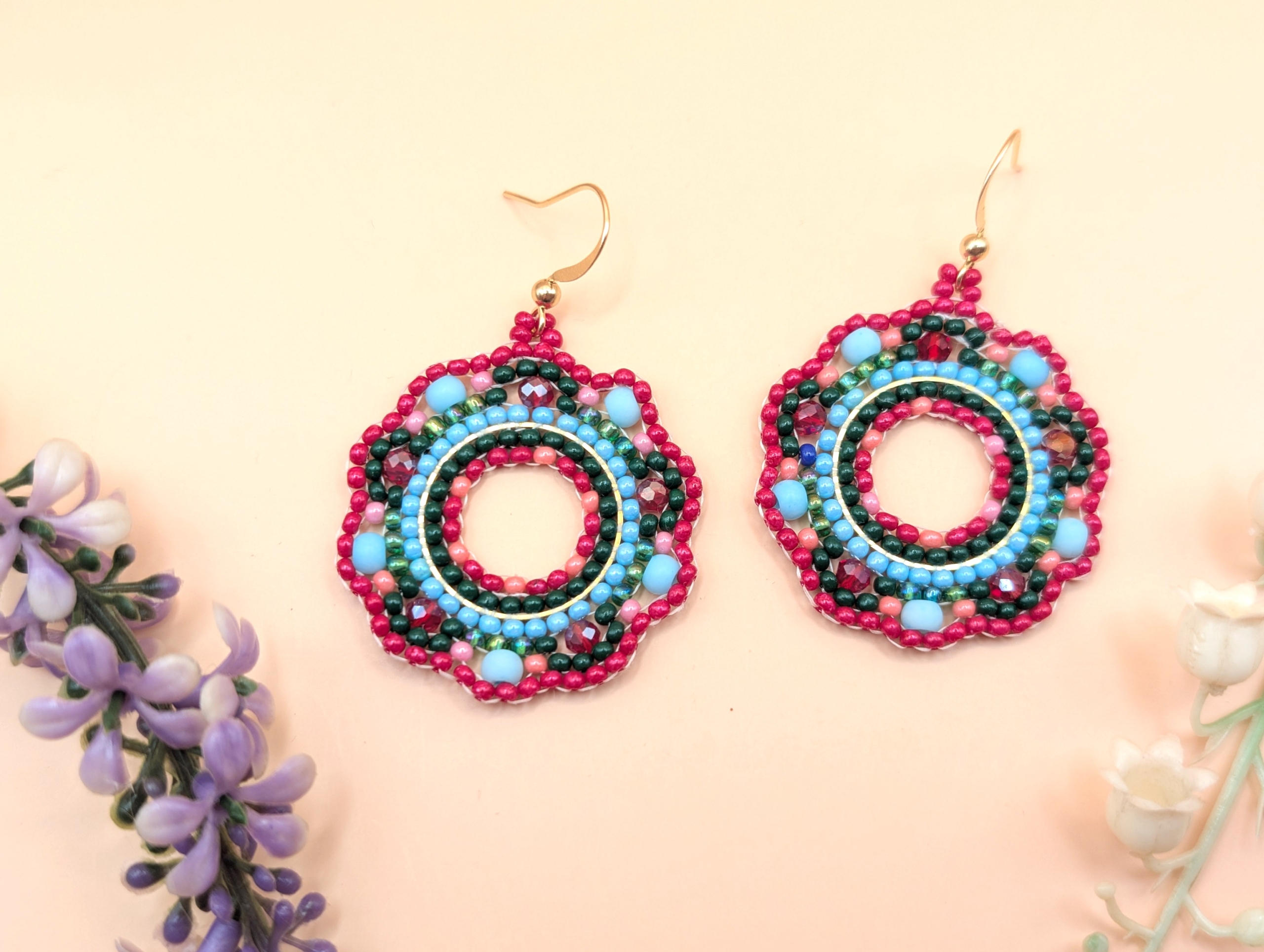 Boho Hängeohrringe aus Glasperlen in Rot/Blau/Gold, handmade