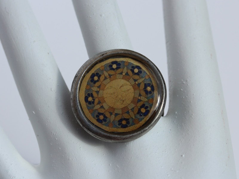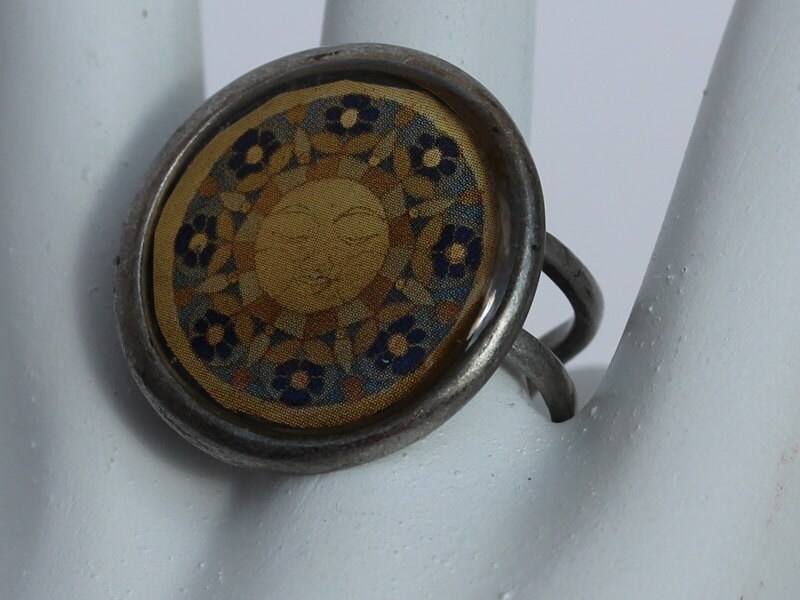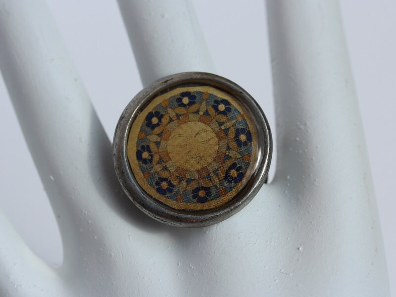 Das Sonnen Motiv ist von Hand eingearbeitet in einen antiksilberfarbenen Ring mit rundem Rahmen.