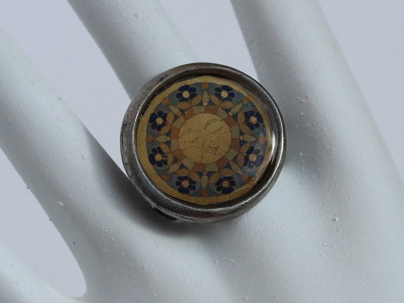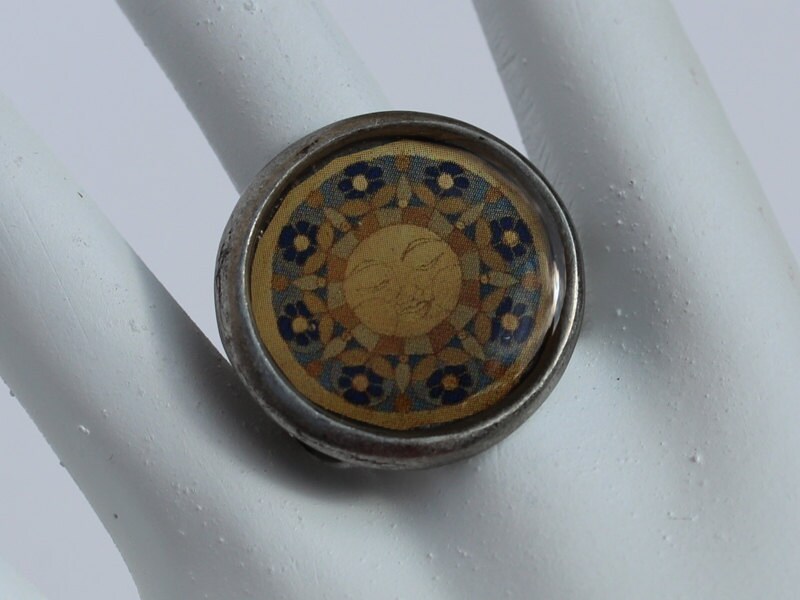 Der Ring ist aus altsilberfarbenem Metall, das Motiv unter Resinguss. Der Durchmesser des Rahmens beträgt 25 mm, und der Ring ist größenverstellbar.