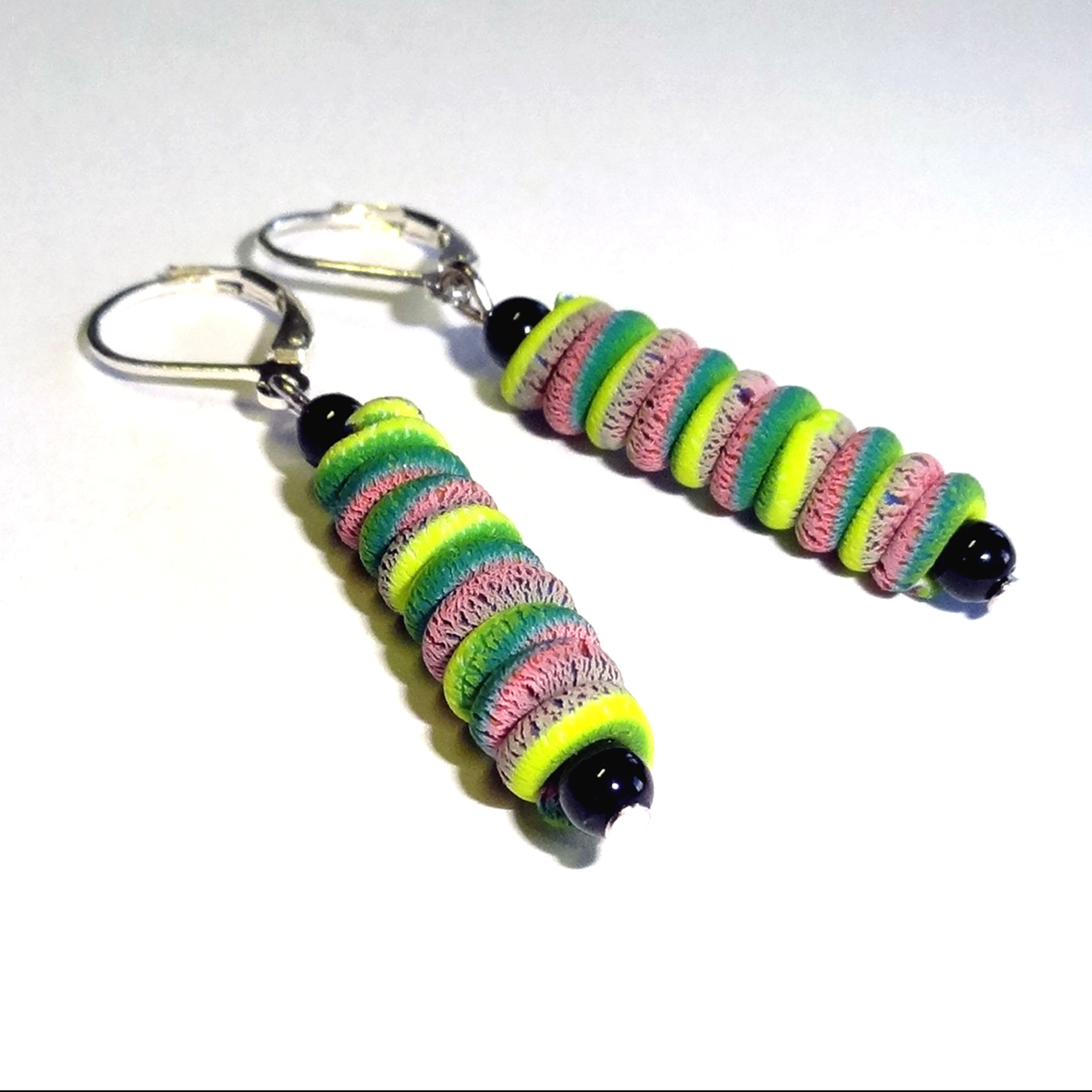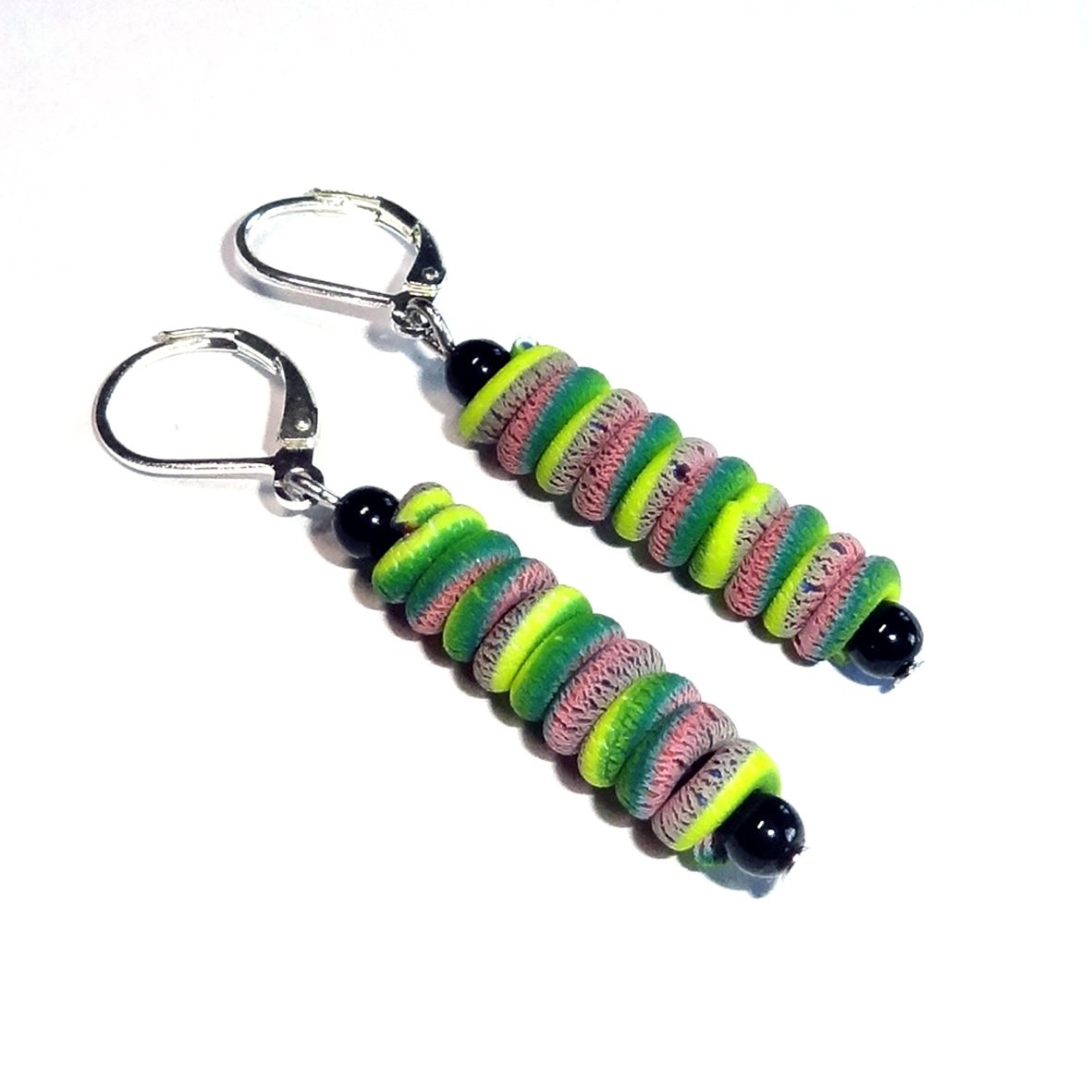 Diese farbenfrohen Ohrhänger sind entstanden, indem ich Fimo durch einen Extruder gepresst und anschließend die entstandenen Schnüre um einen Stab gewickelt und gebacken habe.