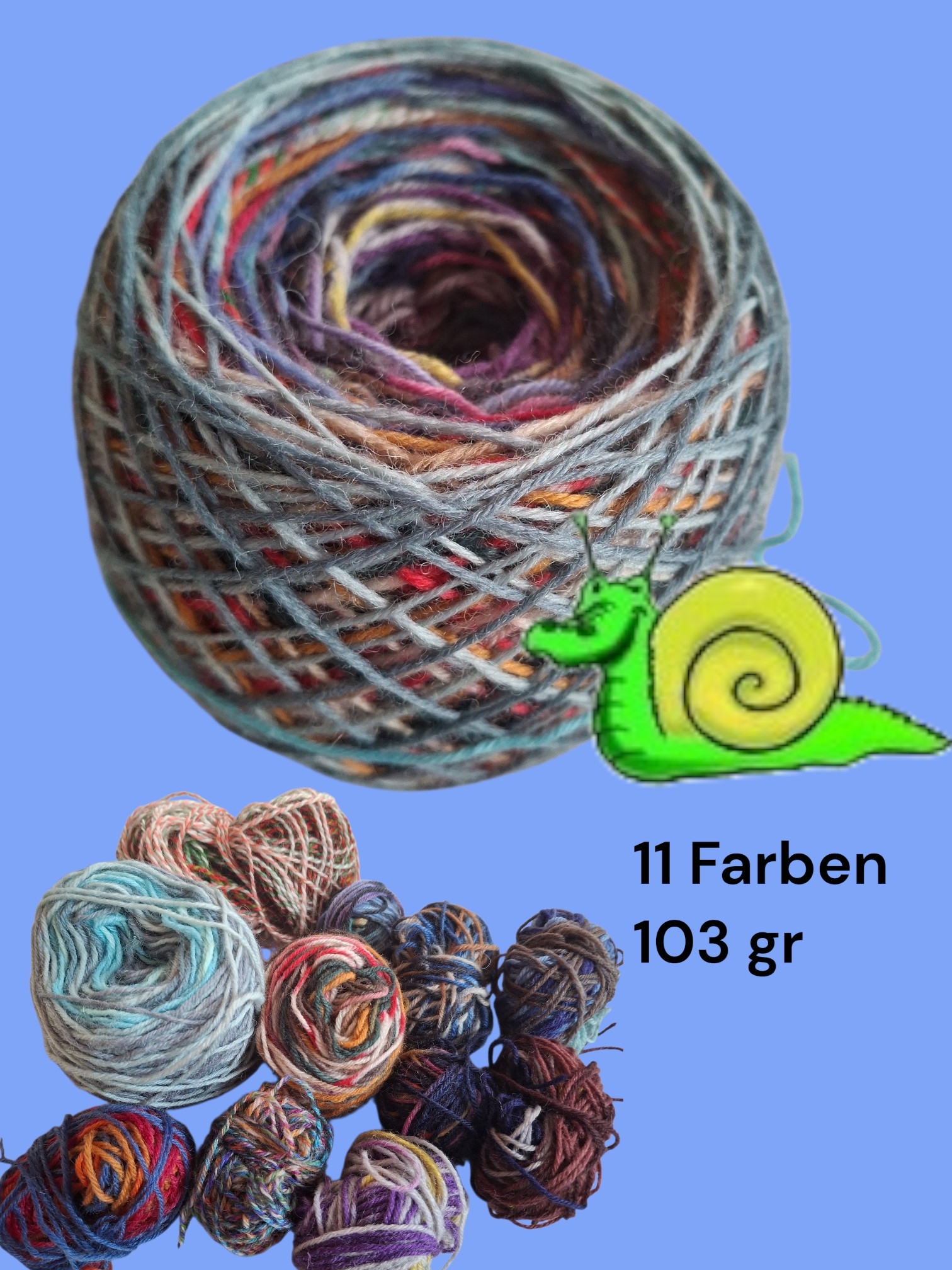 Du erhälst das hier abgebildete Garn - bestehend aus den gezeigten Wollresten. Jede Spleißverbindung wurde geprüft, damit sich nichts auflösen kann. Es können an den Enden sehr kleine Fädelchen entstehen, die sich beim Stricken jedoch wunderbar ins Bild einfügen. Die Sockenwolle ist Strickmaschinen geeignet - ich stricke selbst von Hand und auch mit einer CSM.