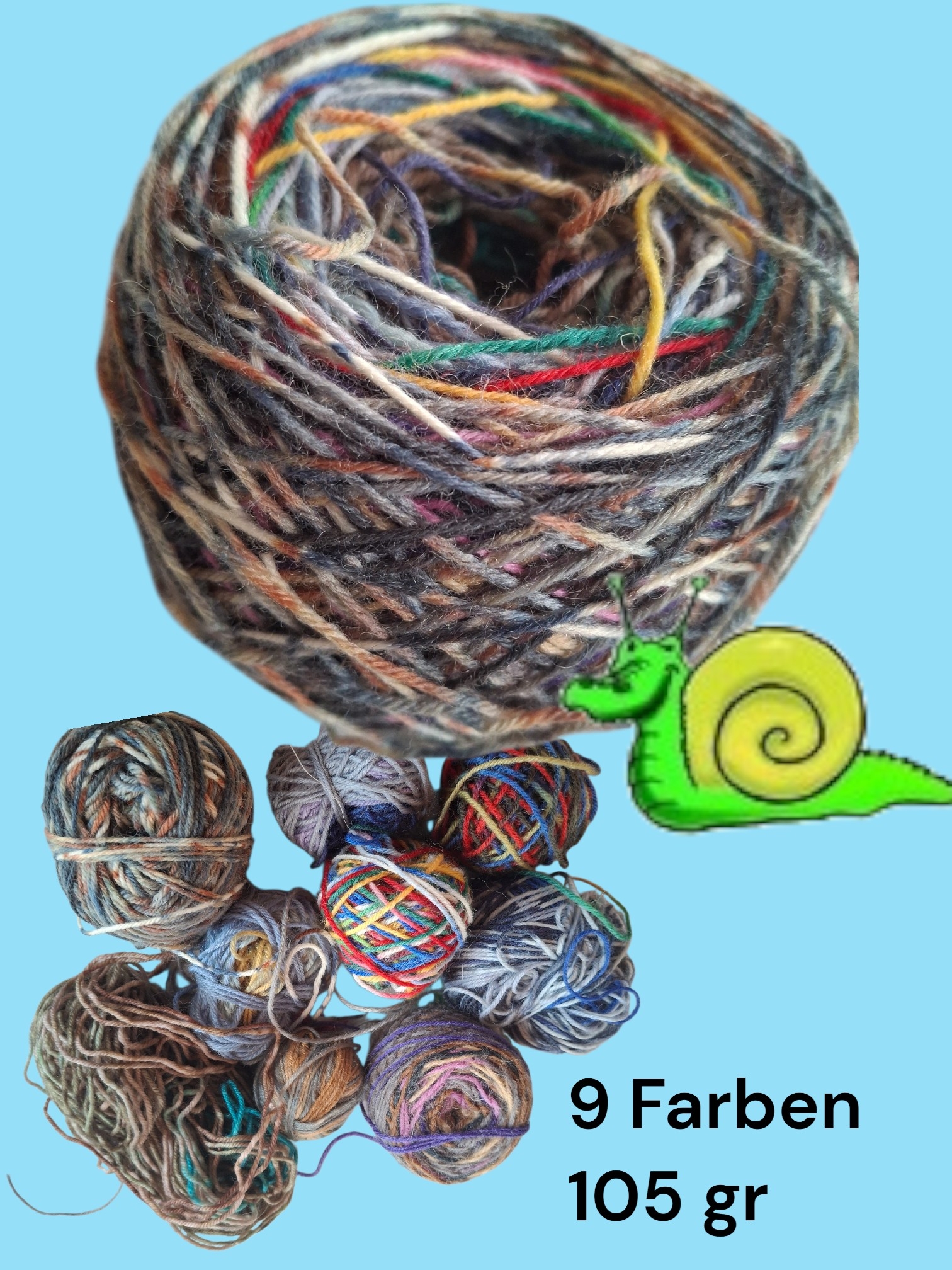 Du erhälst das hier abgebildete Garn - bestehend aus den gezeigten Wollresten. Jede Spleißverbindung wurde geprüft, damit sich nichts auflösen kann. Es können an den Enden sehr kleine Fädelchen entstehen, die sich beim Stricken jedoch wunderbar ins Bild einfügen. Die Sockenwolle ist Strickmaschinen geeignet - ich stricke selbst von Hand und auch mit einer CSM.
