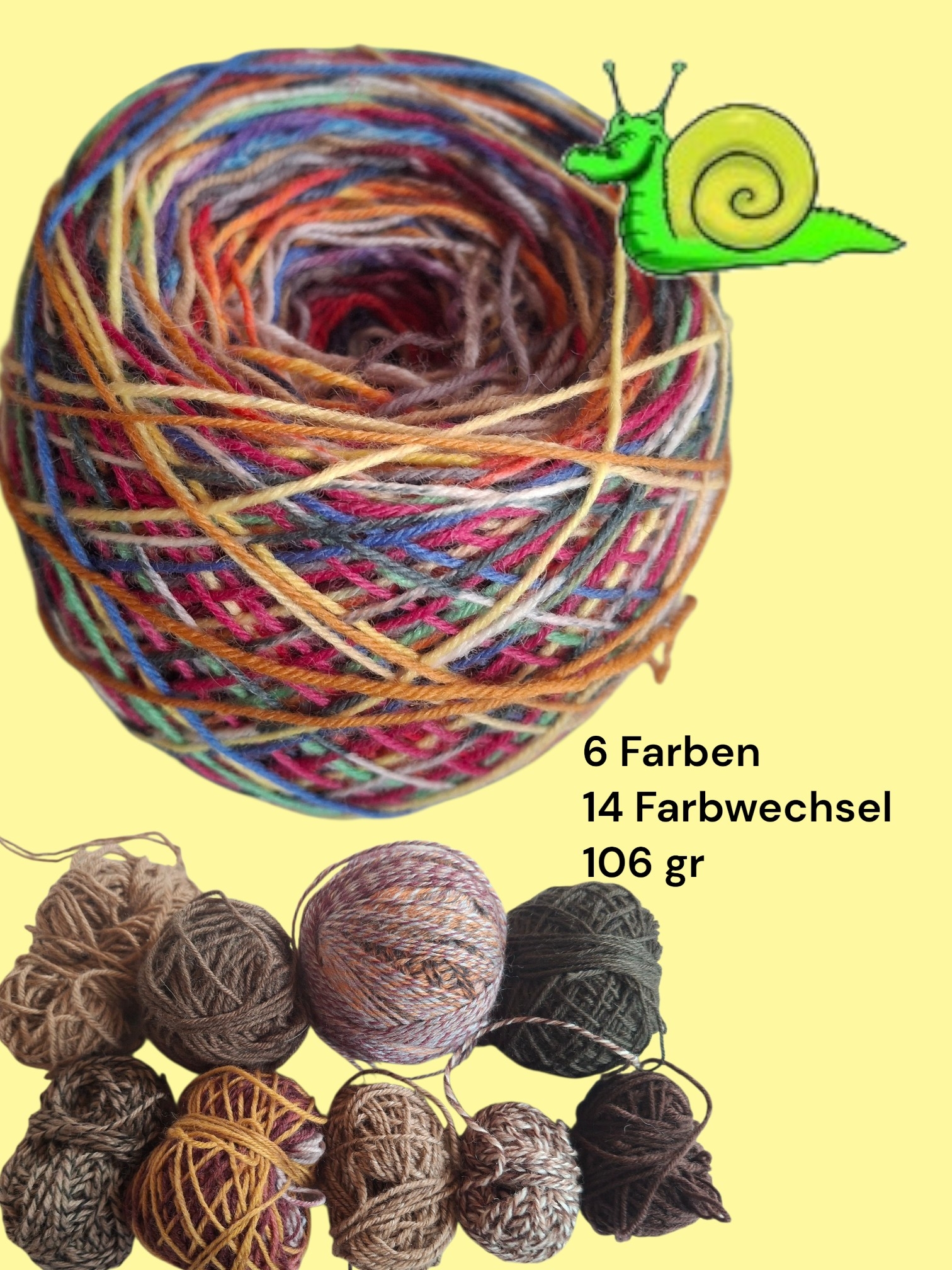 Du erhälst das hier abgebildete Garn - bestehend aus den gezeigten Wollresten. Jede Spleißverbindung wurde geprüft, damit sich nichts auflösen kann. Es können an den Enden sehr kleine Fädelchen entstehen, die sich beim Stricken jedoch wunderbar ins Bild einfügen. Die Sockenwolle ist Strickmaschinen geeignet - ich stricke selbst von Hand und auch mit einer CSM.
