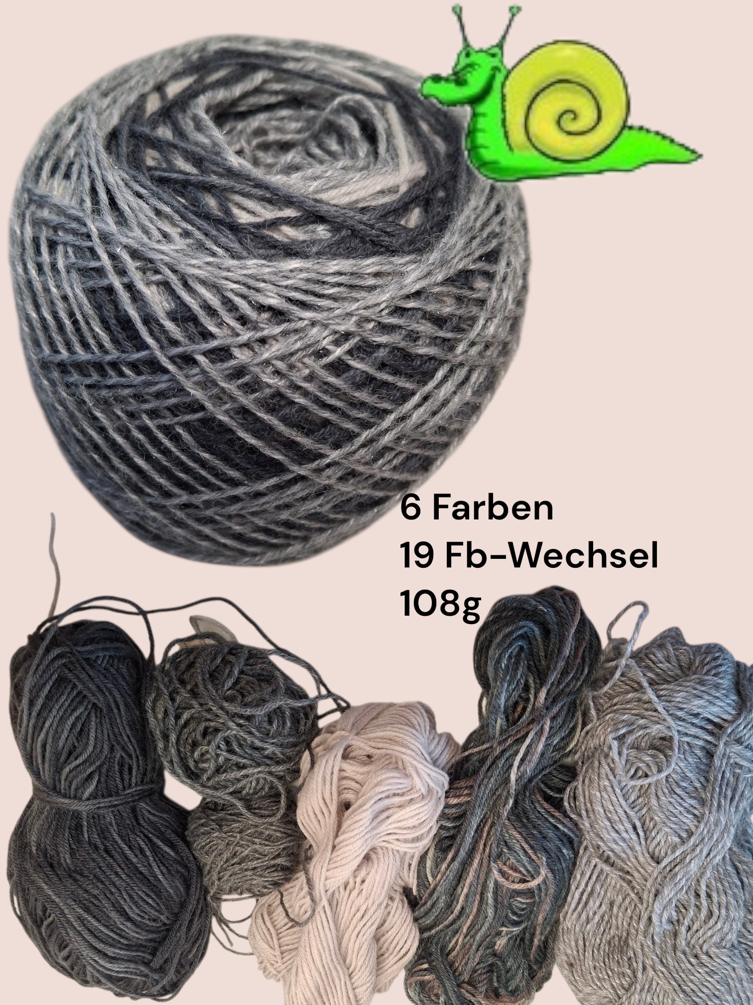 Du erhälst das hier abgebildete Garn - bestehend aus den gezeigten Wollresten. Jede Spleißverbindung wurde geprüft, damit sich nichts auflösen kann. Es können an den Enden sehr kleine Fädelchen entstehen, die sich beim Stricken jedoch wunderbar ins Bild einfügen. Die Sockenwolle ist Strickmaschinen geeignet - ich stricke selbst von Hand und auch mit einer CSM.