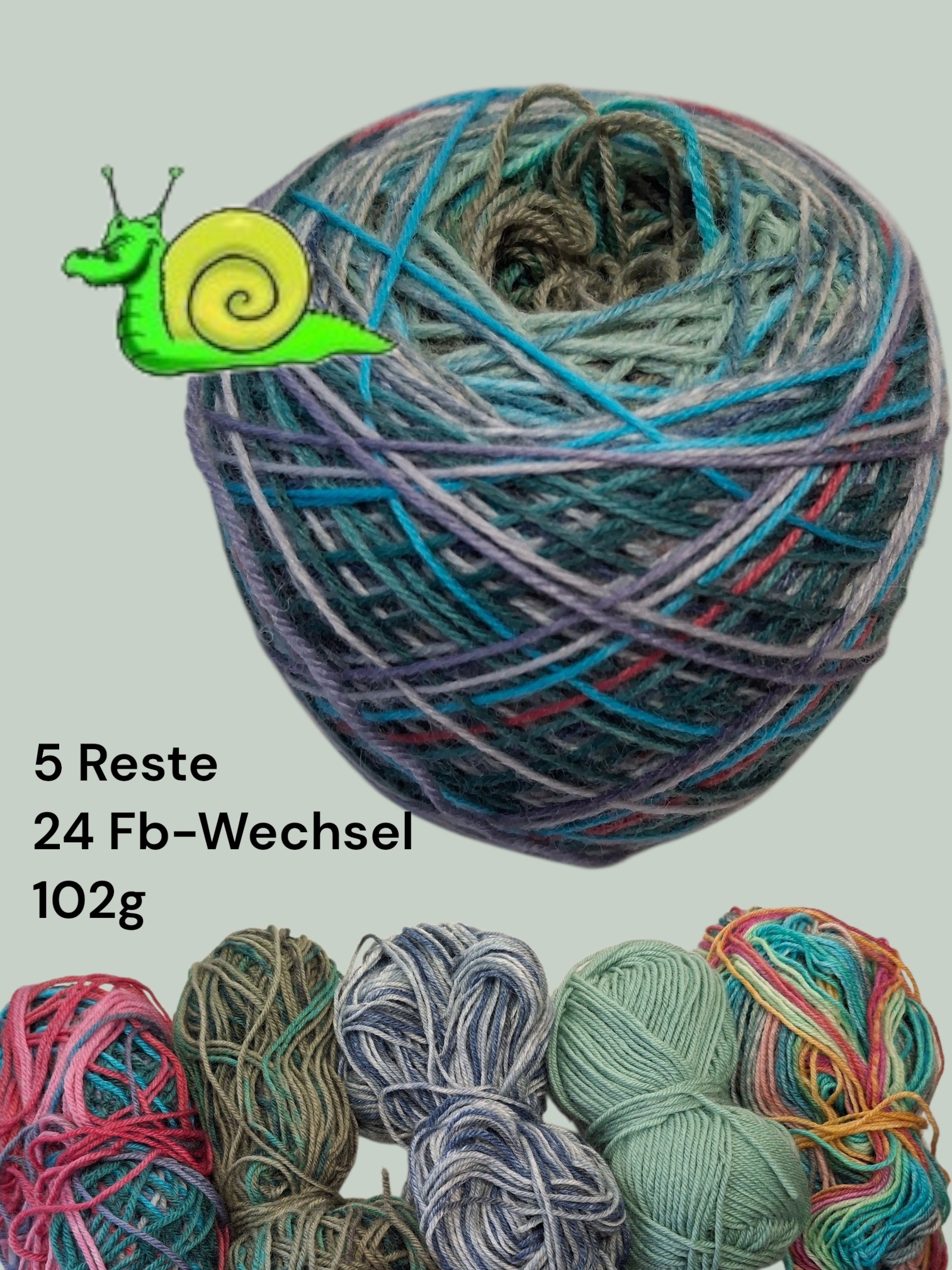 Du erhälst das hier abgebildete Garn - bestehend aus den gezeigten Wollresten. Jede Spleißverbindung wurde geprüft, damit sich nichts auflösen kann. Es können an den Enden sehr kleine Fädelchen entstehen, die sich beim Stricken jedoch wunderbar ins Bild einfügen. Die Sockenwolle ist Strickmaschinen geeignet - ich stricke selbst von Hand und auch mit einer CSM.