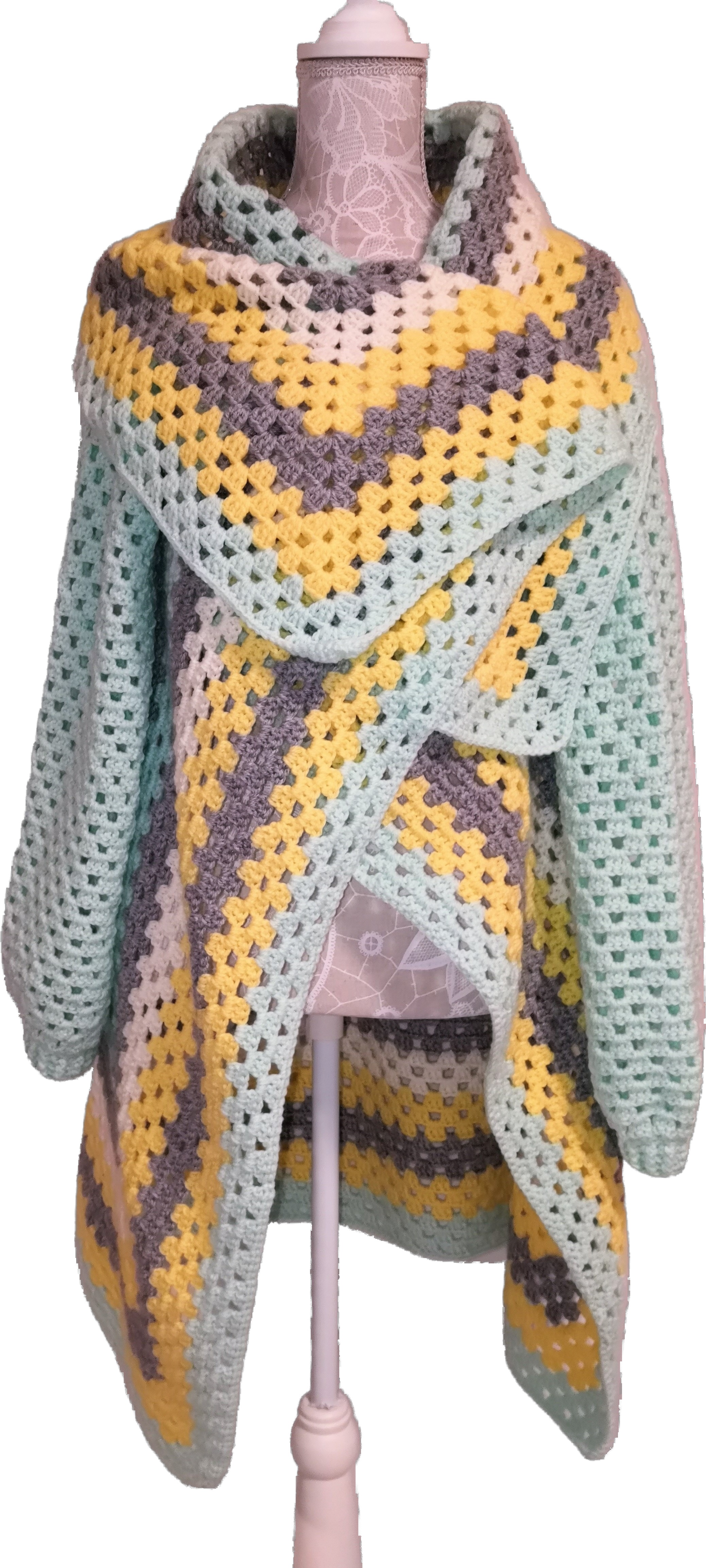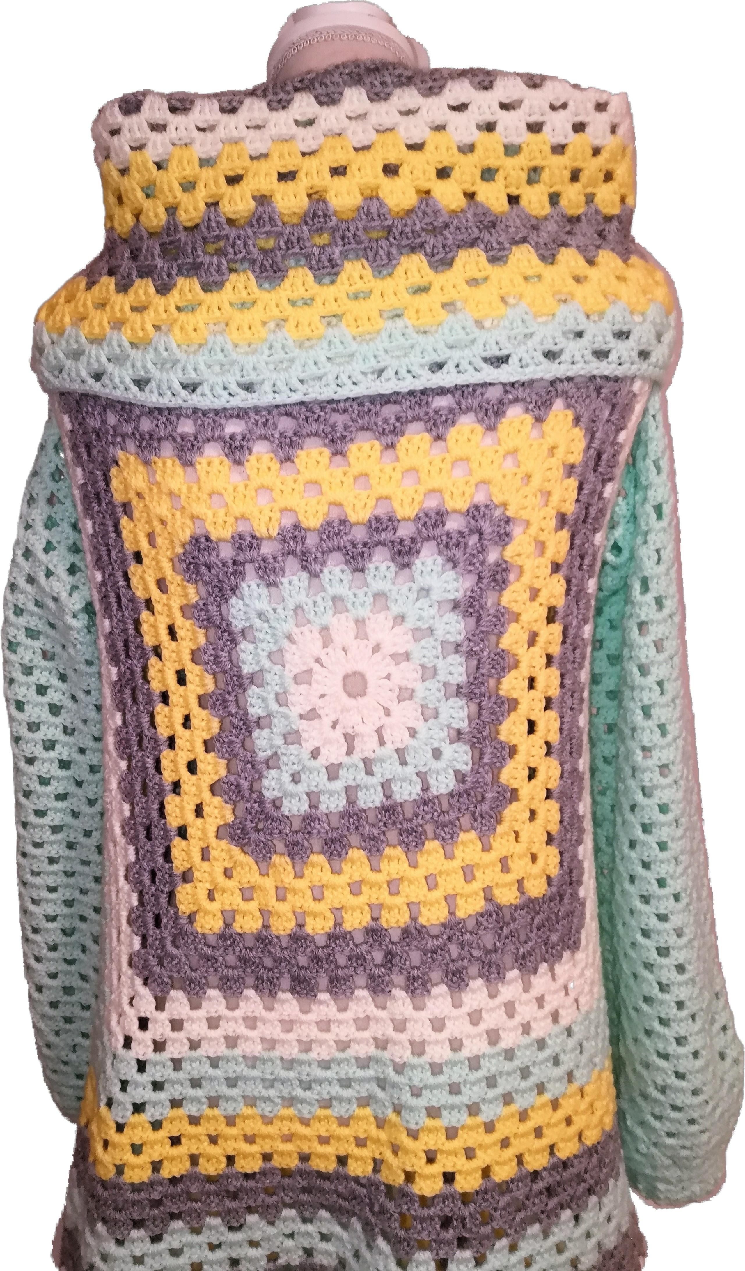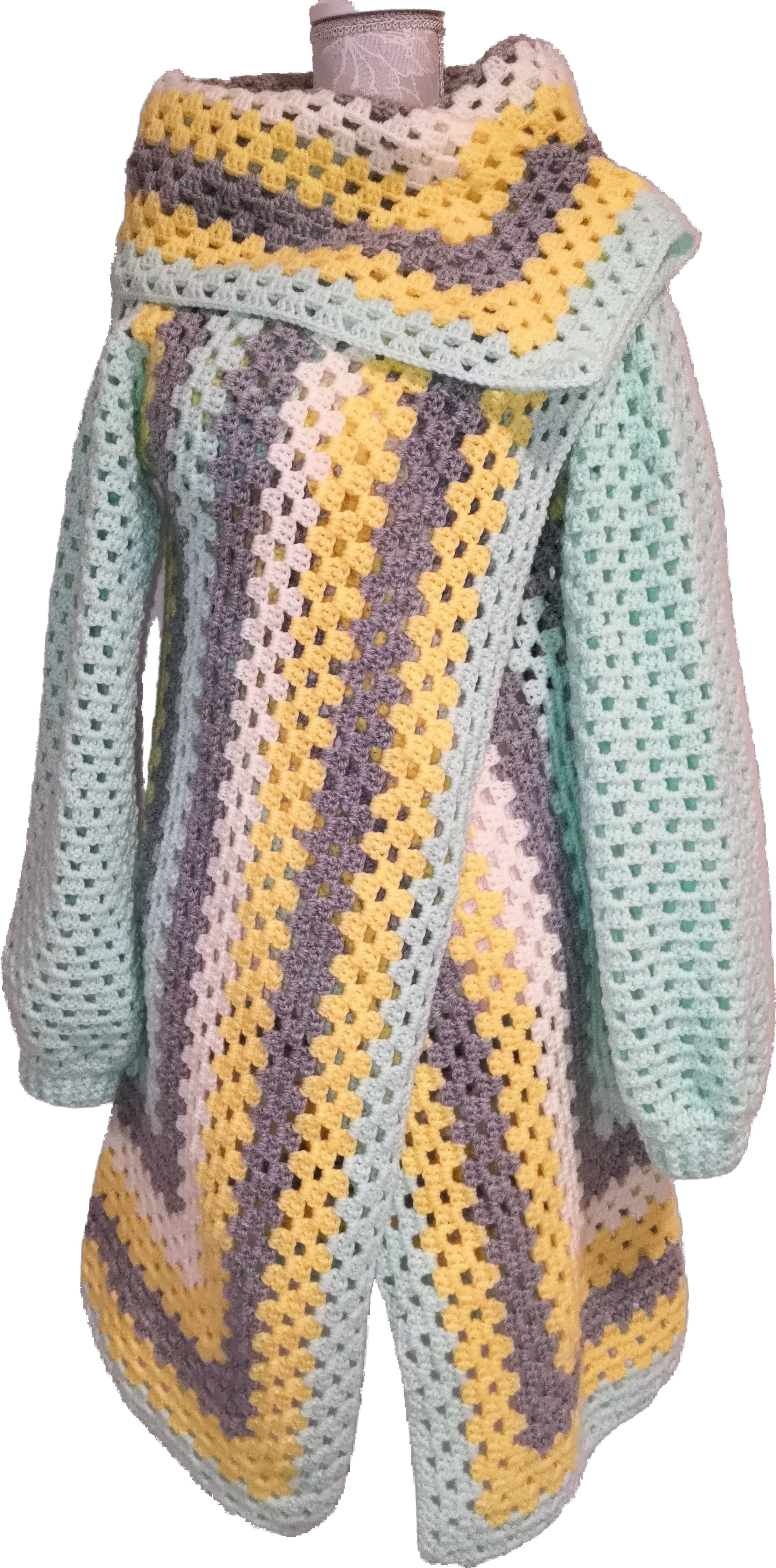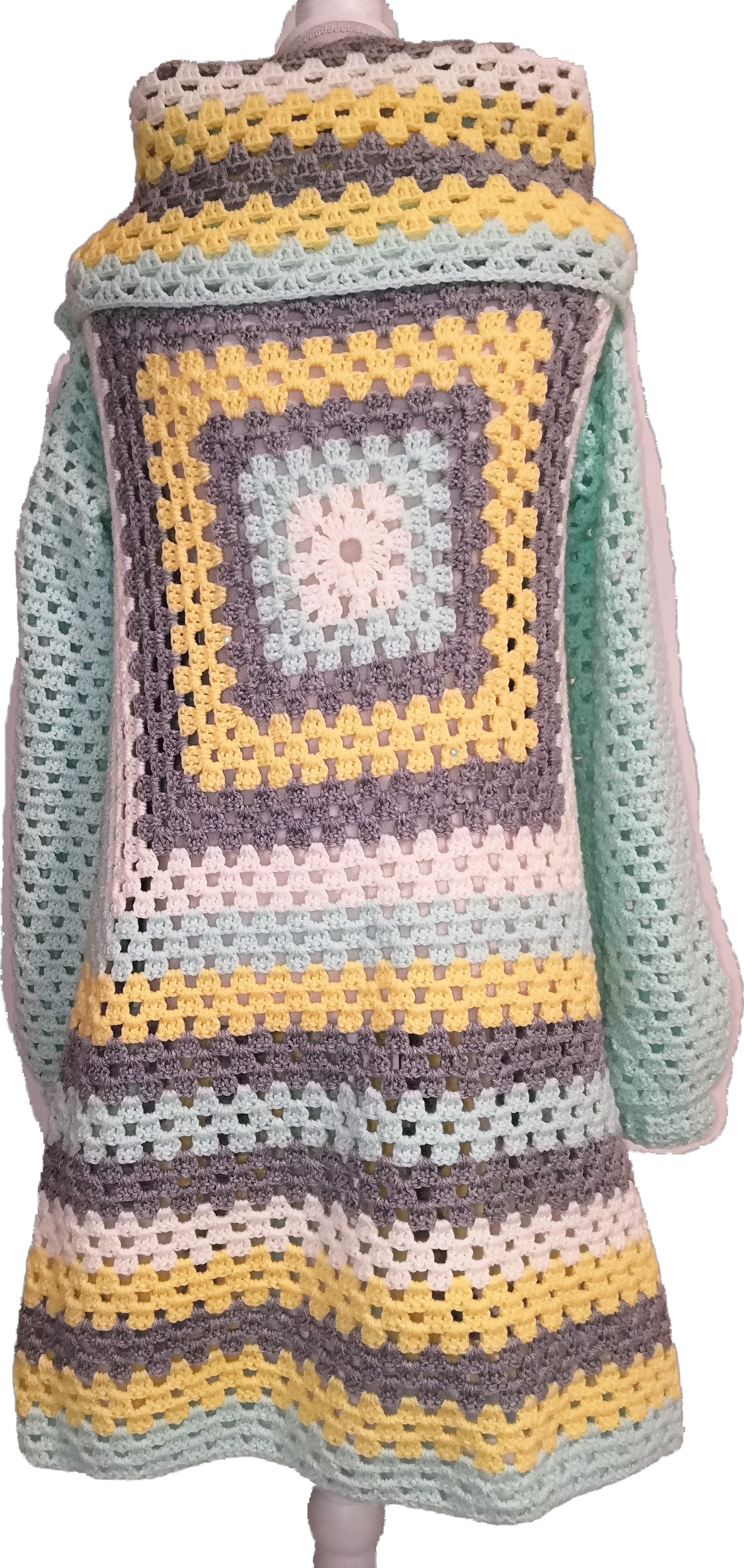 Handgefertigter Cardigan – Granny-Square-Style in Hellgrau, Creme, Gelb und Mint