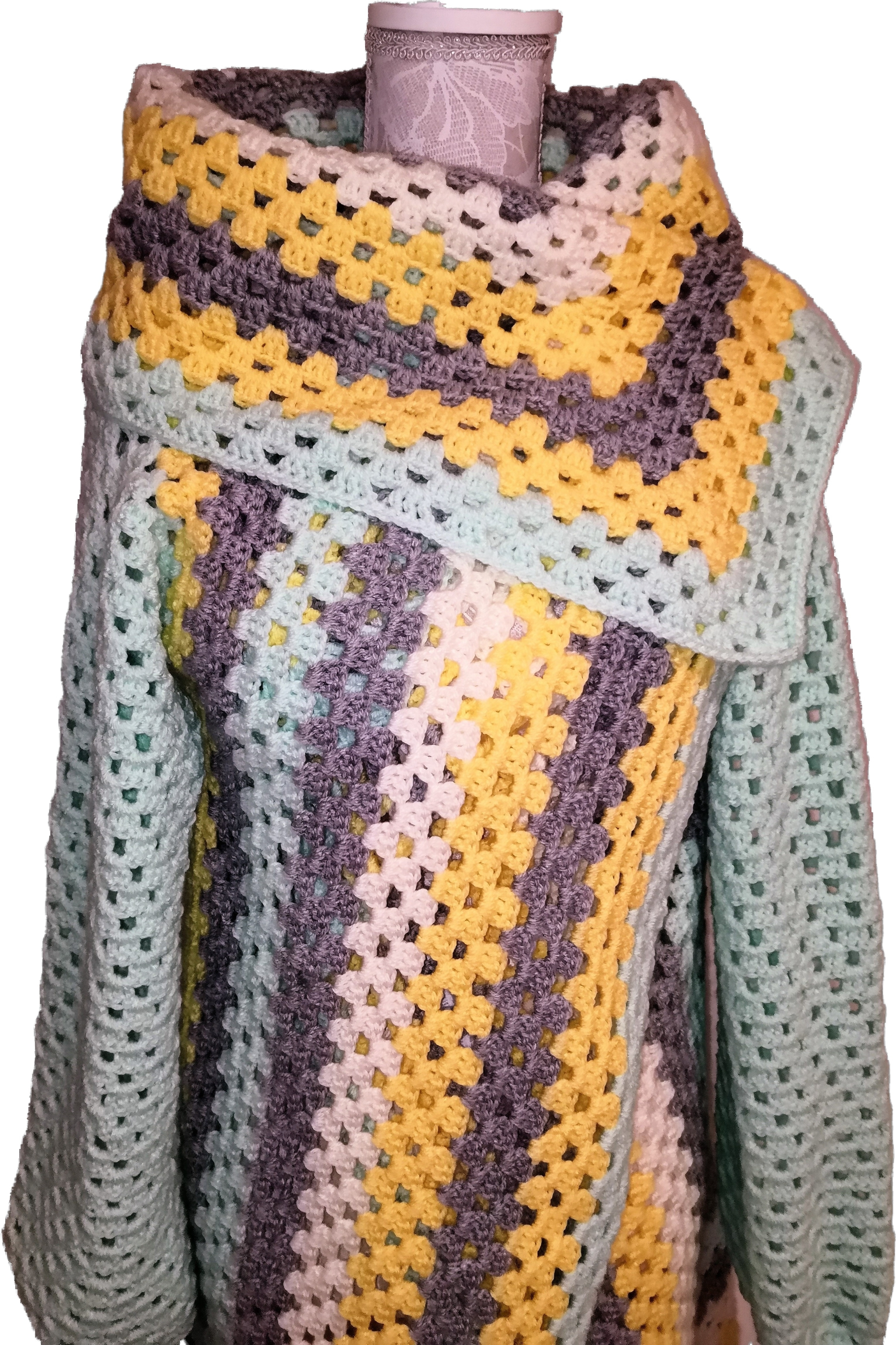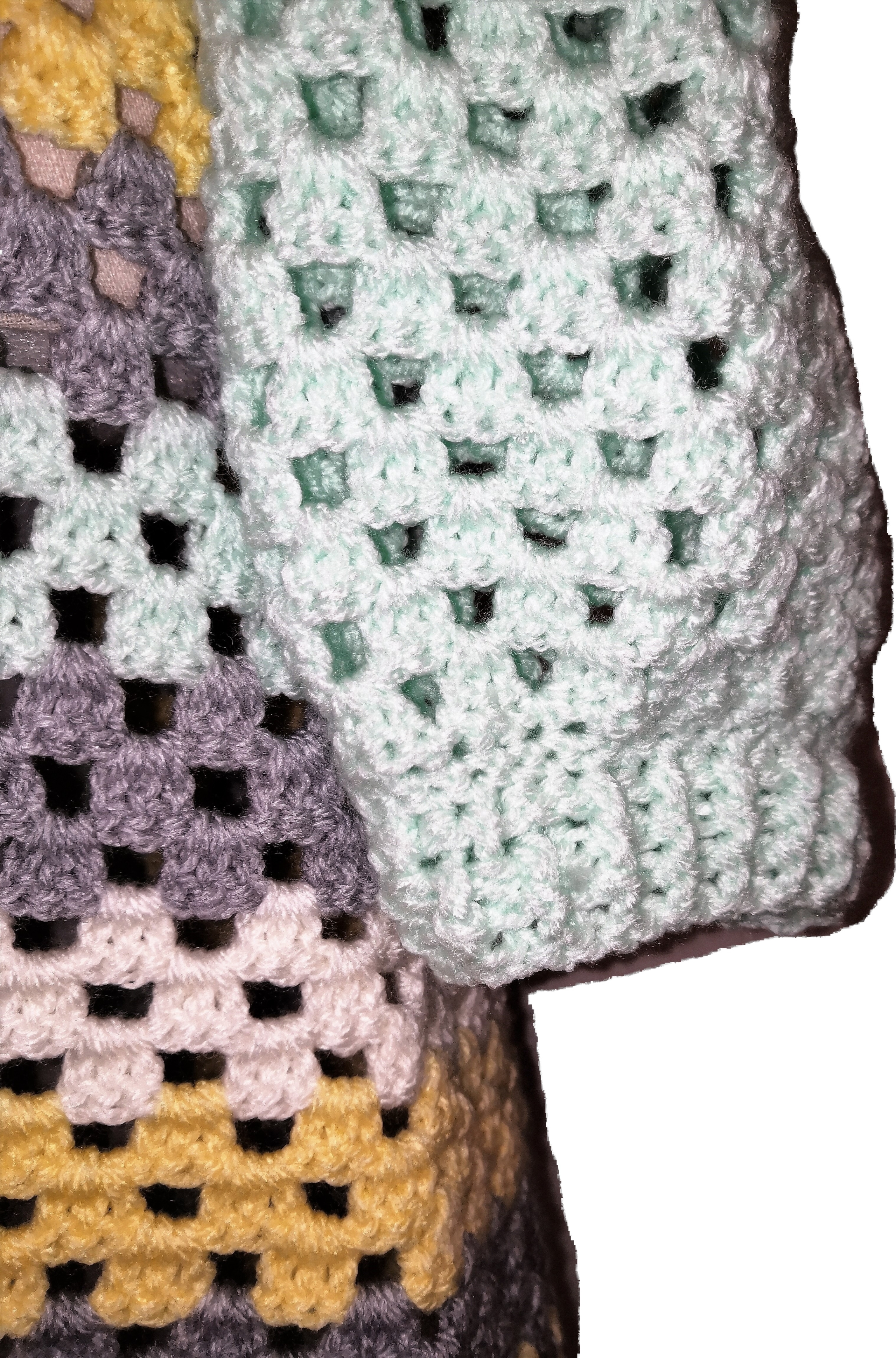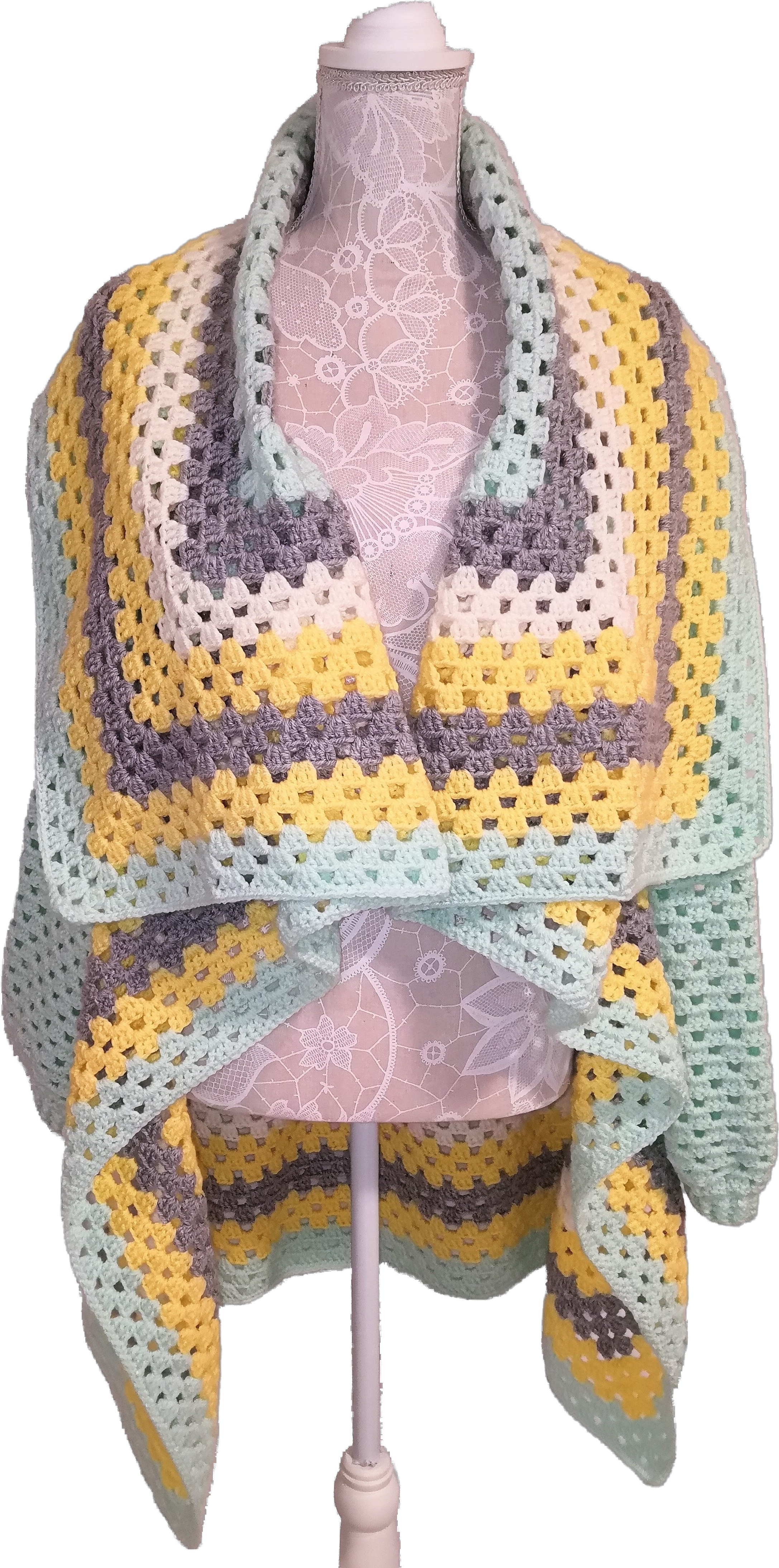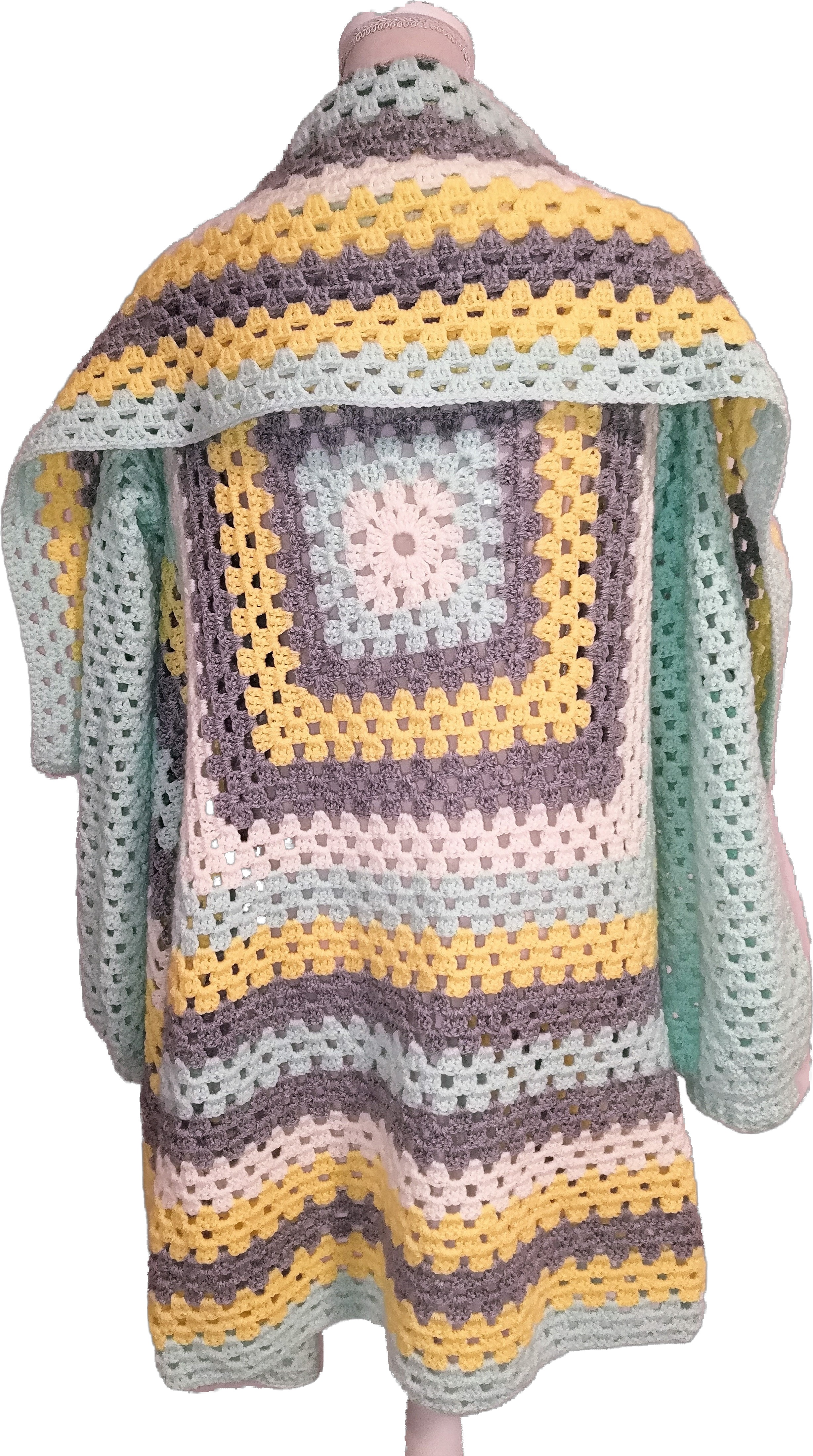 Handgefertigter Cardigan – Granny-Square-Style in Hellgrau, Creme, Gelb und Mint