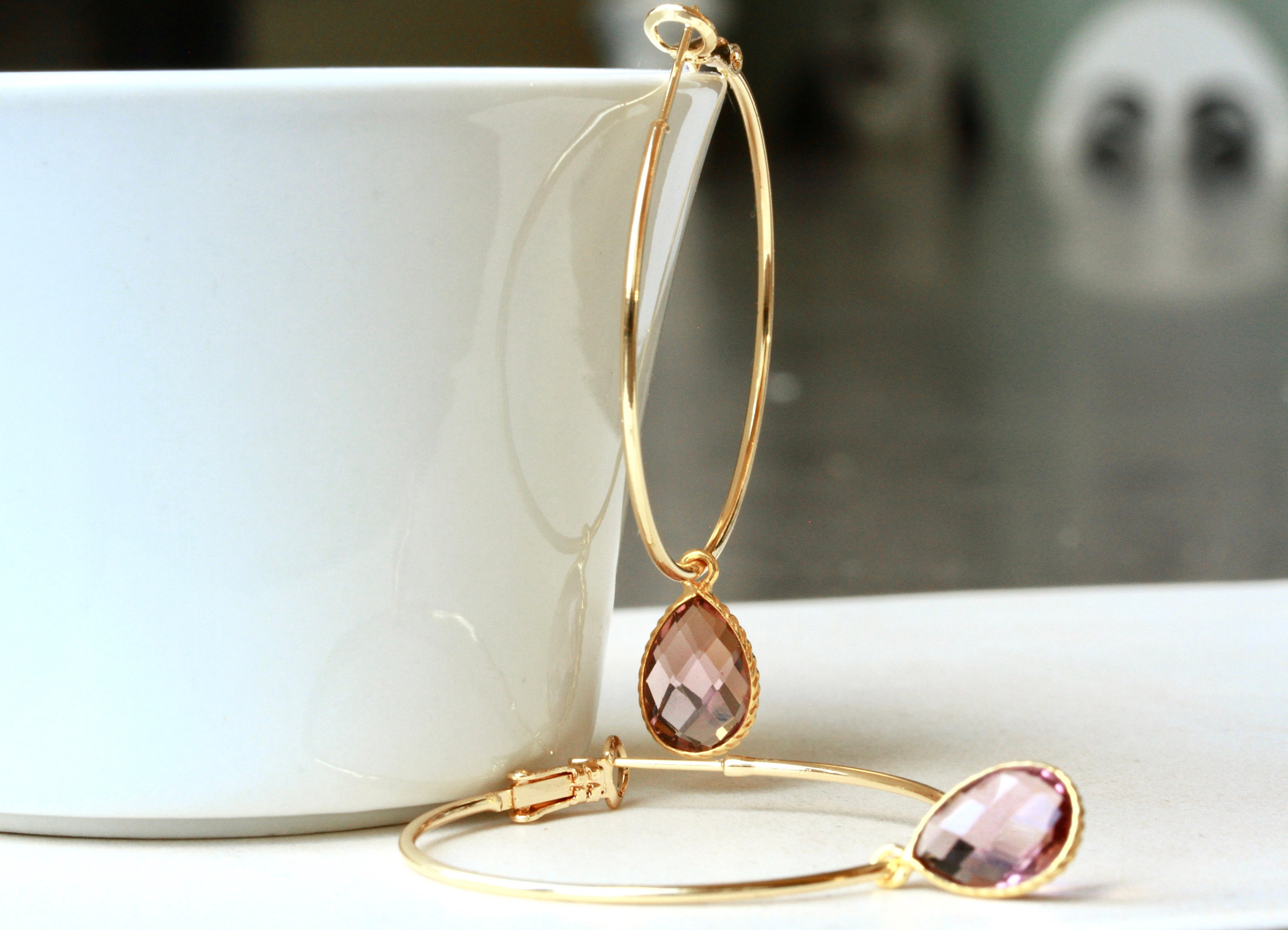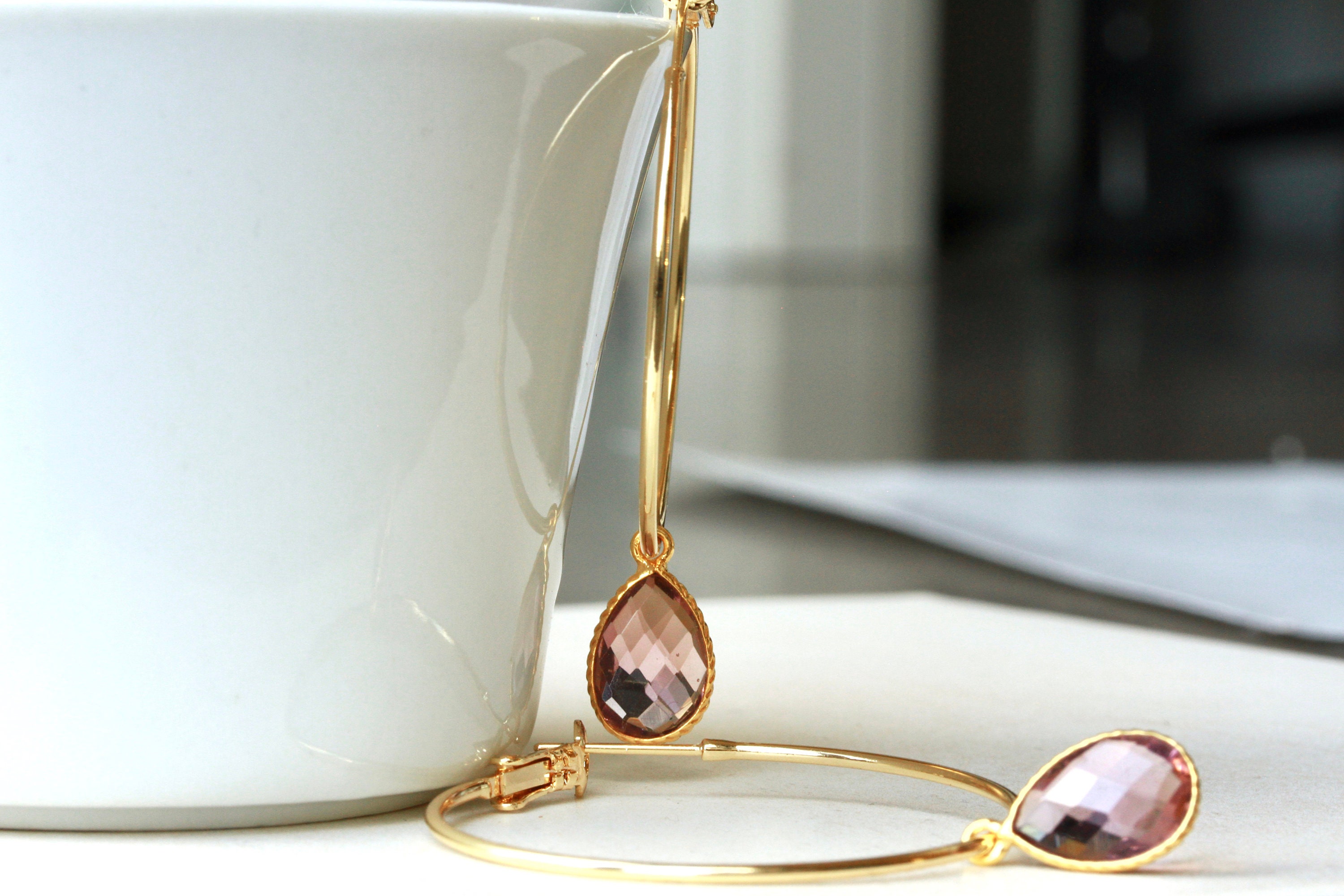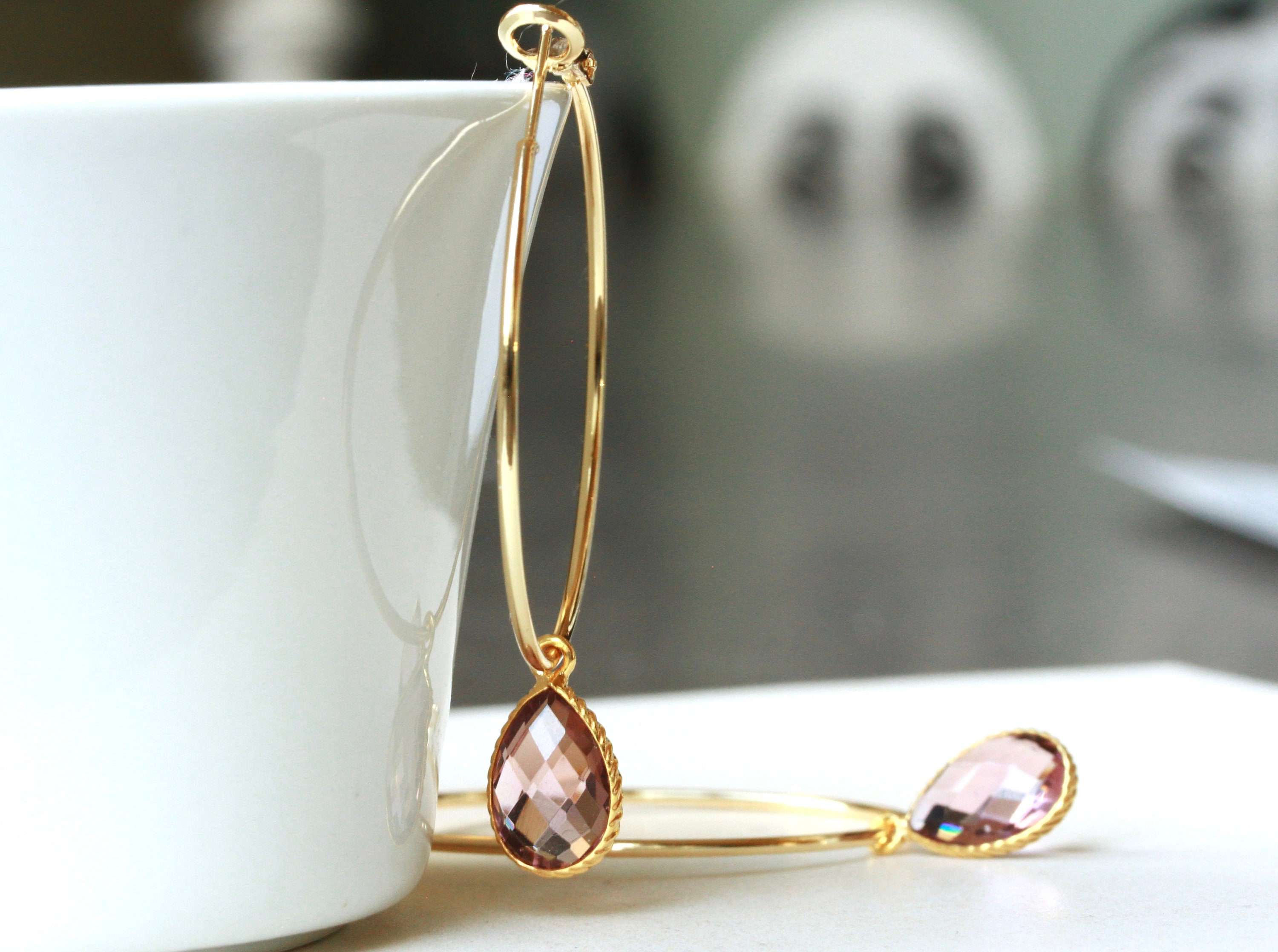 An echt vergoldeten großen Creolen baumelt jeweils in einer handgefertigten Fassung, ein fein facettierter Morganit. Die Creole ist wie ein Ohrstecker einfach durch das Ohrloch zu fädeln.