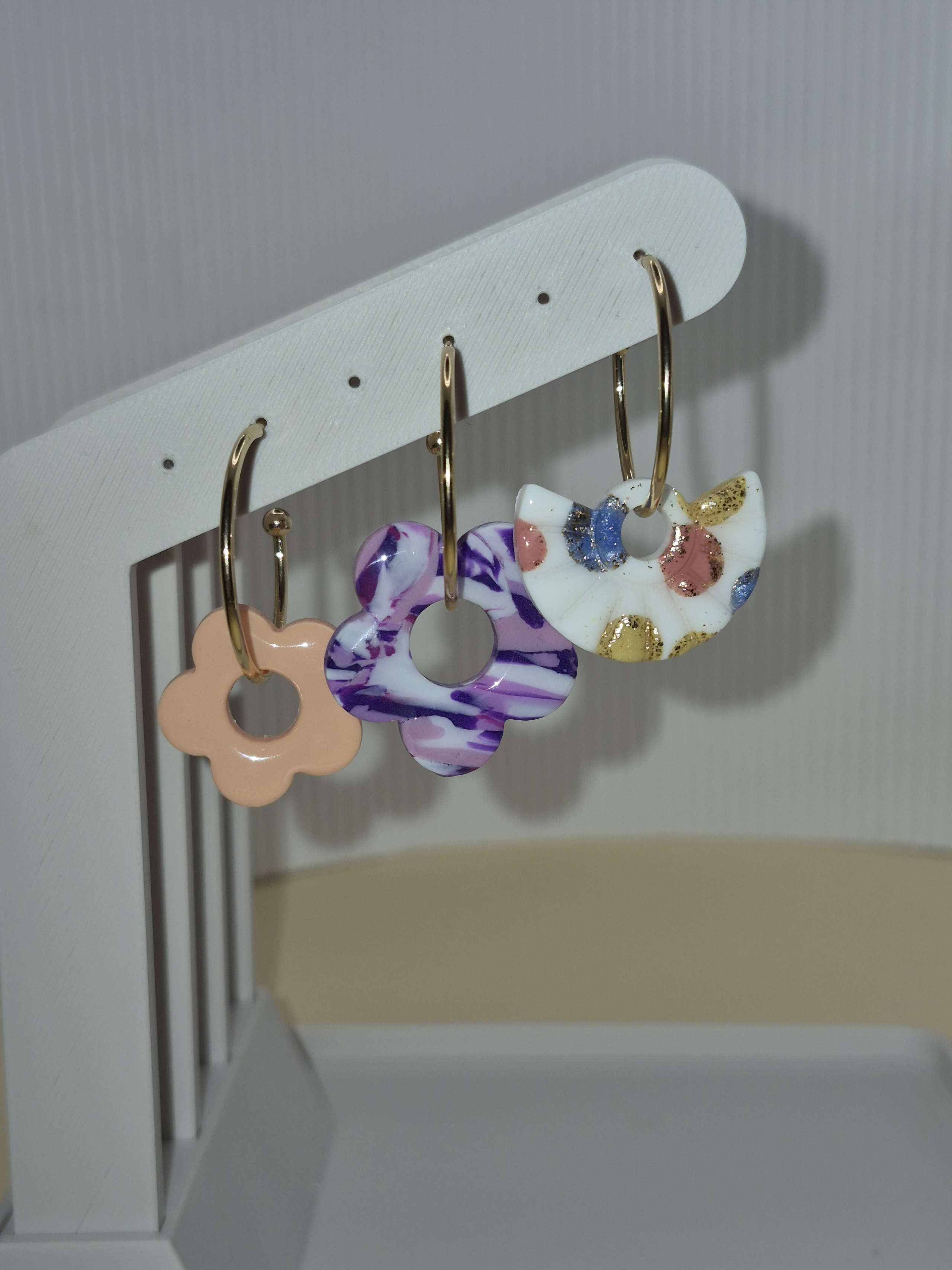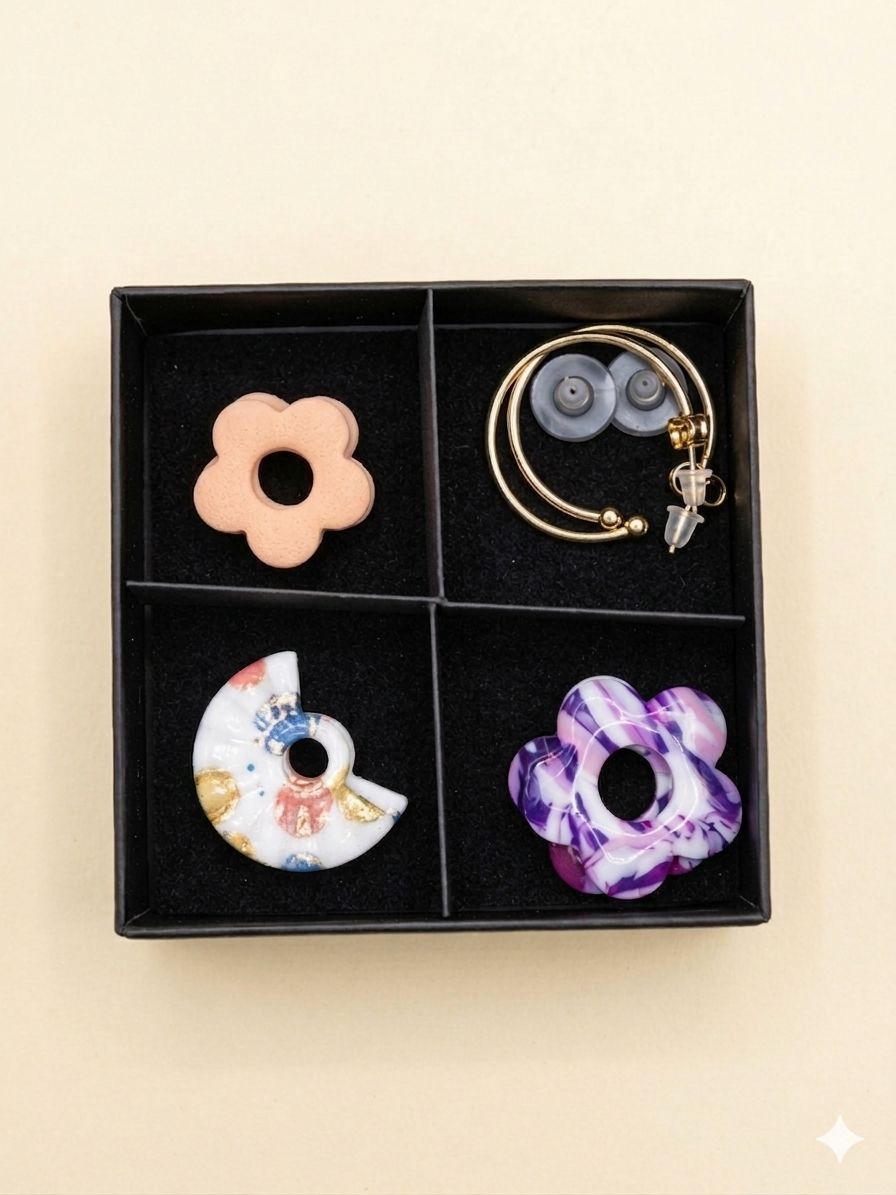 Hole dir die volle Portion Abwechslung! Mit meinem handgestalteten Creolen-Set erhältst du ein Paar klassische, goldfarbene Creolen aus Edelstahl und drei Paar verschiedene Anhänger zum einfachen Austauschen.