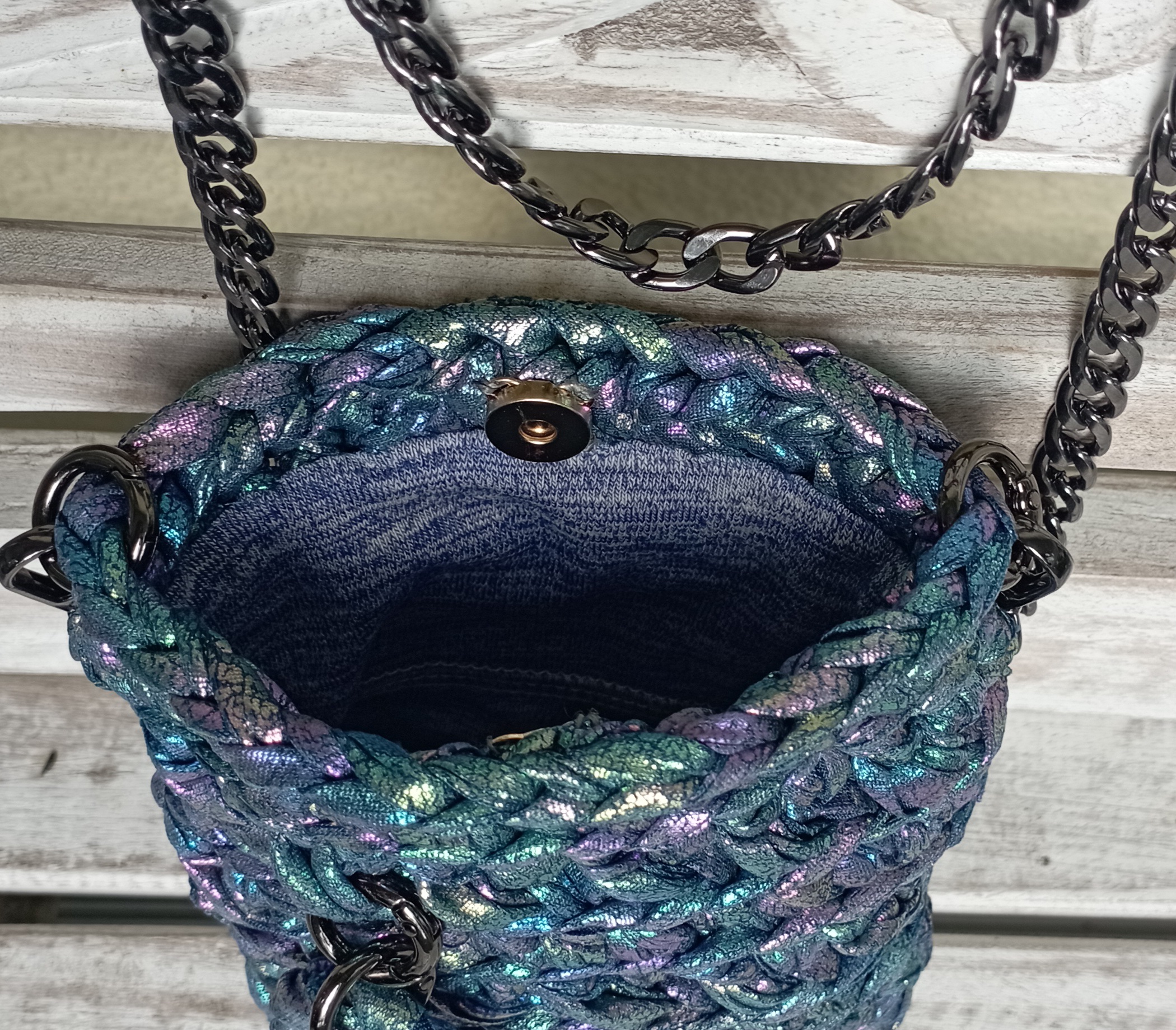 - Blaues Innenfutter aus Jerseystoff, handeingenäht, mit Magnetverschluss