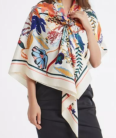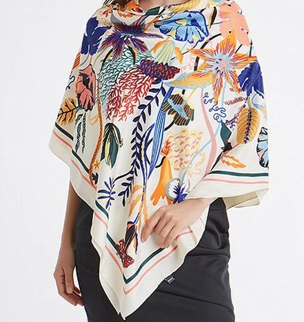 Das Design stammt von der Künstlerin Irina Pavlovica und wurde zusammen mit anderen für einen kleinen Familienbetrieb dort entworfen. Die Größe des Schals beträgt 130 x 130 cm. Der Grundton ist Blumen bunt. Material: 100% Seide / Silk mit Etikett. Produktart: ein quadratischer Schal, mehrfarbig, pflegeleicht, Handwäsche, elegant und trendy.