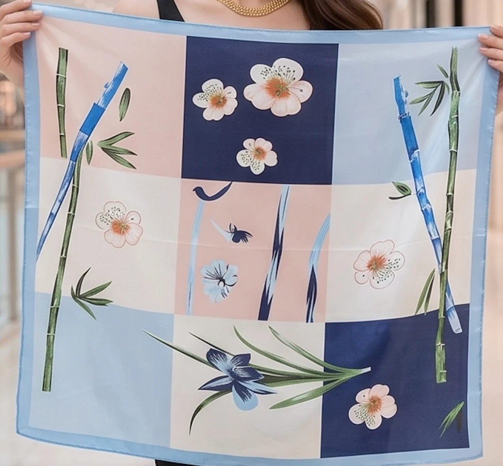 Das Design dieses Schals stammt von der Künstlerin Valentina Lubow und wurde zusammen mit anderen für einen kleinen Familienbetrieb dort entworfen. Die Größe des Schals beträgt 90 x 90 cm. Der Grundton ist blau-bunt. Gewebeart: Satin. Produktart: ein quadratischer Schal, mehrfarbig, pflegeleicht, Handwäsche, elegant und trendy.