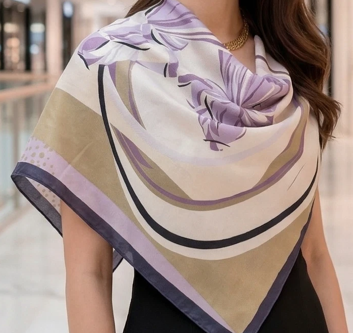 Das Design dieses Schals stammt von der Künstlerin Valentina Lubow und wurde zusammen mit anderen für einen kleinen Familienbetrieb dort entworfen. Die Größe des Schals beträgt 90 x 90 cm. Der Grundton ist lila Blumen. Gewebeart: Satin. Produktart: ein quadratischer Schal, mehrfarbig, pflegeleicht, Handwäsche, elegant und trendy.