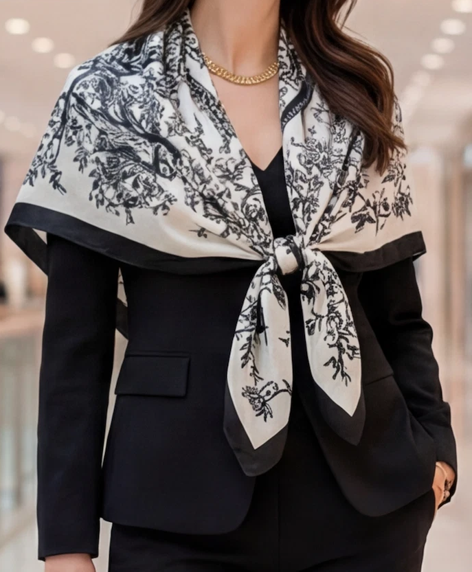 Das Design dieses Schals stammt von der Künstlerin Valentina Lubow und wurde zusammen mit anderen für einen kleinen Familienbetrieb dort entworfen. Die Größe des Schals beträgt 90 x 90 cm. Der Grundton ist weiss-schwarz mit Blättern. Gewebeart: Satin. Produktart: ein quadratischer Schal, mehrfarbig, pflegeleicht, Handwäsche, elegant und trendy.