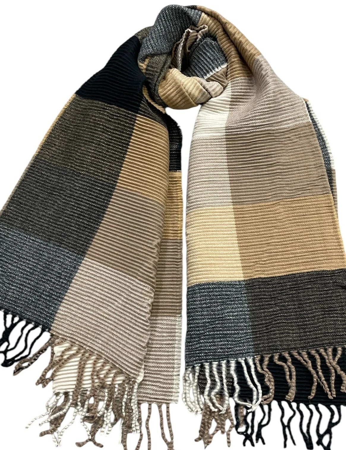 Dieser Damen-Herren Baumwoll-Karo-Winterschal, Ripp-Struktur, neu, mit Fransen ist schwarz-braun im Karomuster und aus der Kollektion 2025/2026, super-soft!