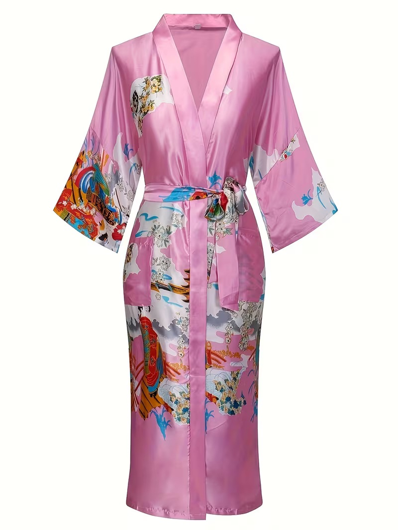 Dieser neue Damen-Kimono - Handarbeit - mit klassischem japanischem Motiv, rosa, ist bodenlang und neu.