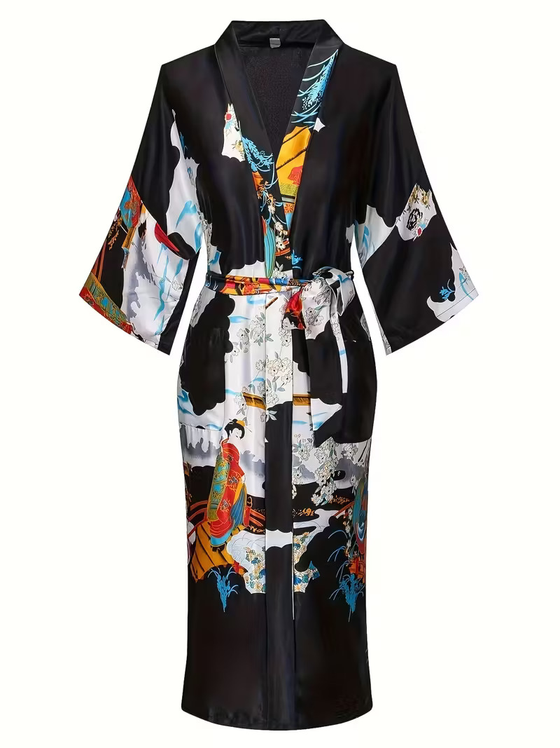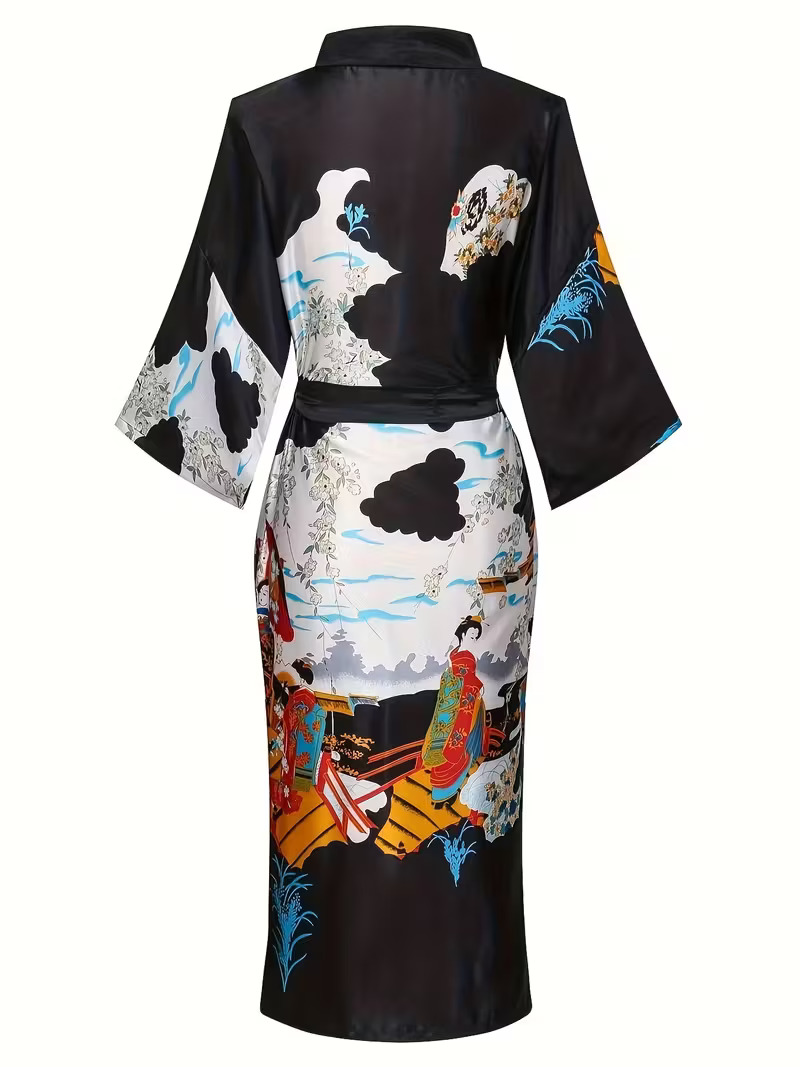 Dieser neue Damen-Kimono - Handarbeit - mit klassischem japanischem Motiv, schwarz, ist bodenlang und neu.