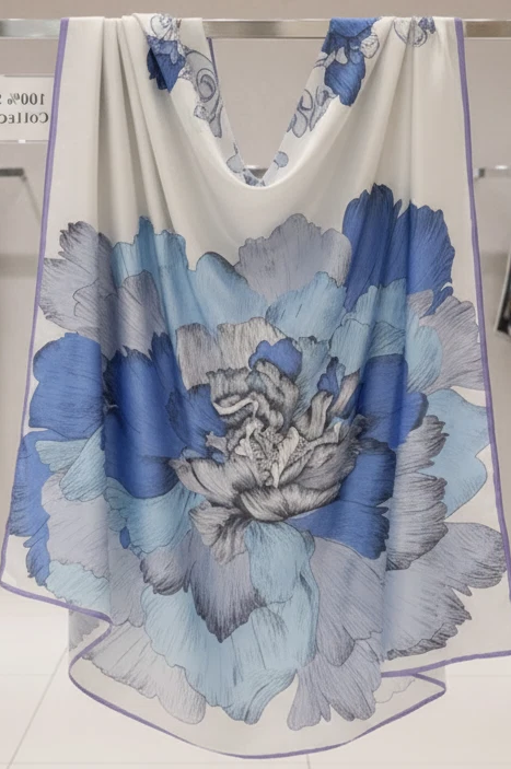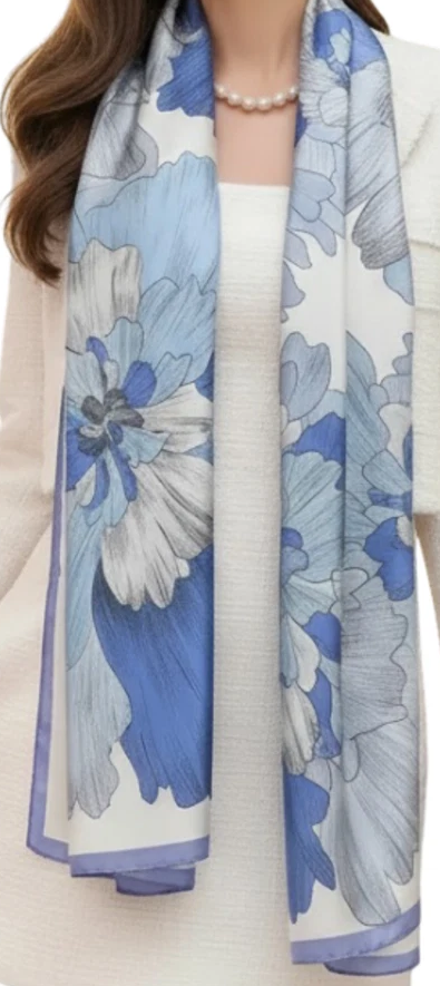 Das Design dieses Schals stammt von der Künstlerin I Konokovskaya und wurde zusammen mit anderen für einen kleinen Familienbetrieb dort entworfen. Die Größe des Schals beträgt 180 x 90 cm. Der Grundton ist hellblau-weiss. Material: Seide / Silk mit Etikett. Produktart: ein rechteckiger Schal, mehrfarbig, pflegeleicht, Handwäsche, elegant und trendy..