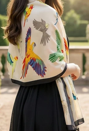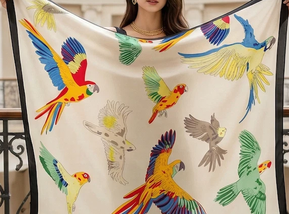Das Design dieses Schals stammt von der Künstlerin I Konokovskaya und wurde zusammen mit anderen für einen kleinen Familienbetrieb dort entworfen. Die Größe des Schals beträgt 180 x 90 cm. Der Grundton ist bunt mit Papagei. Material: Seide / Silk mit Etikett. Produktart: ein rechteckiger Schal, mehrfarbig, pflegeleicht, Handwäsche, elegant und trendy..