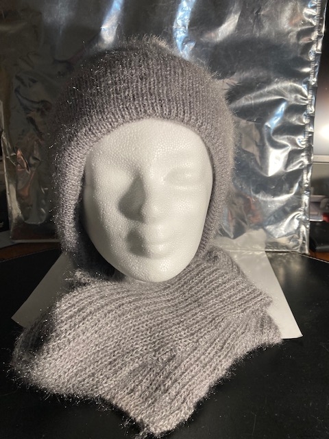Sie kaufen eine handgestrickte Damen-Winter-Beanie-Mütze integriertem Schal mit 2 Längen,: eine Seite ca. 80 cm, die andere. ca. 50 cm. Farbe: grau, Einheitsgröße Kopfmaß ca. 58 cm. Material: Baumwolle - sehr weich, anschmiegsam und kuschelig. Die Mütze ist mit Fleece unterfüttert.