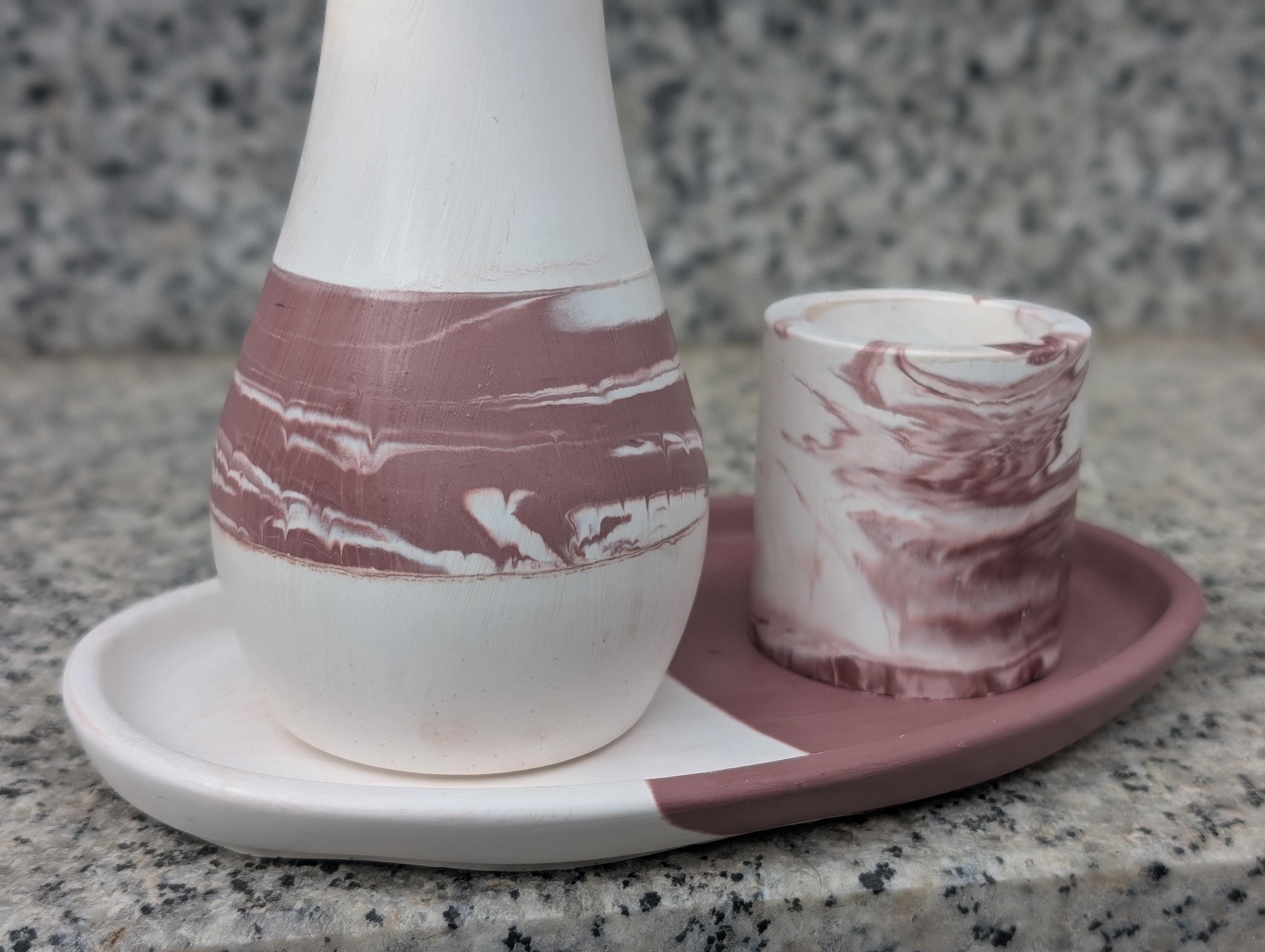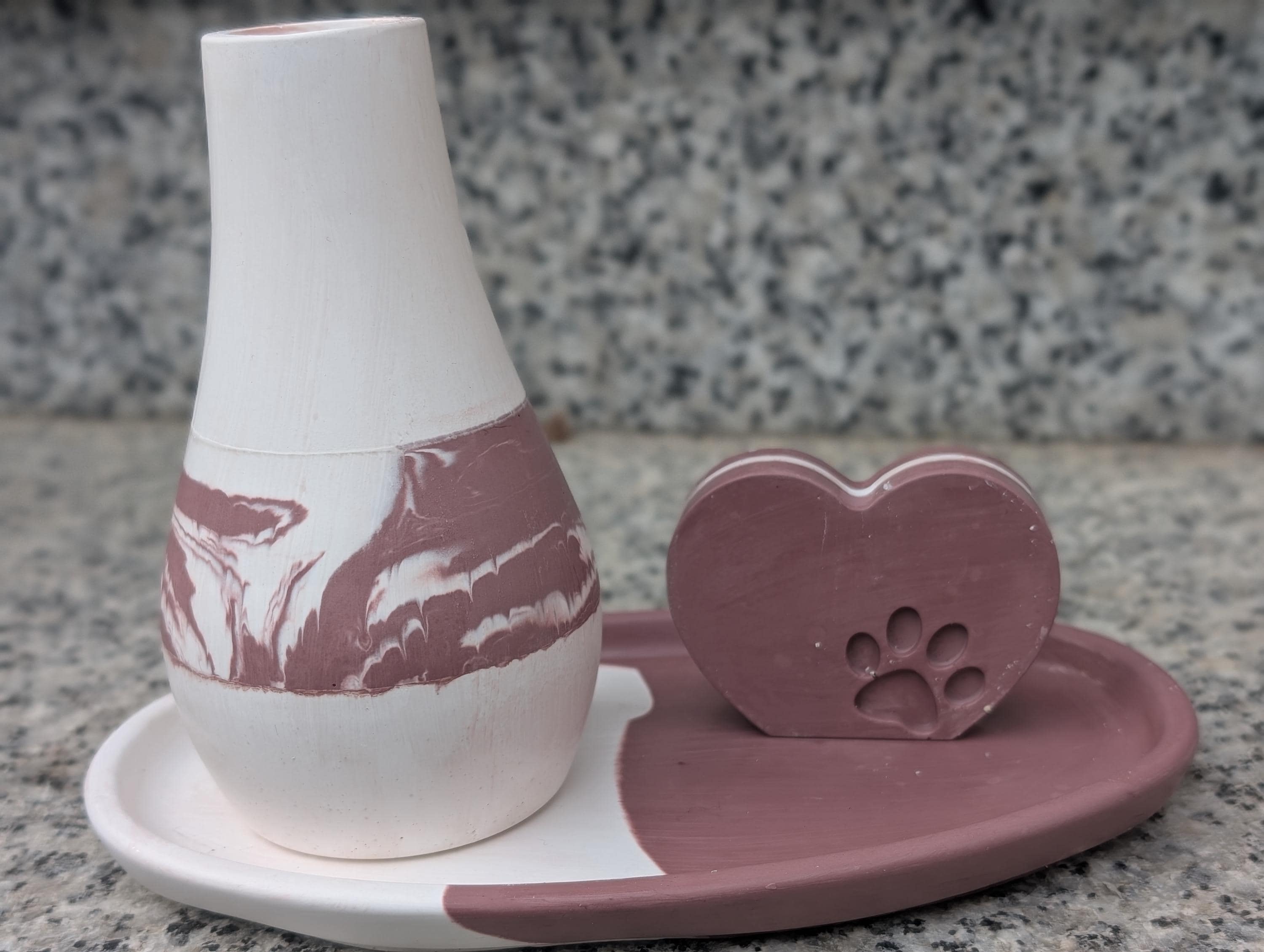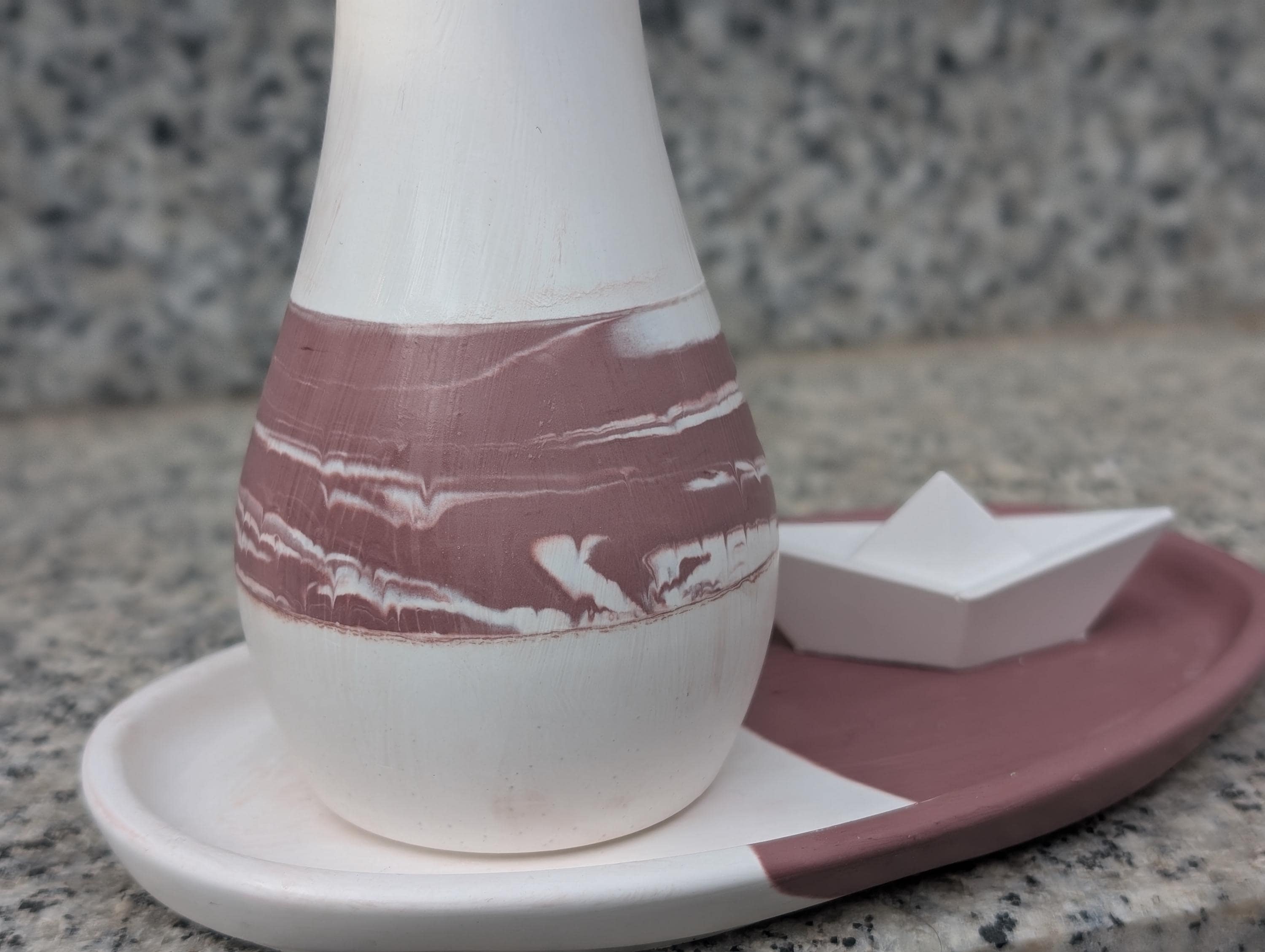 Du kannst viele Versionen miteinander kombinieren - fester Bestandteil sind immer die Vase und die ovale Schale (s. Varianten). Auf den Bildern siehst du Designbeispiele - diese werden so nicht verkauft. Eine exakte Nachbildung ist aufgrund der Handarbeit insbesondere beim Marmor nicht möglich.