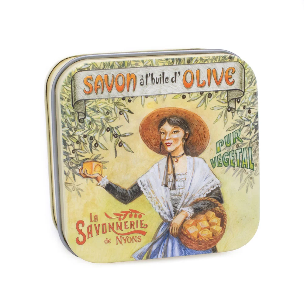 Sie kaufen 1 Designer-Metall-Dose Motiv "Bäuerin" mit 1 Stück französische Shea-Butter-Naturseife mit Olivenöl in der Duftnote Rosenduft, 100 Gramm. Die Seife wird handwerklich hergestellt in der alt-eingesessenen Familien-Seifen-Manufaktur La Savonnerie de Nyons in der Provence / Frankreich.