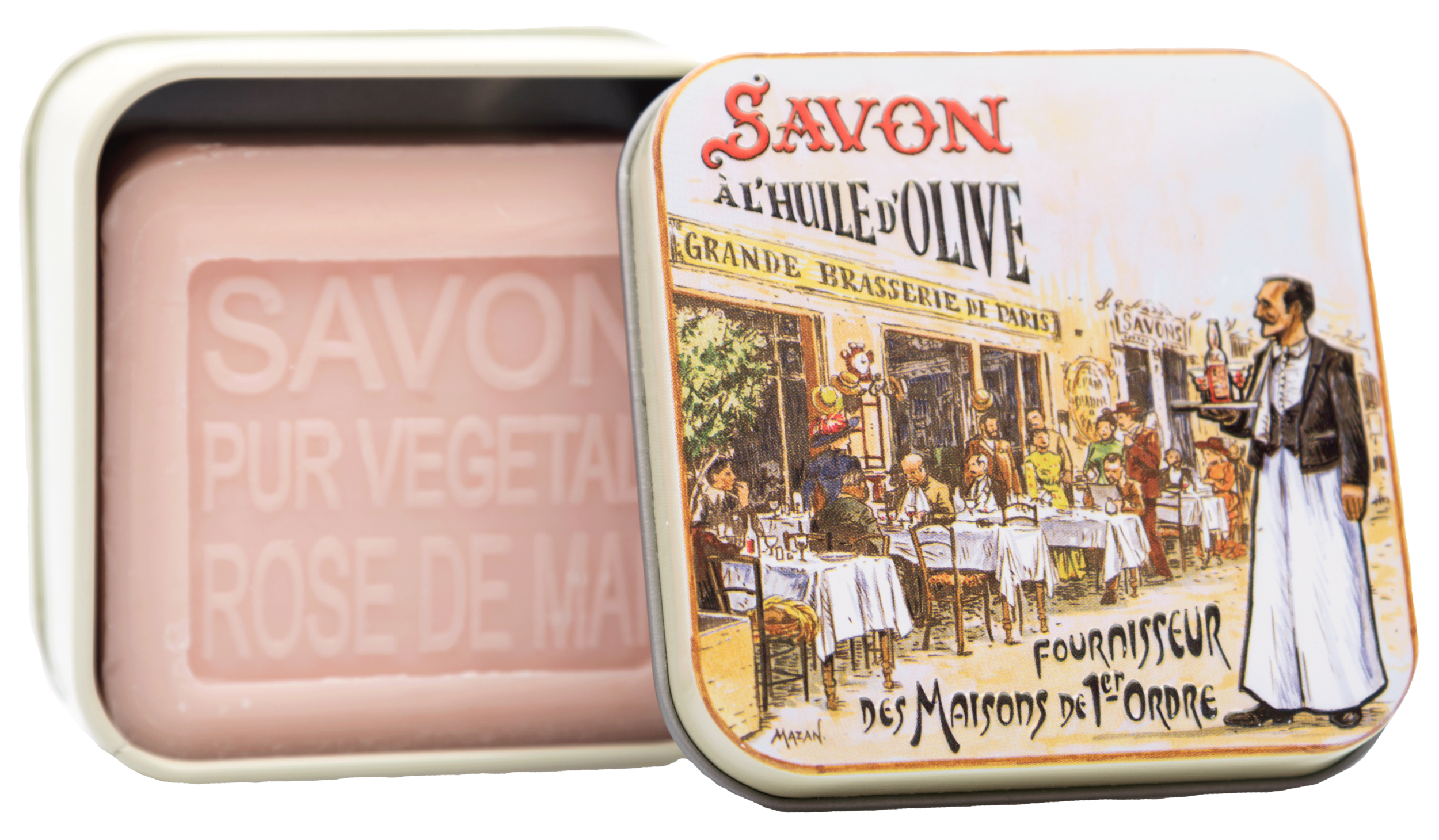 Sie kaufen 1 Designer-Metall-Dose Motiv "Brasserie" mit 1 Stück französische Shea-Butter-Naturseife mit Olivenöl in der Duftnote Mairose, 100 Gramm. Die Seife wird handwerklich hergestellt in der alt-eingesessenen Familien-Seifen-Manufaktur La Savonnerie de Nyons in der Provence / Frankreich.