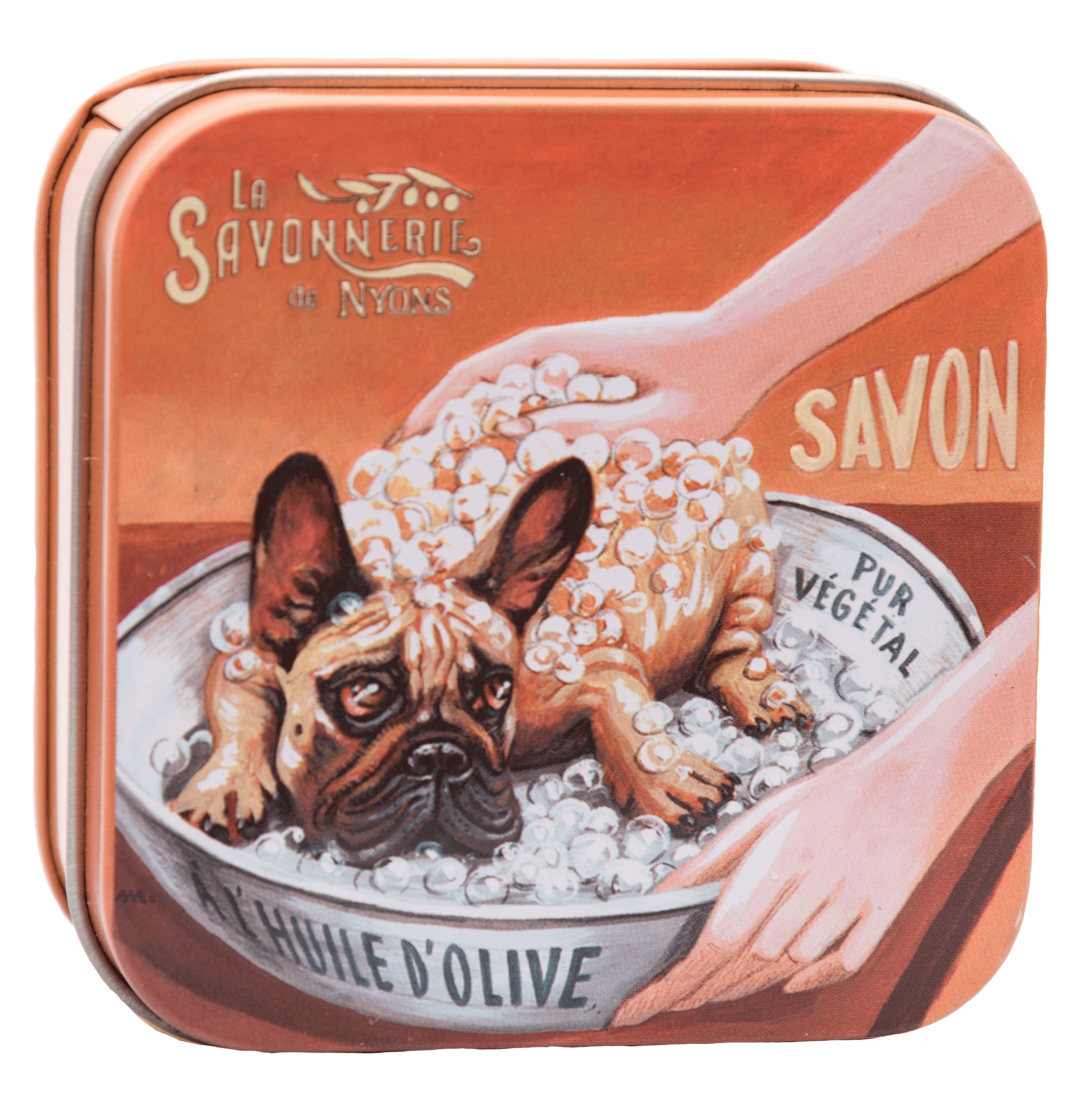Sie kaufen 1 Designer-Metall-Dose Motiv "Bulldogge" mit 1 Stück französische Shea-Butter-Naturseife mit Olivenöl in der Duftnote Mairose, 100 Gramm. Die Seife wird handwerklich hergestellt in der alt-eingesessenen Familien-Seifen-Manufaktur La Savonnerie de Nyons in der Provence / Frankreich.