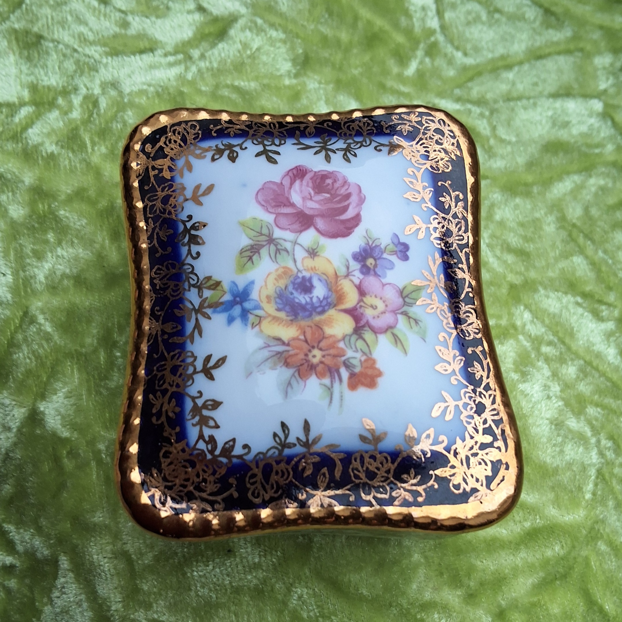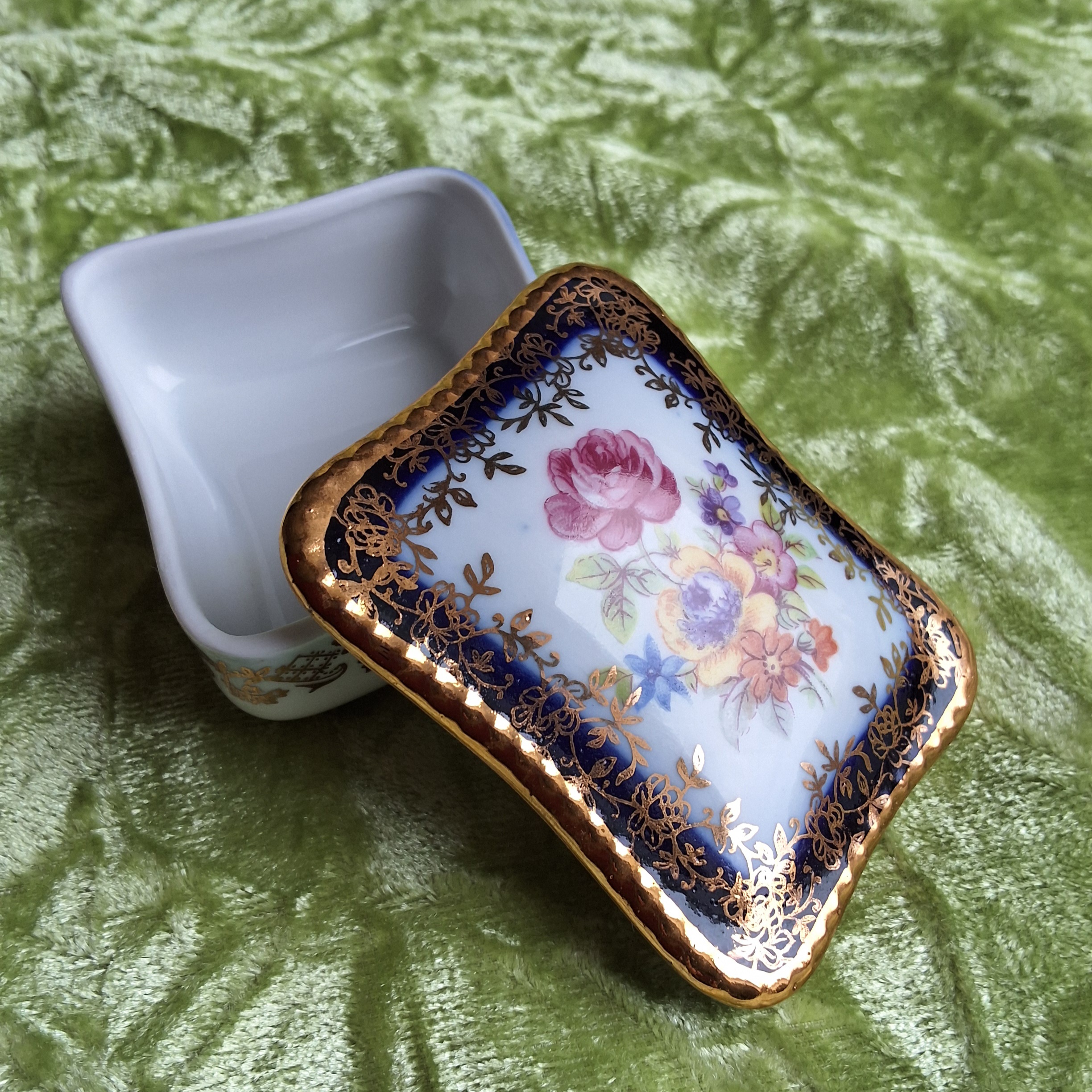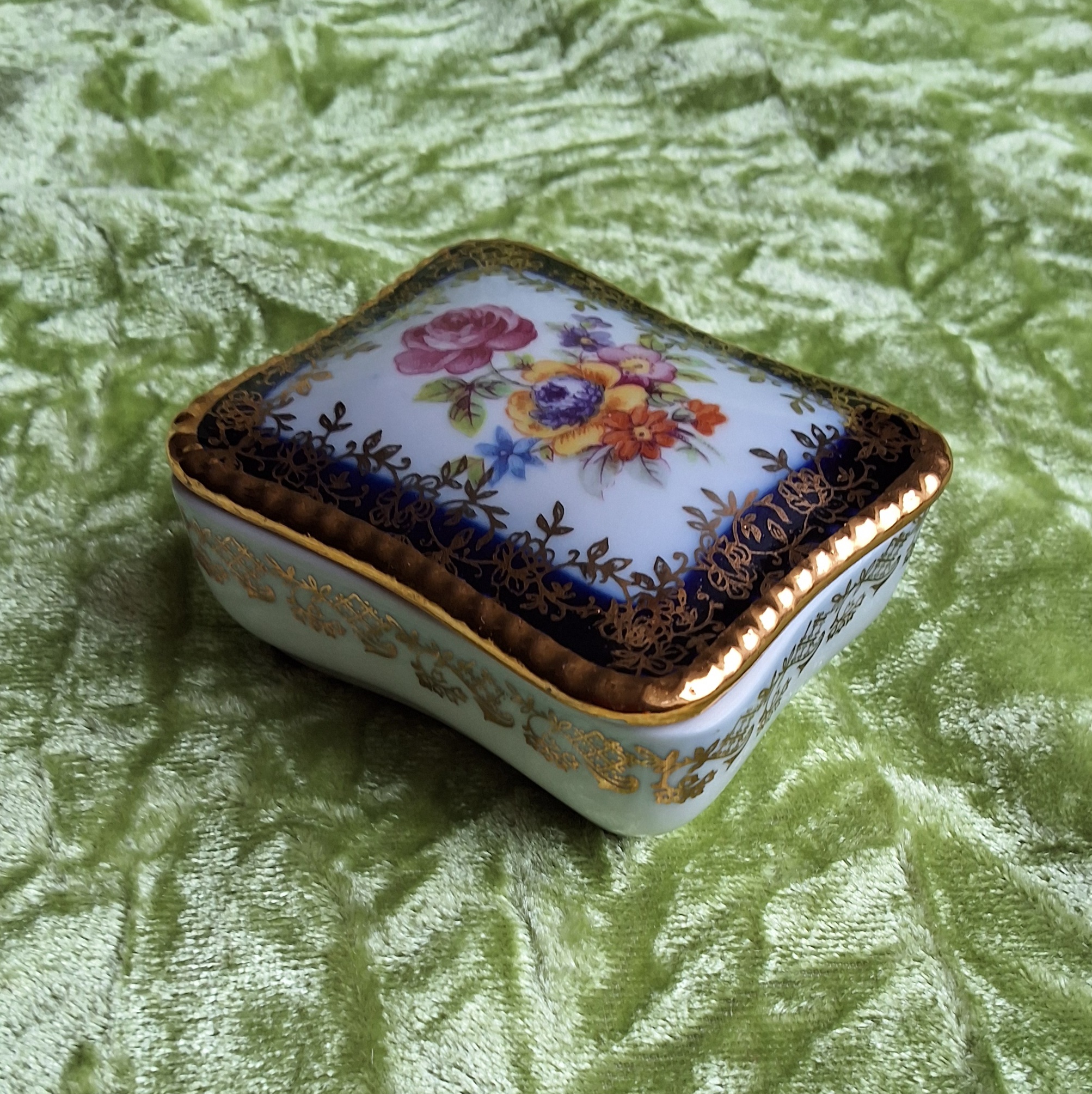 Eingefasst mit Kobaltblau und Gold. Vintage-Porzellandöschen. PM.