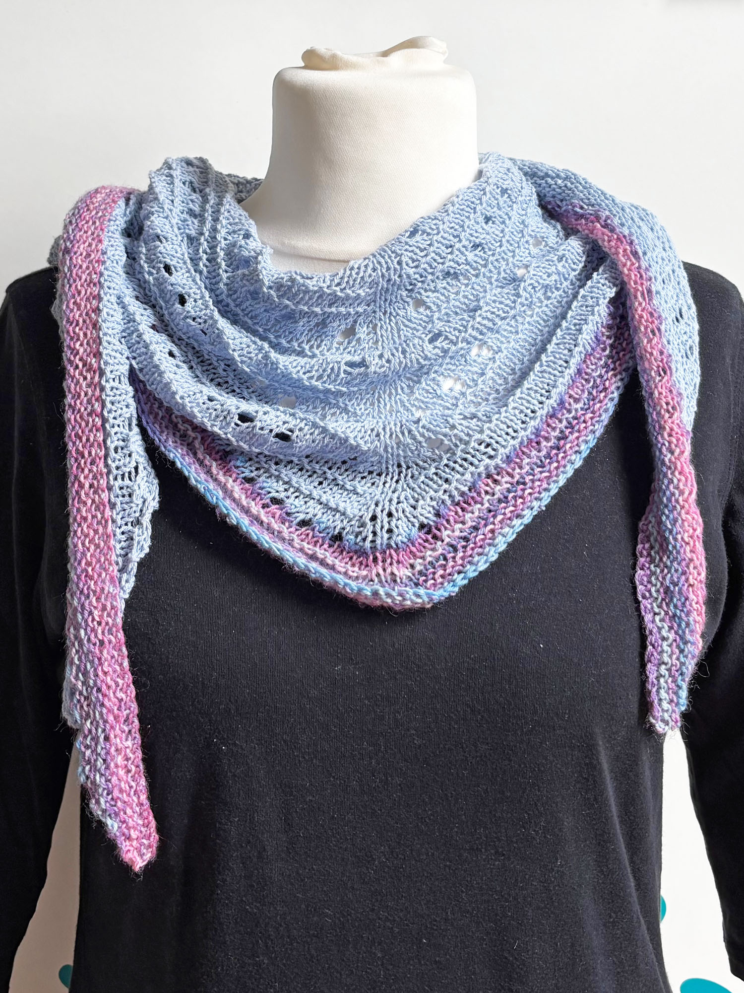 - Dreieckstuch mit Bouretteseide und Schurwolle in Lochmustermix handgestrickt mit einer schmalen Zierkante in Pastellfarben