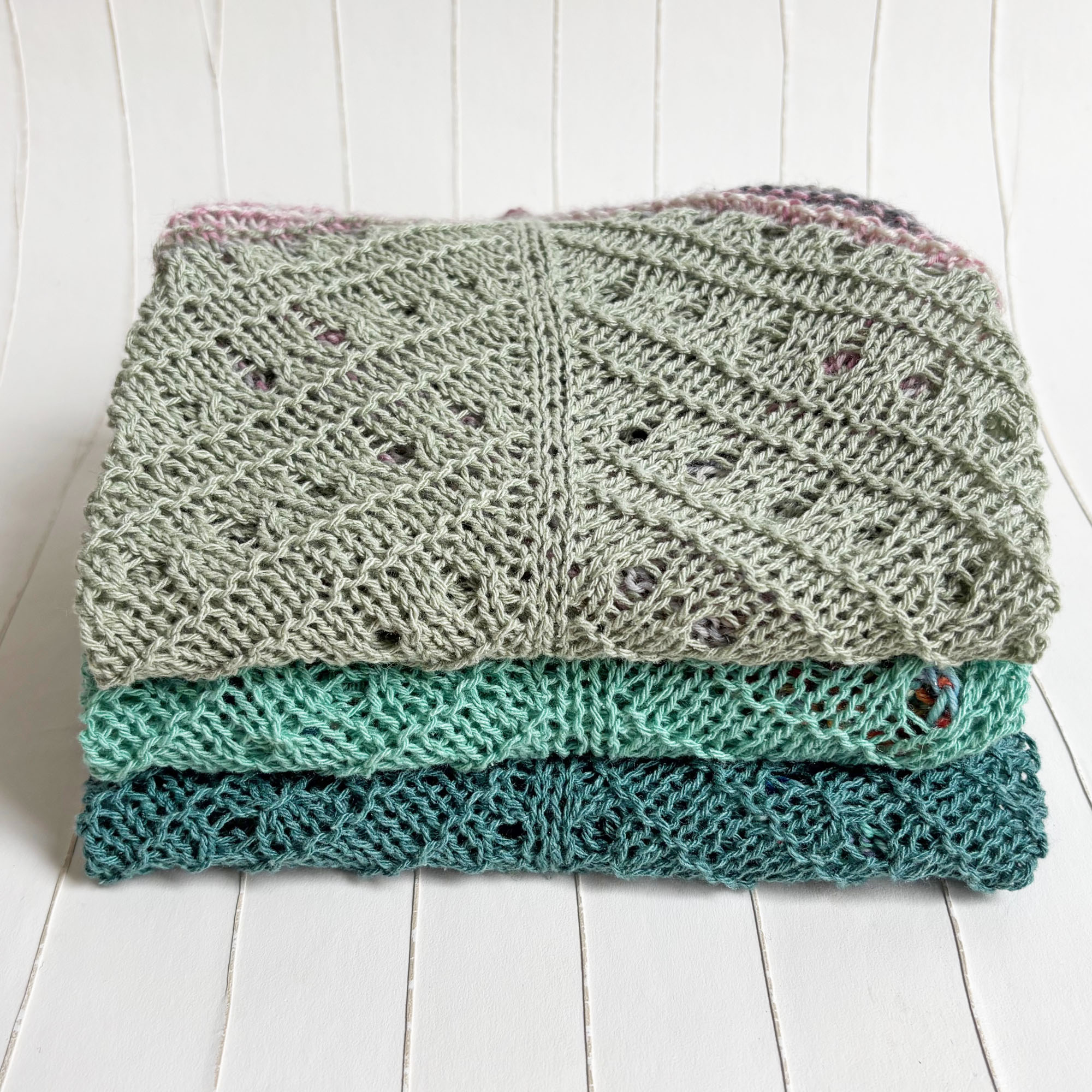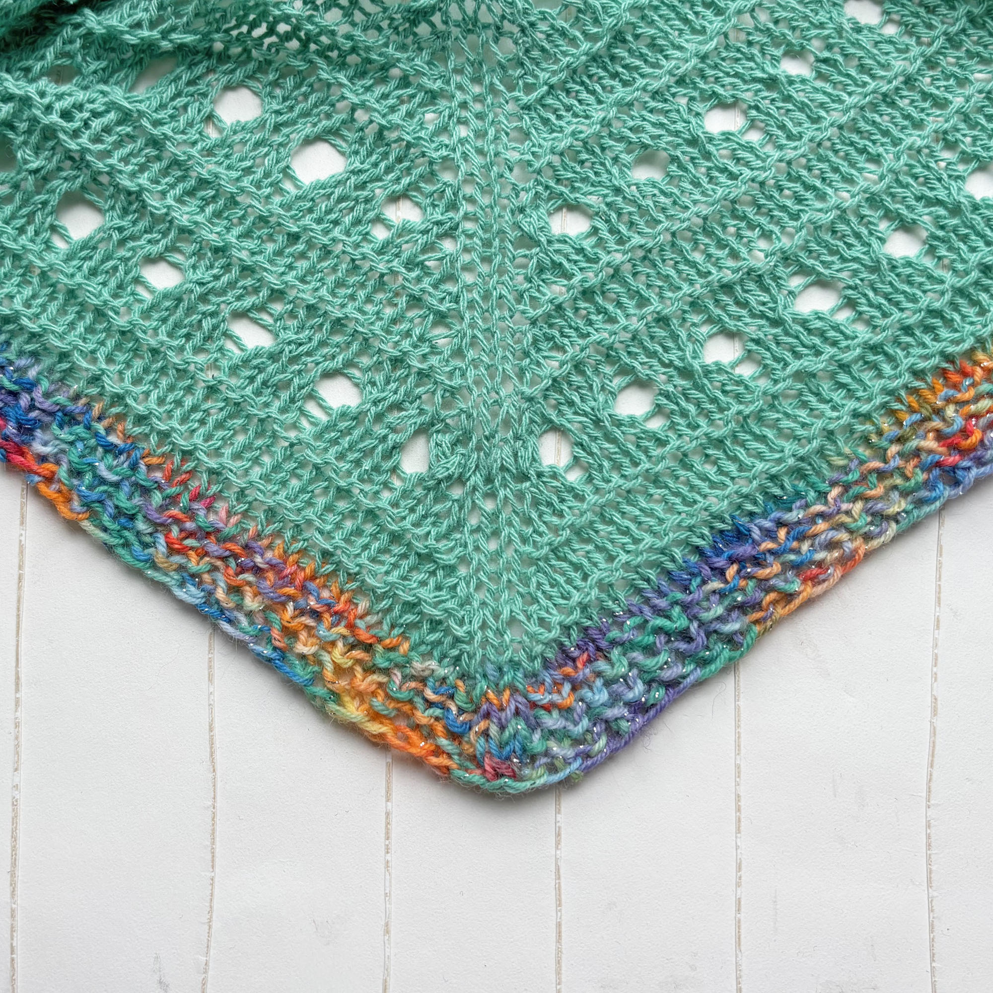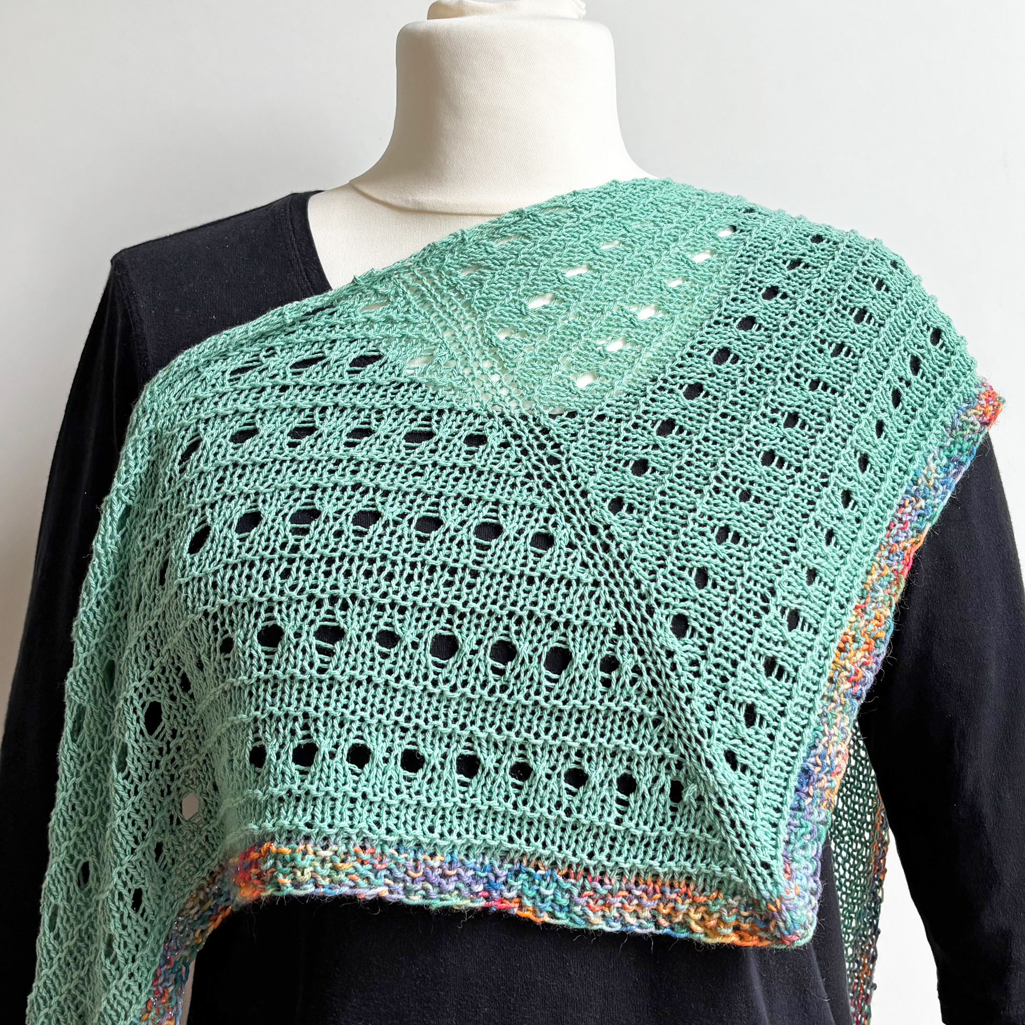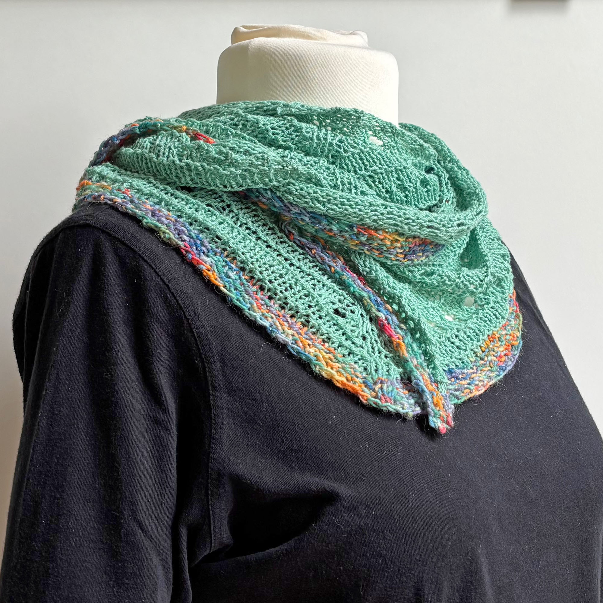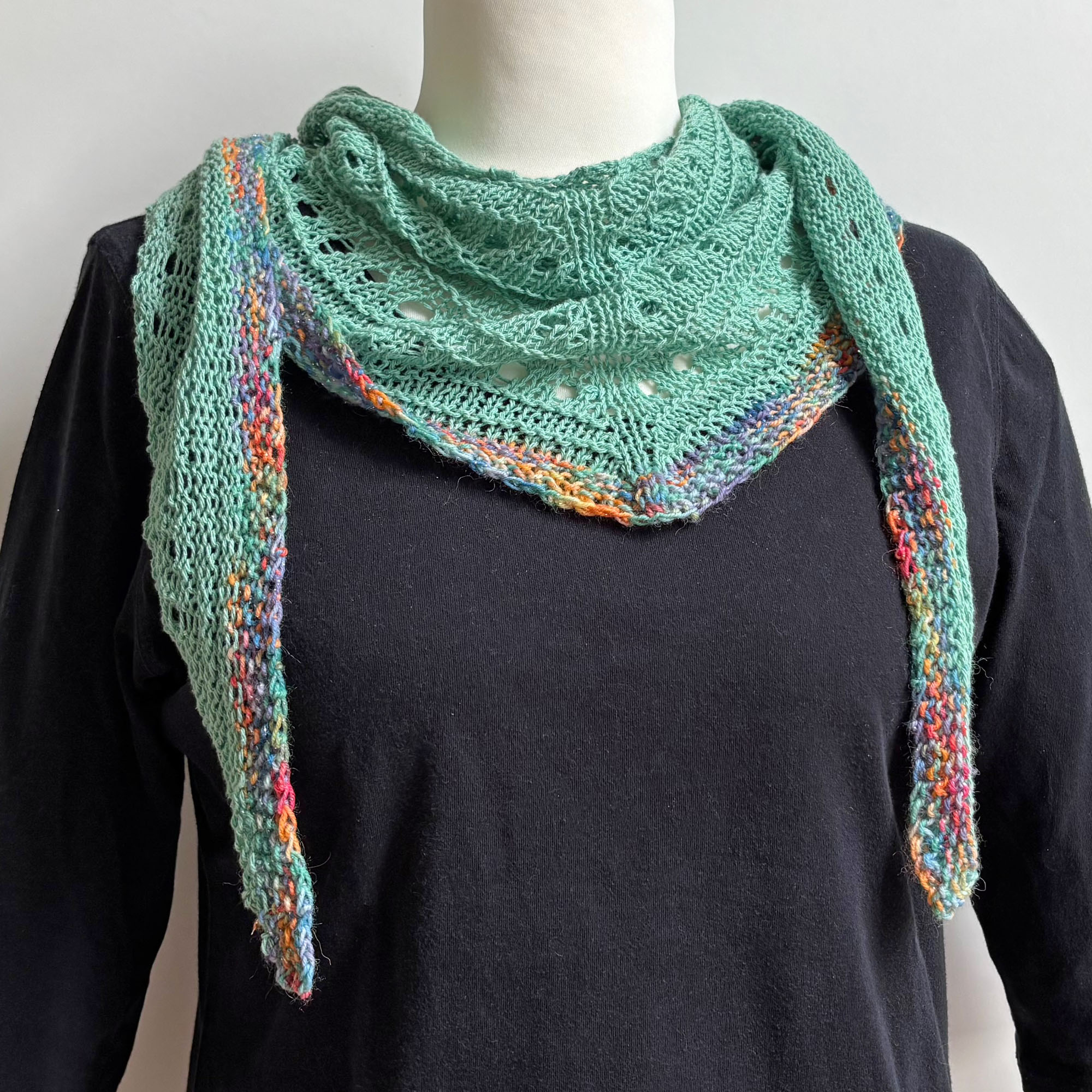 - Dreieckstuch dunkles Mintgrün in Lochmustermix handgestrickt mit einer schmalen Zierkante aus handgefärbtem Garn mit einem feinem Glitzerfaden
