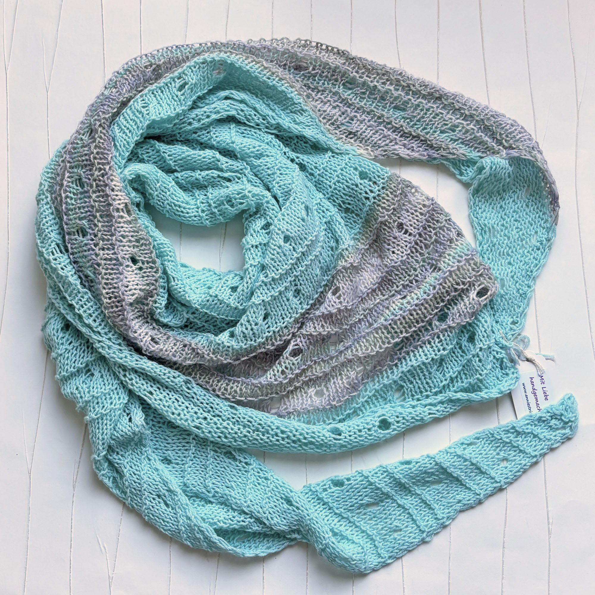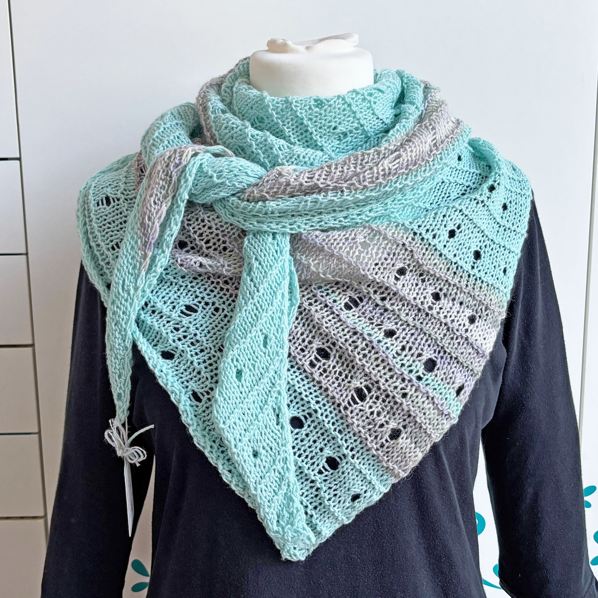 - Leichtes mintgrünes Dreieckstuch mit farblich passendem Zierstreifen in Lochmuster handgestrickt