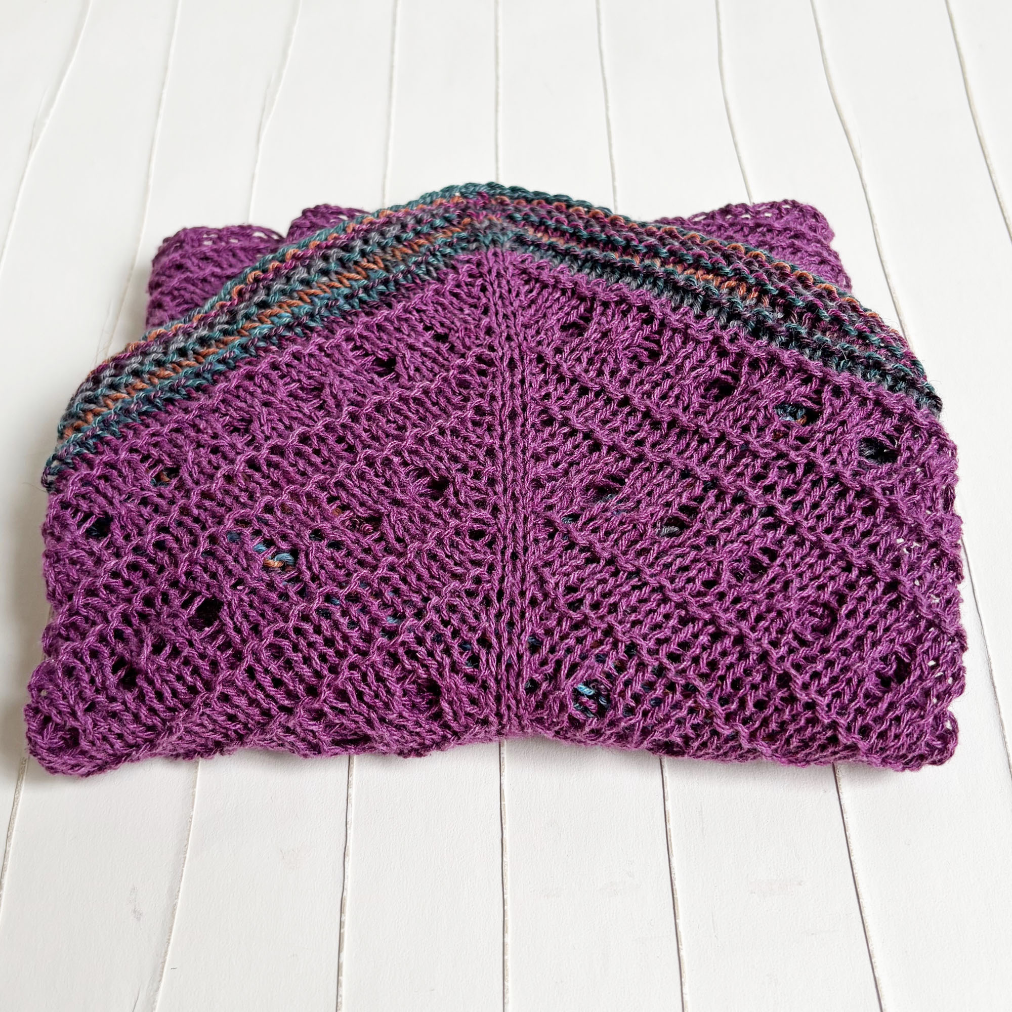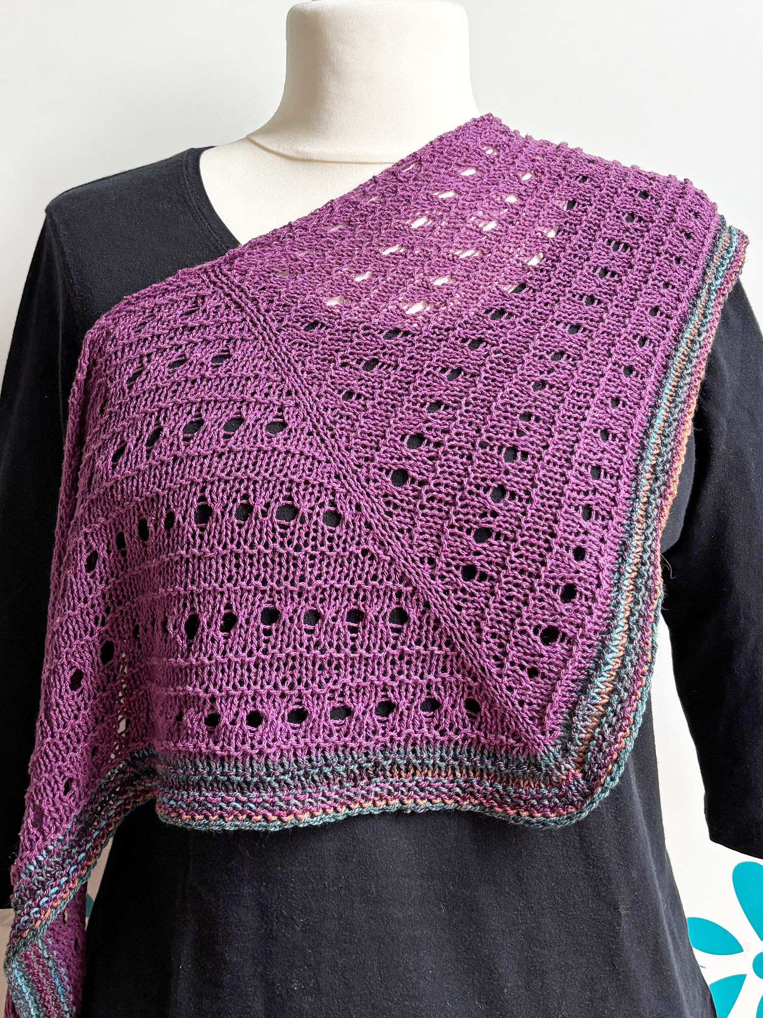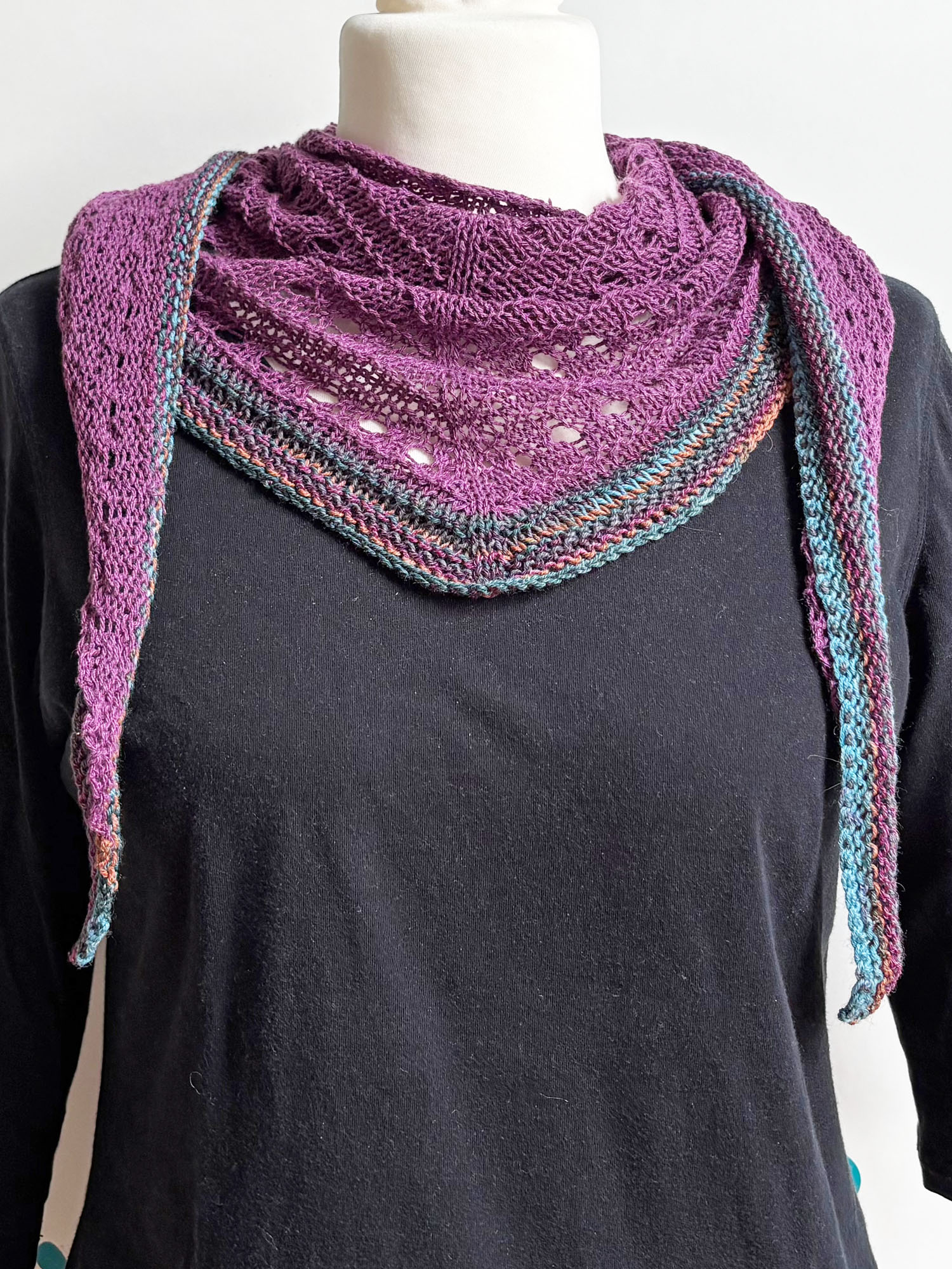 - Dreieckstuch in Lochmustermix handgestrickt mit einer schmalen Zierkante in Blaugrau und Lilatönen
