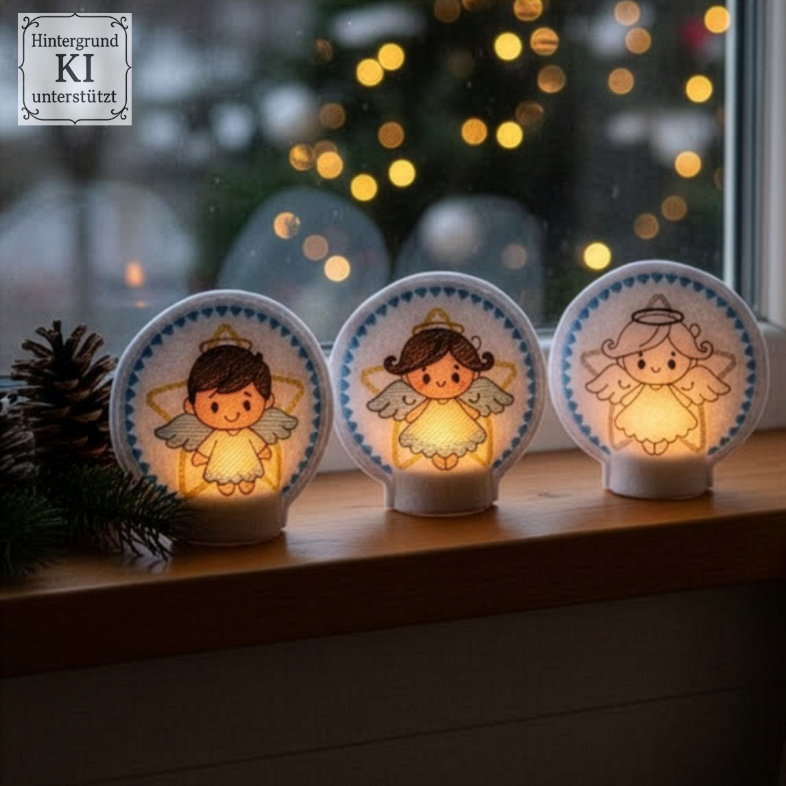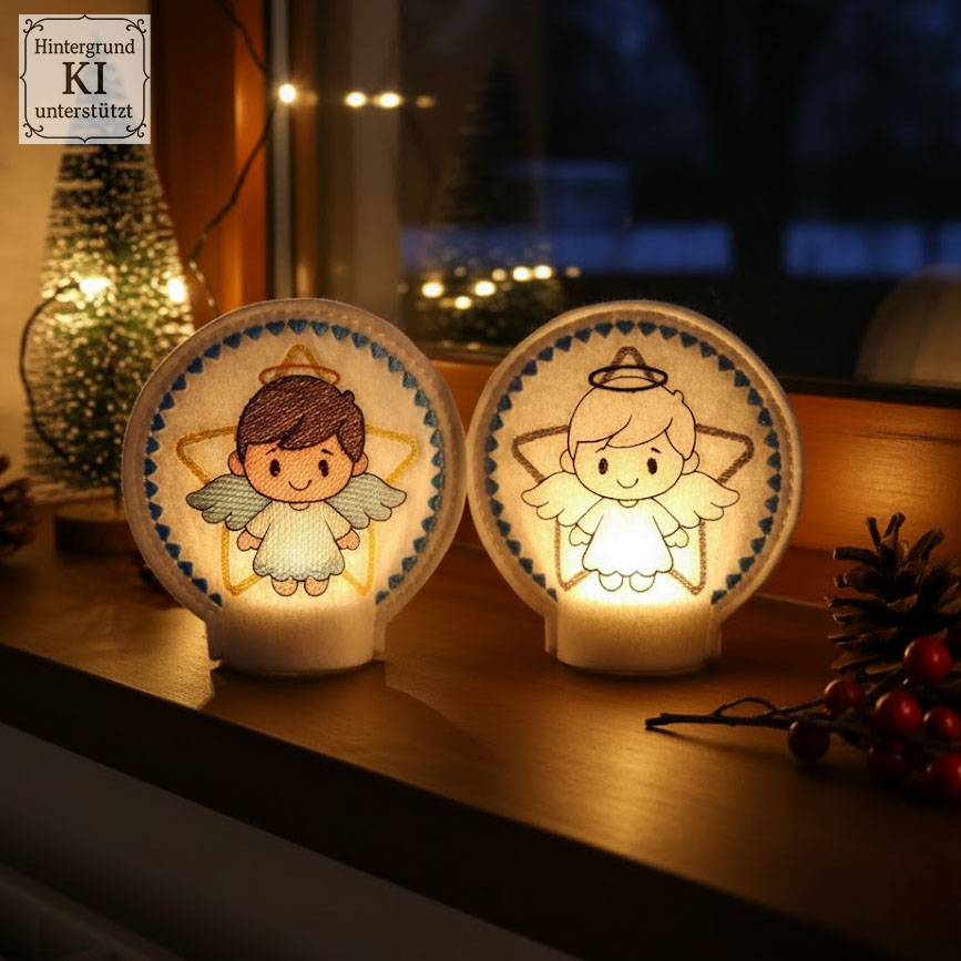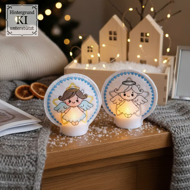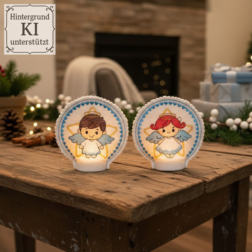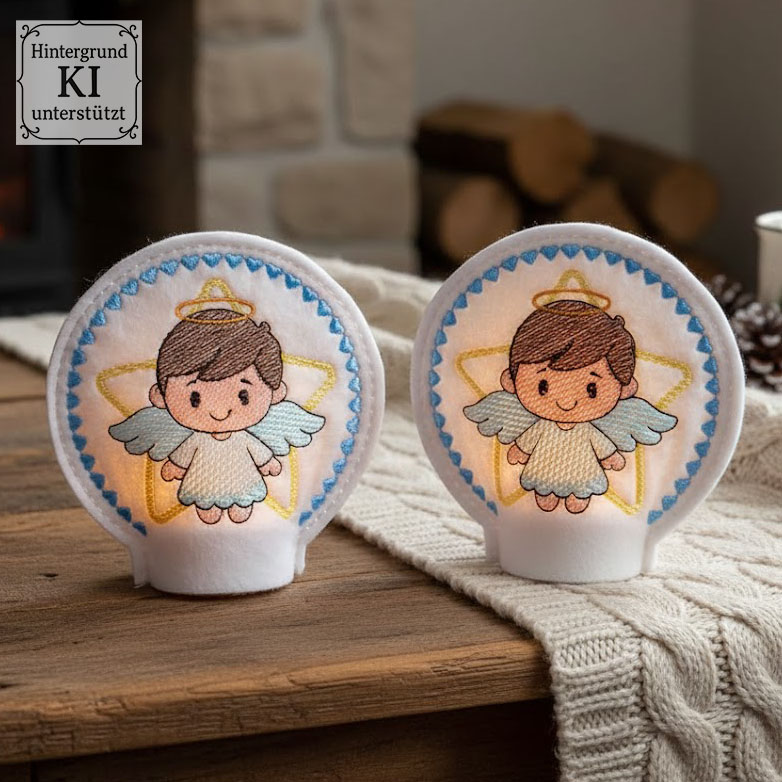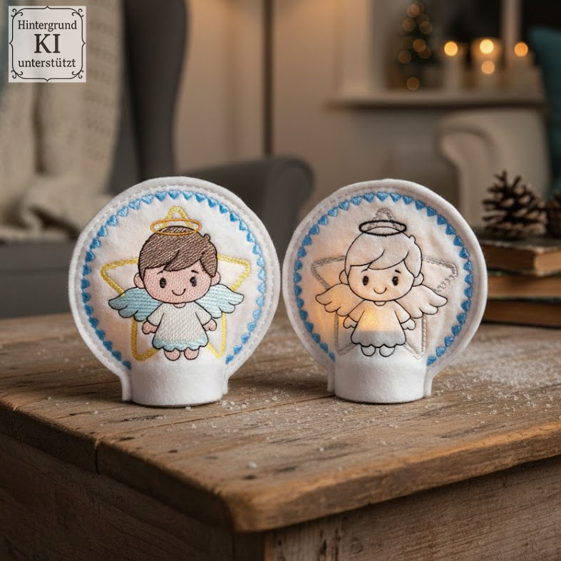 Dieses Set enthält vier liebevoll gestaltete Engelmotive für ITH-Teelichthüllen. Engelboy und Engelgirl sind jeweils in einer farbigen und einer reduzierten Variante enthalten. Die Motive sind im Shabby-Stil digitalisiert und bewusst weich gehalten. Beim Shabby-Stil ist die Füllung nicht vollständig deckend, kleine Lücken und eine leicht unregelmäßige Struktur sind gewollt. Dadurch entsteht eine sanfte Used-Optik, die besonders gut zu Lichtsäcken, Teelichthüllen und winterlicher Dekoration passt. Die Konturen bleiben klar und sorgen trotz der soften Flächen für ein sauberes Stickergebnis. Die Dateien sind für den 10x10-Rahmen ausgelegt und eignen sich ideal für stimmungsvolle Weihnachts- und Winterprojekte.