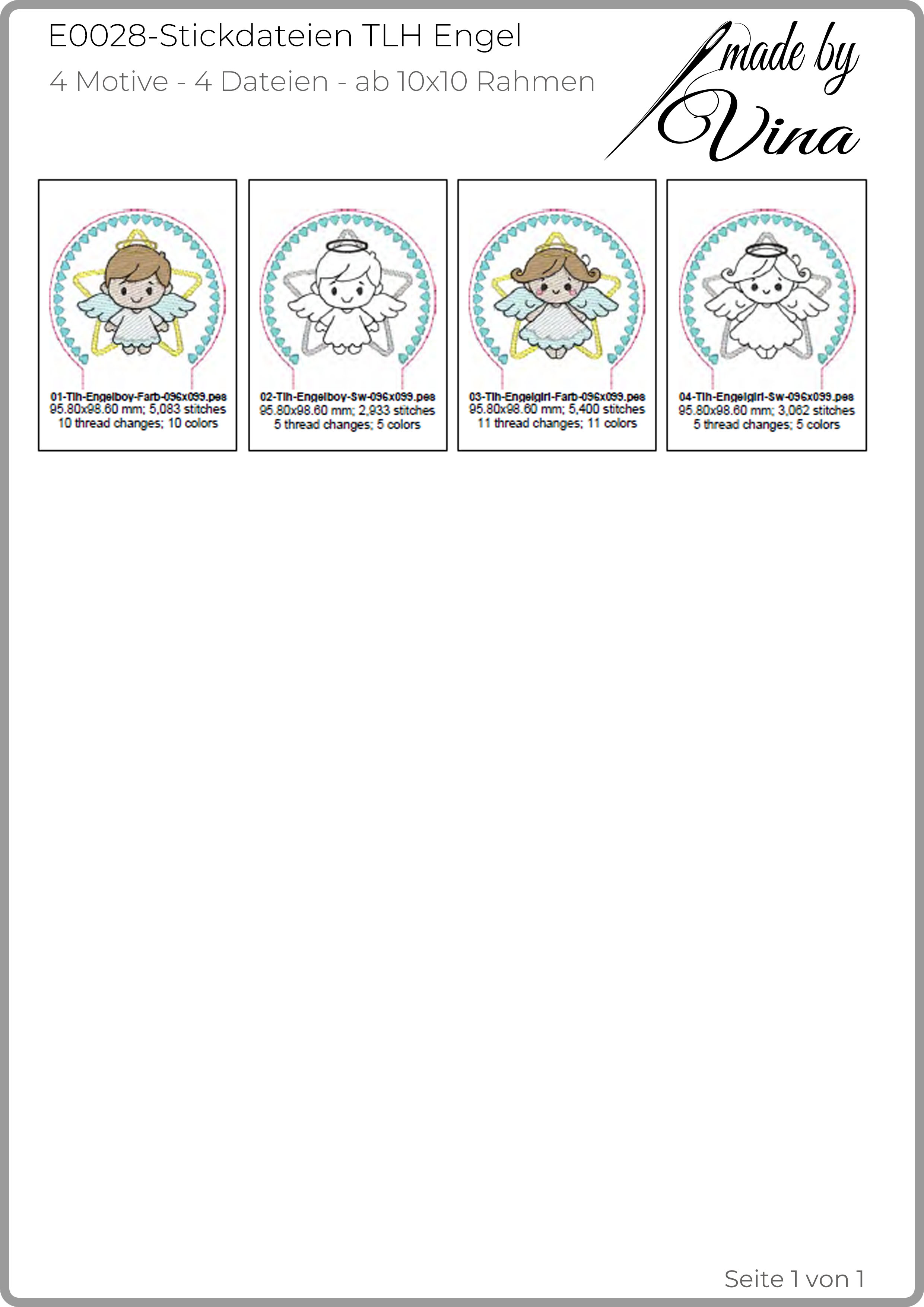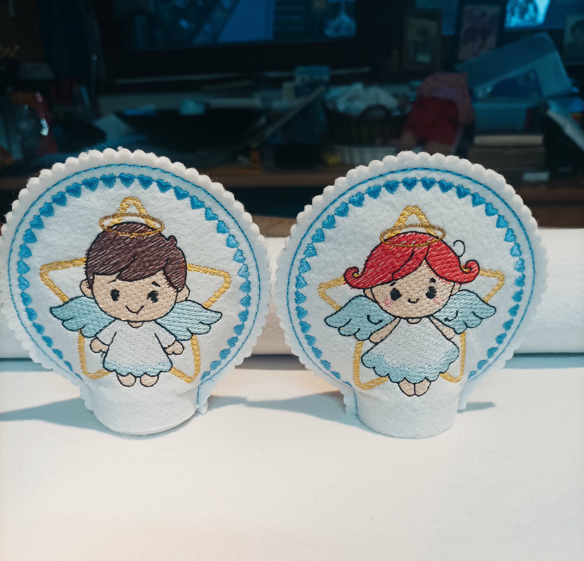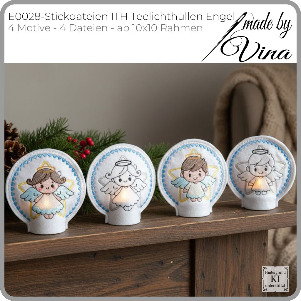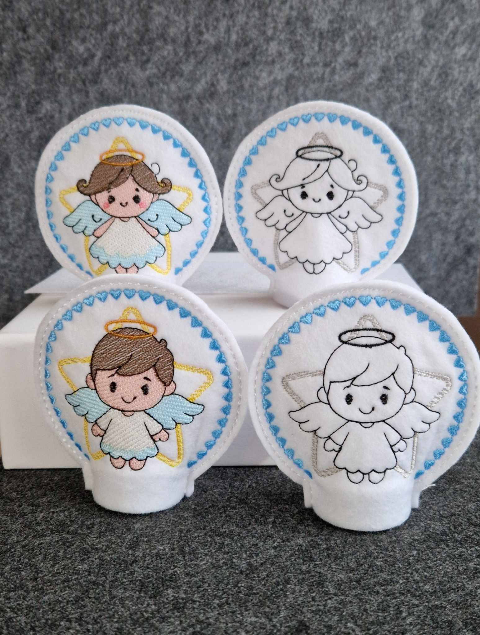 Dieses Set enthält vier liebevoll gestaltete Engelmotive für ITH-Teelichthüllen. Engelboy und Engelgirl sind jeweils in einer farbigen und einer reduzierten Variante enthalten. Die Motive sind im Shabby-Stil digitalisiert und bewusst weich gehalten. Beim Shabby-Stil ist die Füllung nicht vollständig deckend, kleine Lücken und eine leicht unregelmäßige Struktur sind gewollt. Dadurch entsteht eine sanfte Used-Optik, die besonders gut zu Lichtsäcken, Teelichthüllen und winterlicher Dekoration passt. Die Konturen bleiben klar und sorgen trotz der soften Flächen für ein sauberes Stickergebnis. Die Dateien sind für den 10x10-Rahmen ausgelegt und eignen sich ideal für stimmungsvolle Weihnachts- und Winterprojekte.