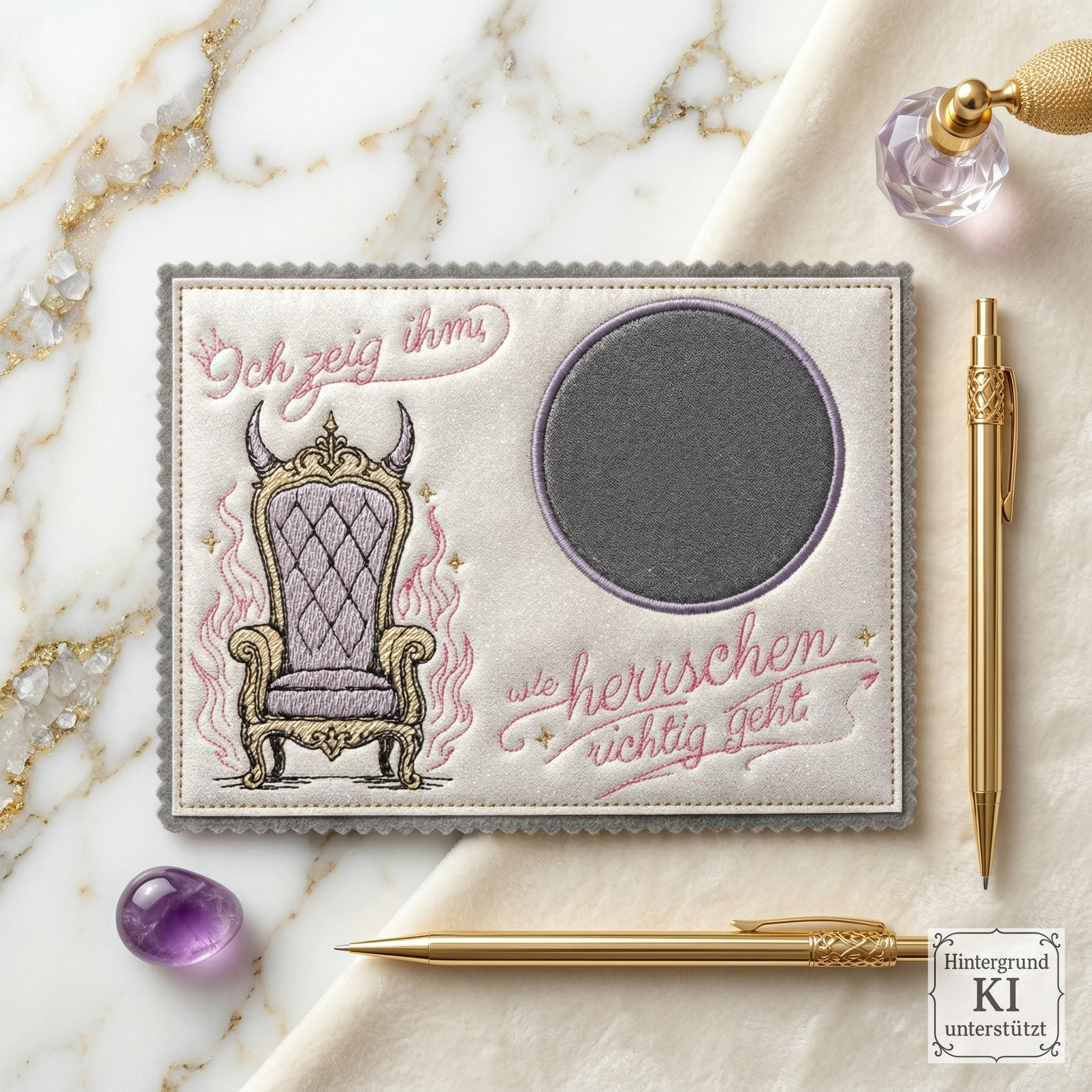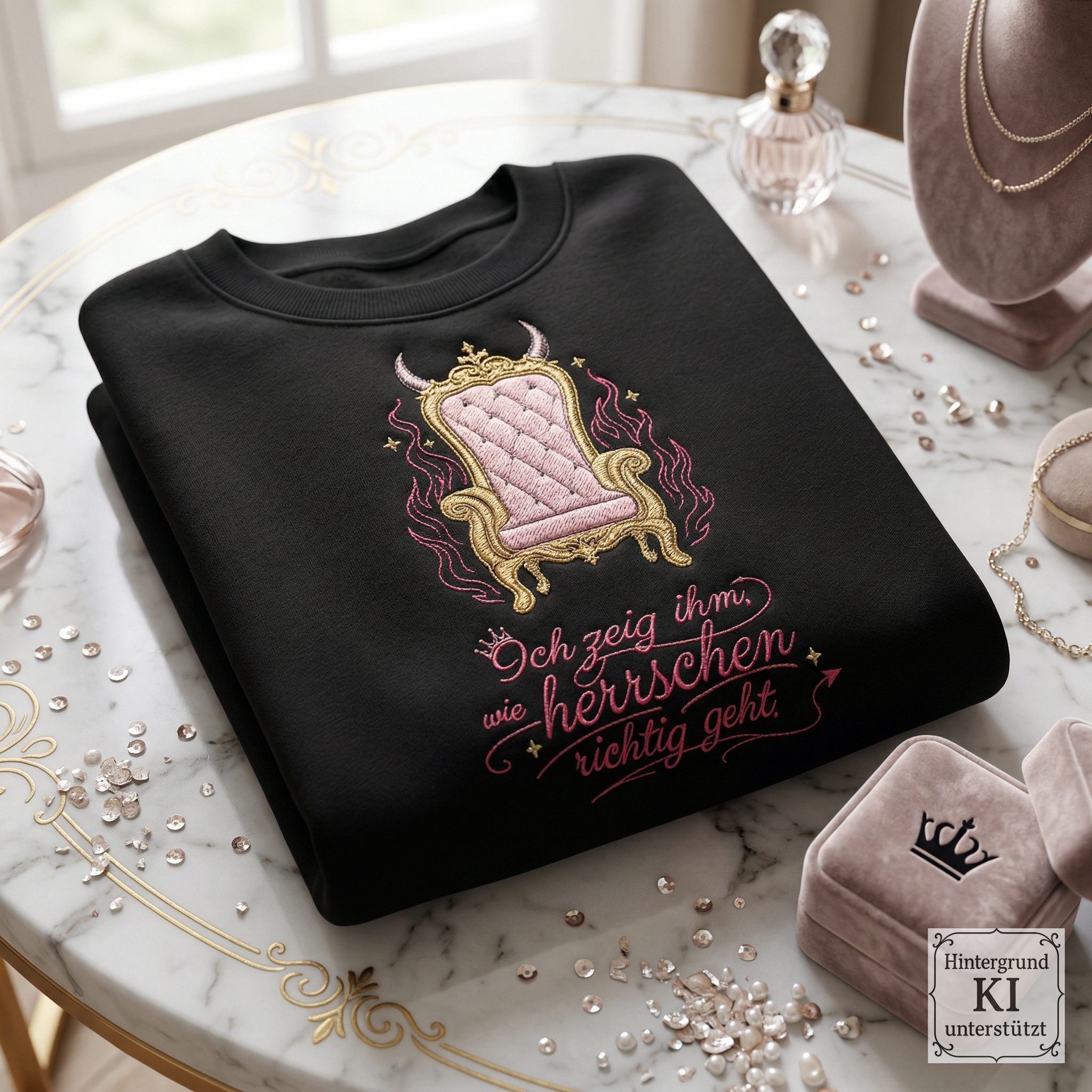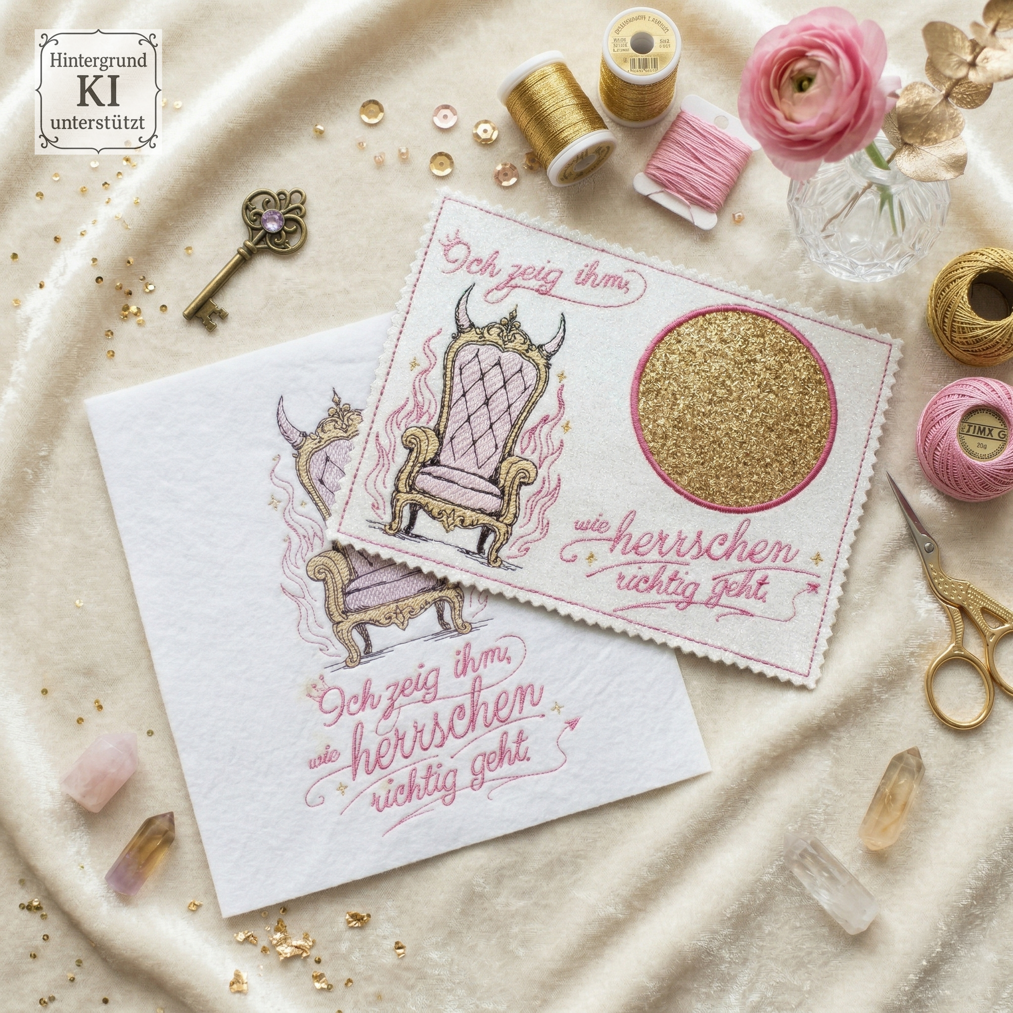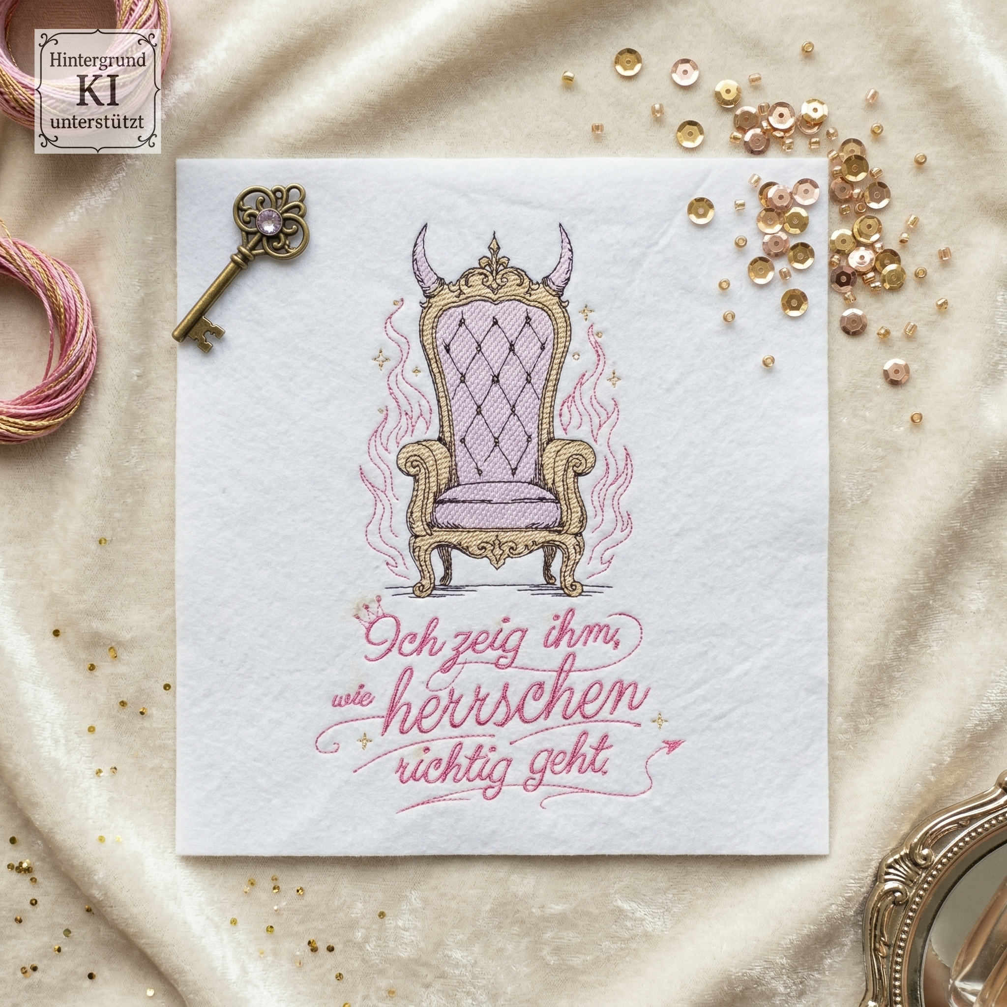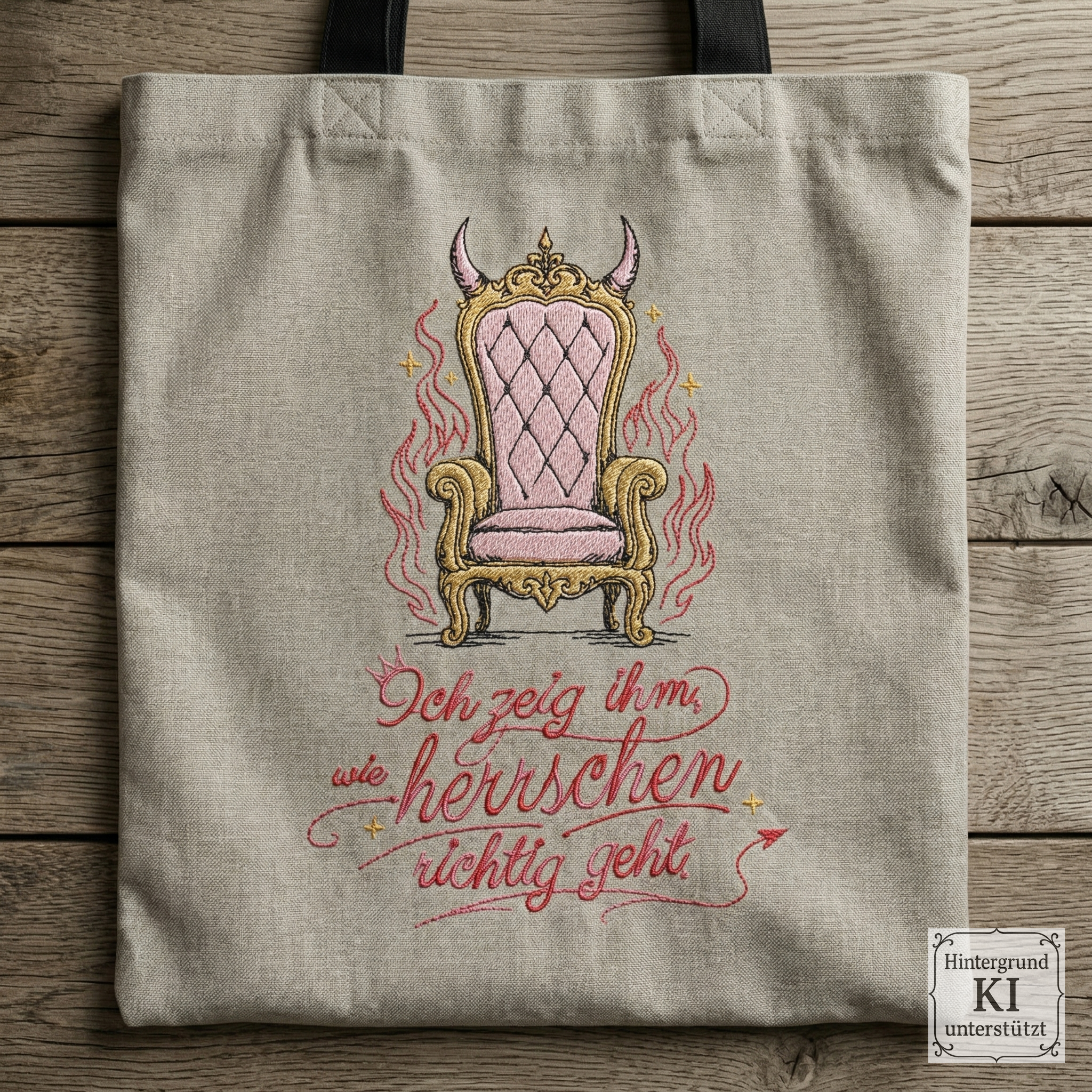 Ein Thron mit Hörnern, umgeben von Flammen, und der Schriftzug „Ich zeig ihm, wie herrschen richtig geht." – dieses Set ist für alle, die wissen, was sie wollen. Die Motive zeigen einen prunkvollen Sessel im Dark-Fantasy-Stil, wahlweise als reines Konturmotiv in Schwarz-Weiß oder in der farbigen Version mit Rosa und Gold. Der Schriftzug ist separat erhältlich – als eigenständiges Motiv ohne Thron – und lässt sich so flexibel auf verschiedenen Projekten einsetzen. Zwei der Dateien sind als Tassenmotiv ausgelegt, mit Platz für einen runden Patch oder Glitzerapplikation. Das Set passt zu Kissen, Taschen, Shirts oder allem, was ein bisschen Haltung verträgt.