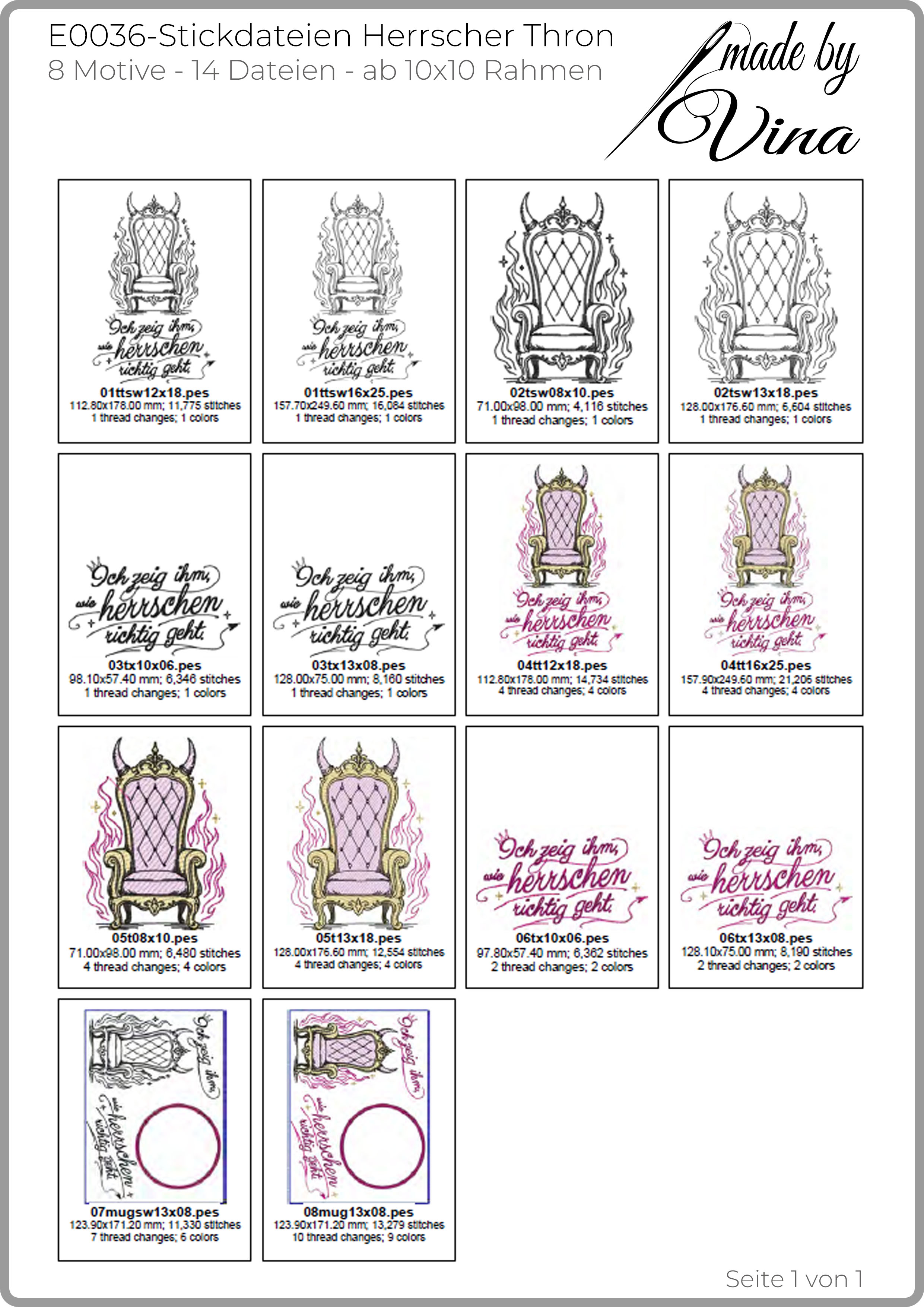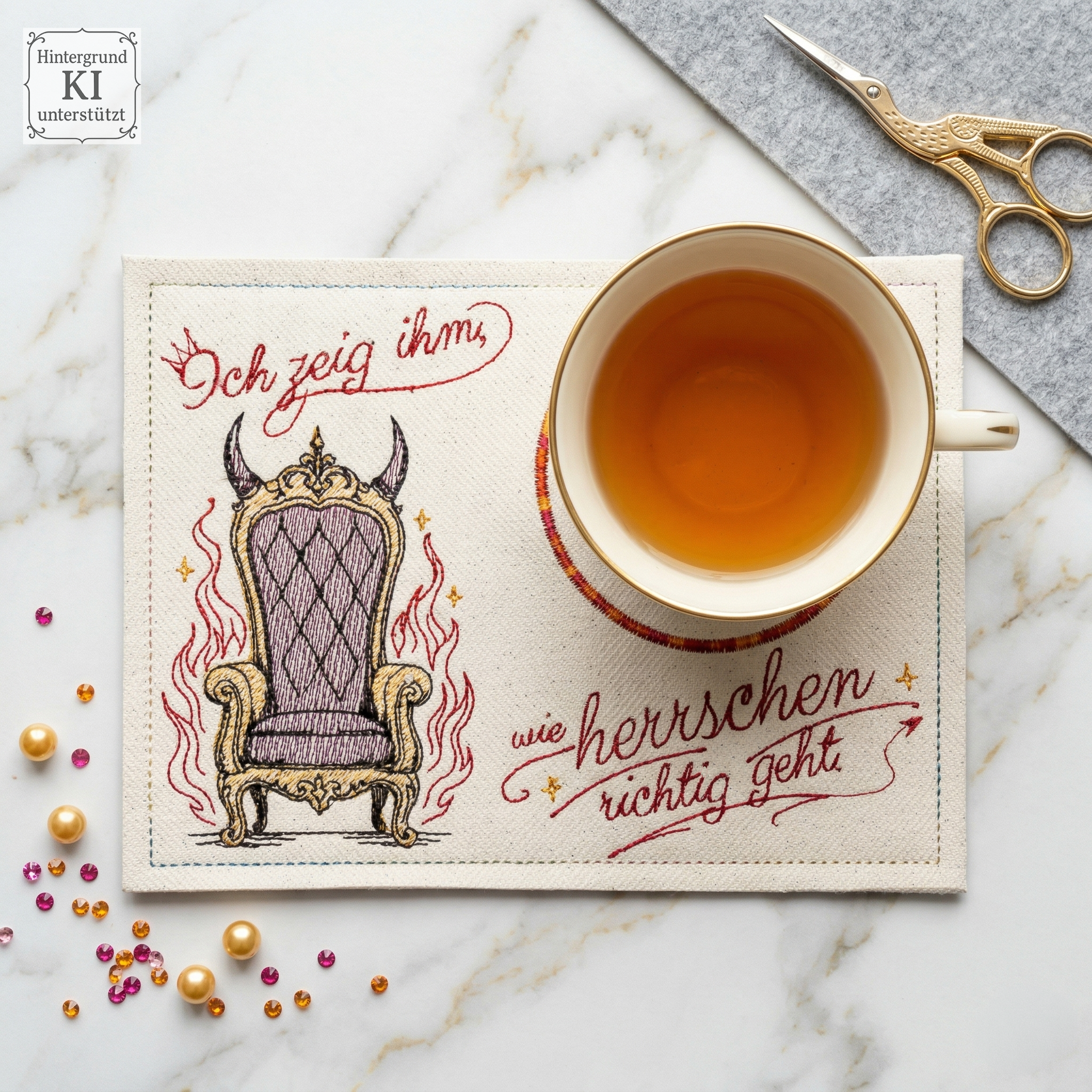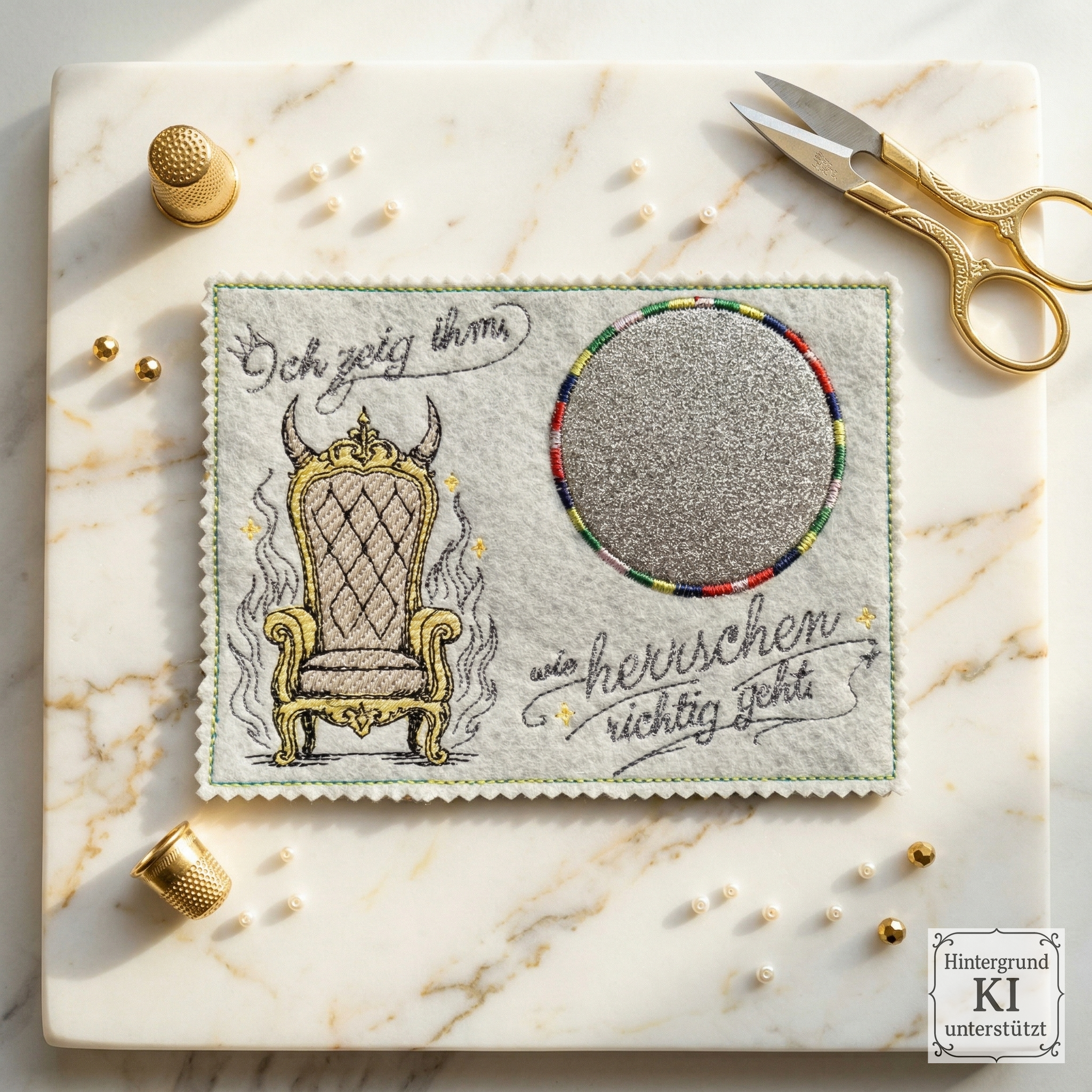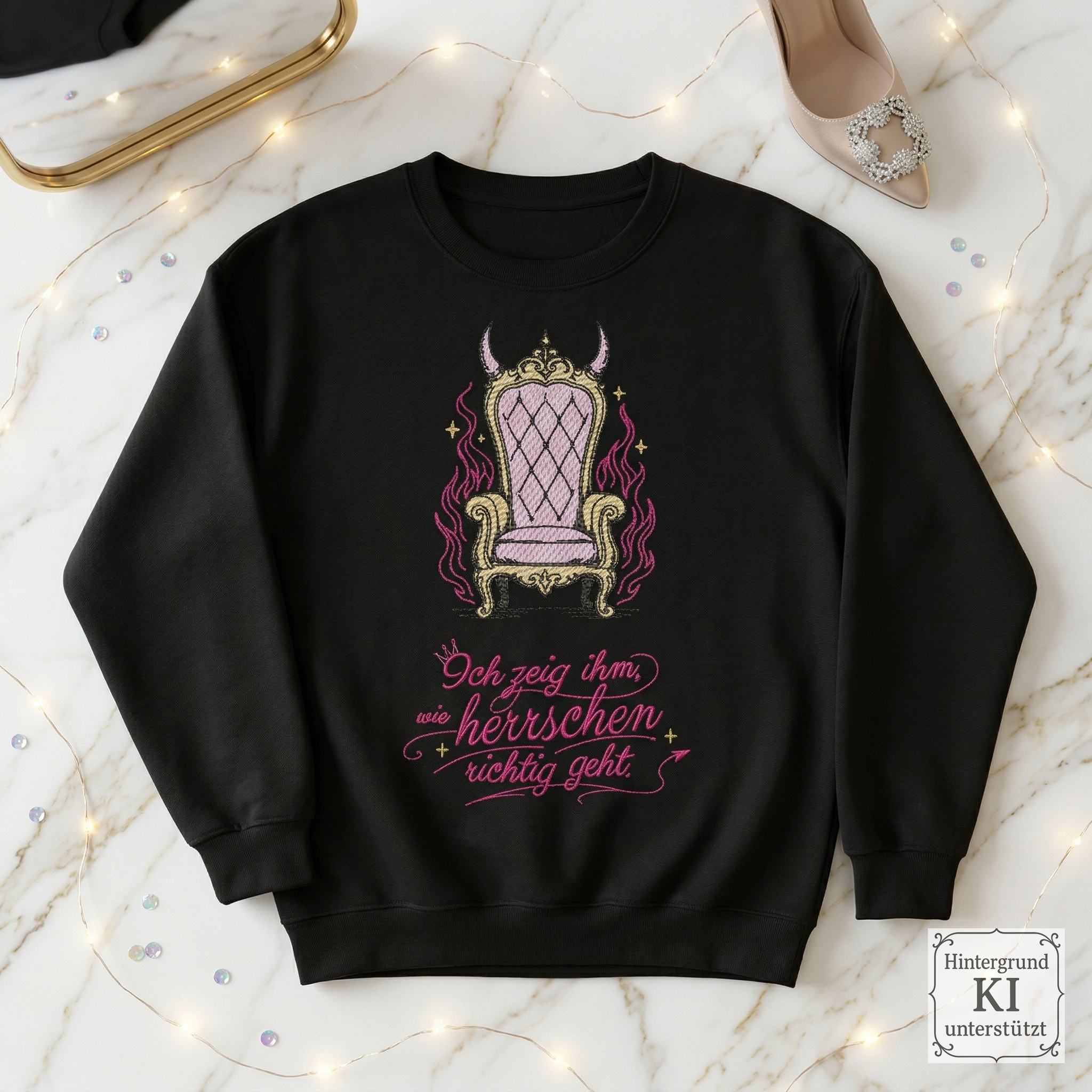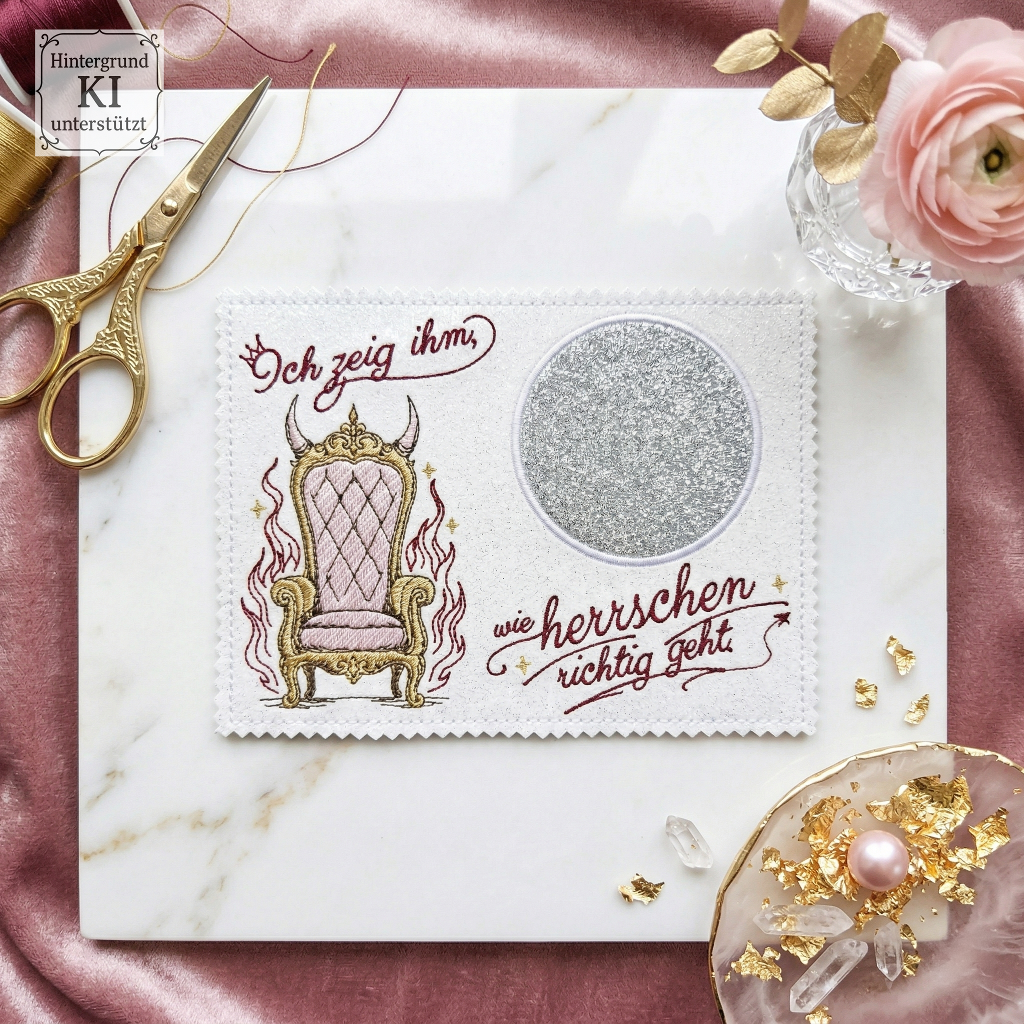 Ein Thron mit Hörnern, umgeben von Flammen, und der Schriftzug „Ich zeig ihm, wie herrschen richtig geht." – dieses Set ist für alle, die wissen, was sie wollen. Die Motive zeigen einen prunkvollen Sessel im Dark-Fantasy-Stil, wahlweise als reines Konturmotiv in Schwarz-Weiß oder in der farbigen Version mit Rosa und Gold. Der Schriftzug ist separat erhältlich – als eigenständiges Motiv ohne Thron – und lässt sich so flexibel auf verschiedenen Projekten einsetzen. Zwei der Dateien sind als Tassenmotiv ausgelegt, mit Platz für einen runden Patch oder Glitzerapplikation. Das Set passt zu Kissen, Taschen, Shirts oder allem, was ein bisschen Haltung verträgt.