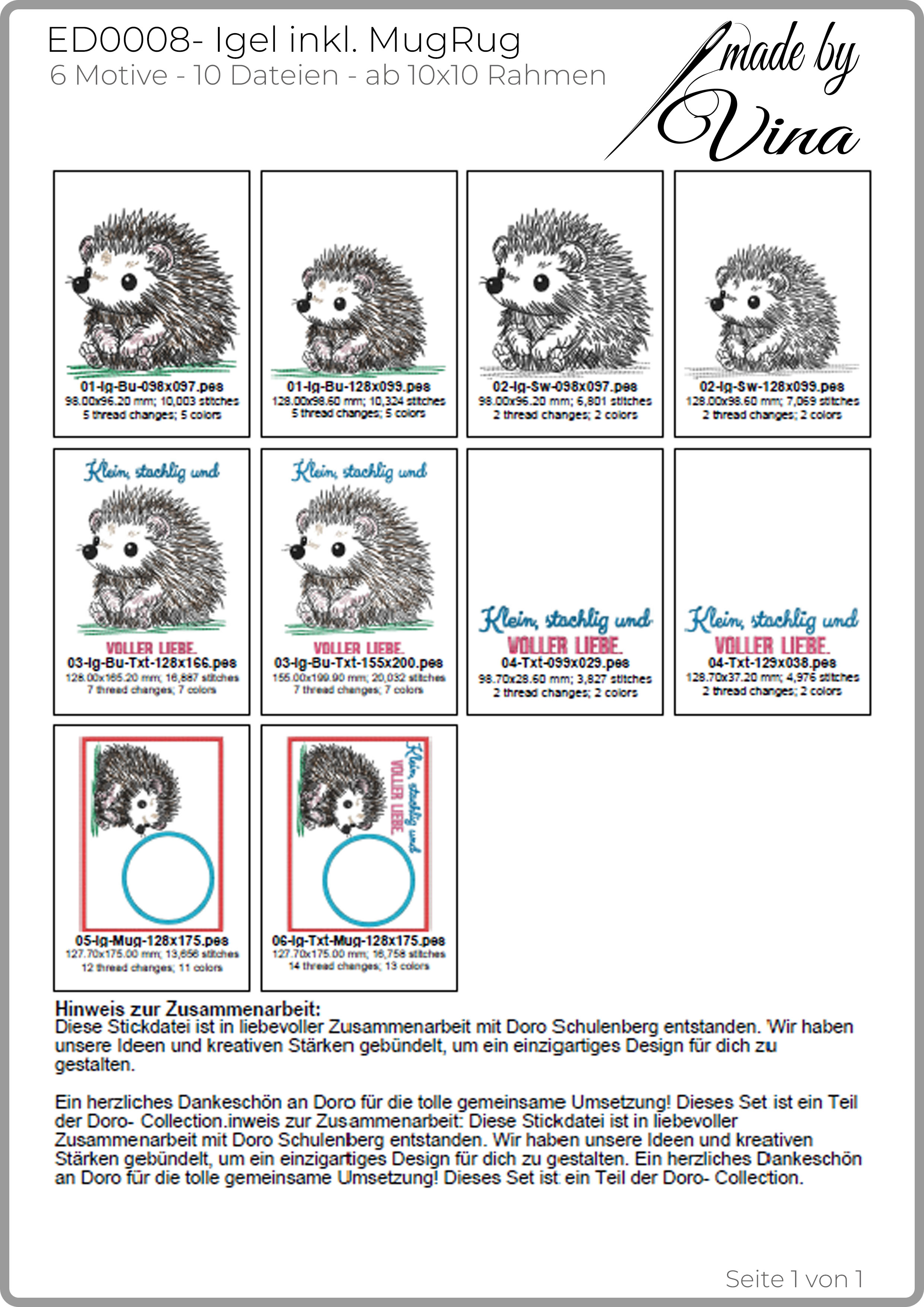 Dieses Design ist ein Herzensprojekt und wurde in Kooperation mit Doro Schulenberg erstellt. Dieses Set ist das Ergebnis einer wunderbaren Zusammenarbeit: Doros kreative Entwürfe und Digitalisierungen kombiniert mit meiner technischen Umsetzung / Digitalisierung und dem Feinschliff ergeben einzigartige und mit Herz gestaltete Stickdateien.