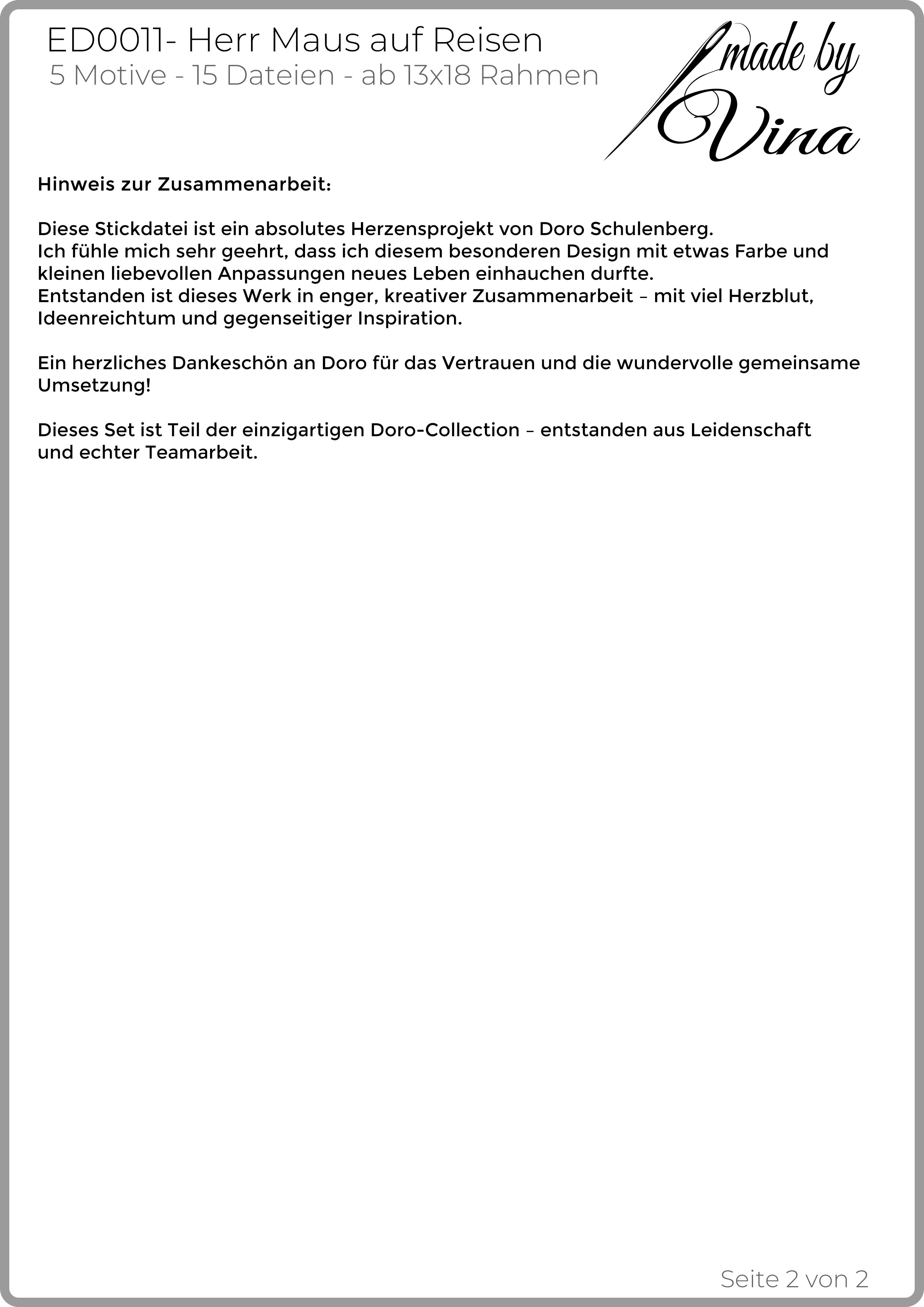 Ein kleines Abenteuer im Stickrahmen: „Herr Maus auf Reisen“ bringt nostalgischen Skizzen-Charme auf Taschen, Kissen, Buchhüllen, Kinderkleidung & Deko. Die Motive gibt es als einfarbige Sketch/Line-Variante sowie als farbige Shabby-Version – dazu passende Schriftzüge. So kombinierst du ganz nach Projekt und Material.Dieses Stickdatei-Set entstand in enger Zusammenarbeit mit Doro Schulenberg. Ihre kreativen Ideen und liebevoll digitalisierten Entwürfe verschmelzen hier mit meiner Erfahrung in der Stickdatei-Erstellung zu einem harmonischen Ganzen. Herzlichen Dank an Doro für diese tolle Umsetzung! Das Set ist Teil der Doro-Collection.