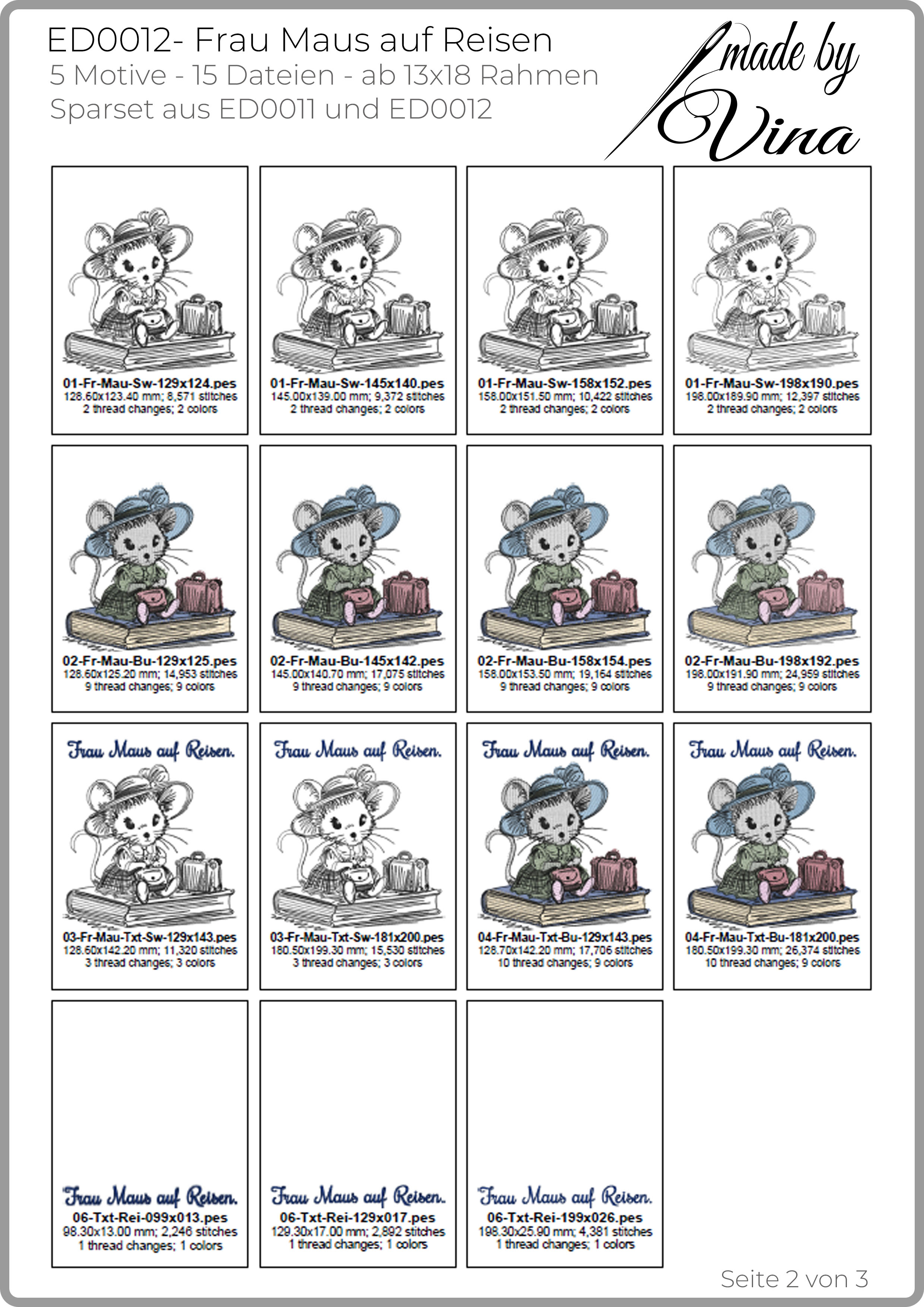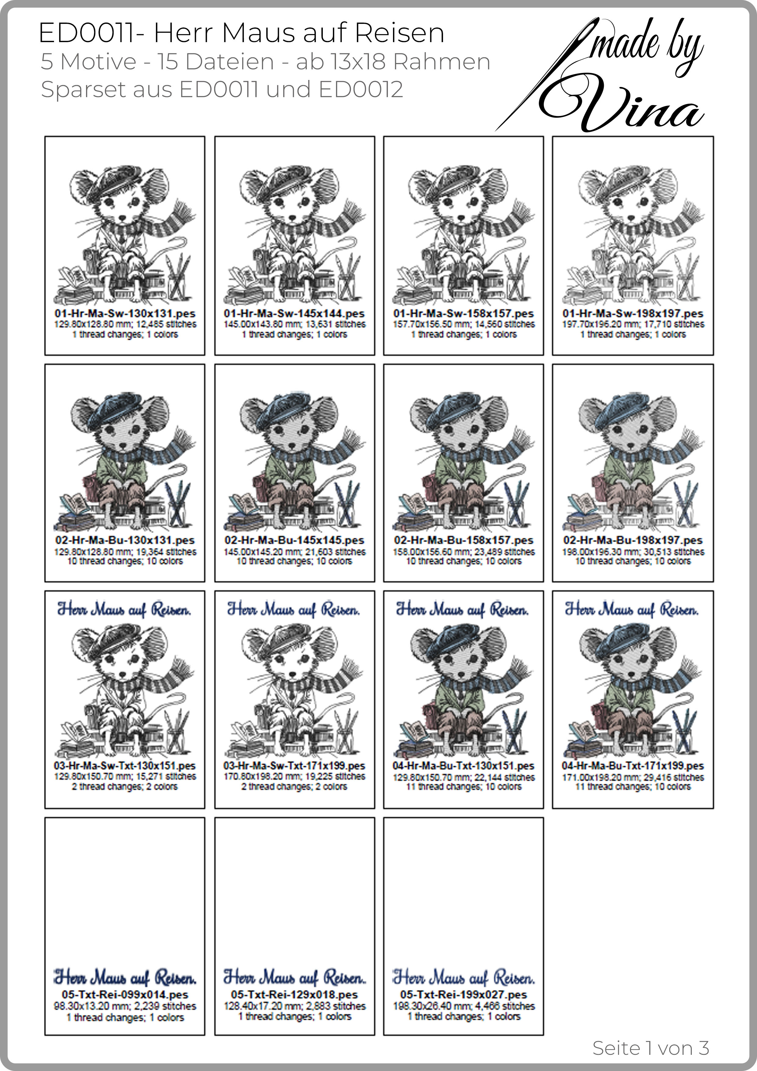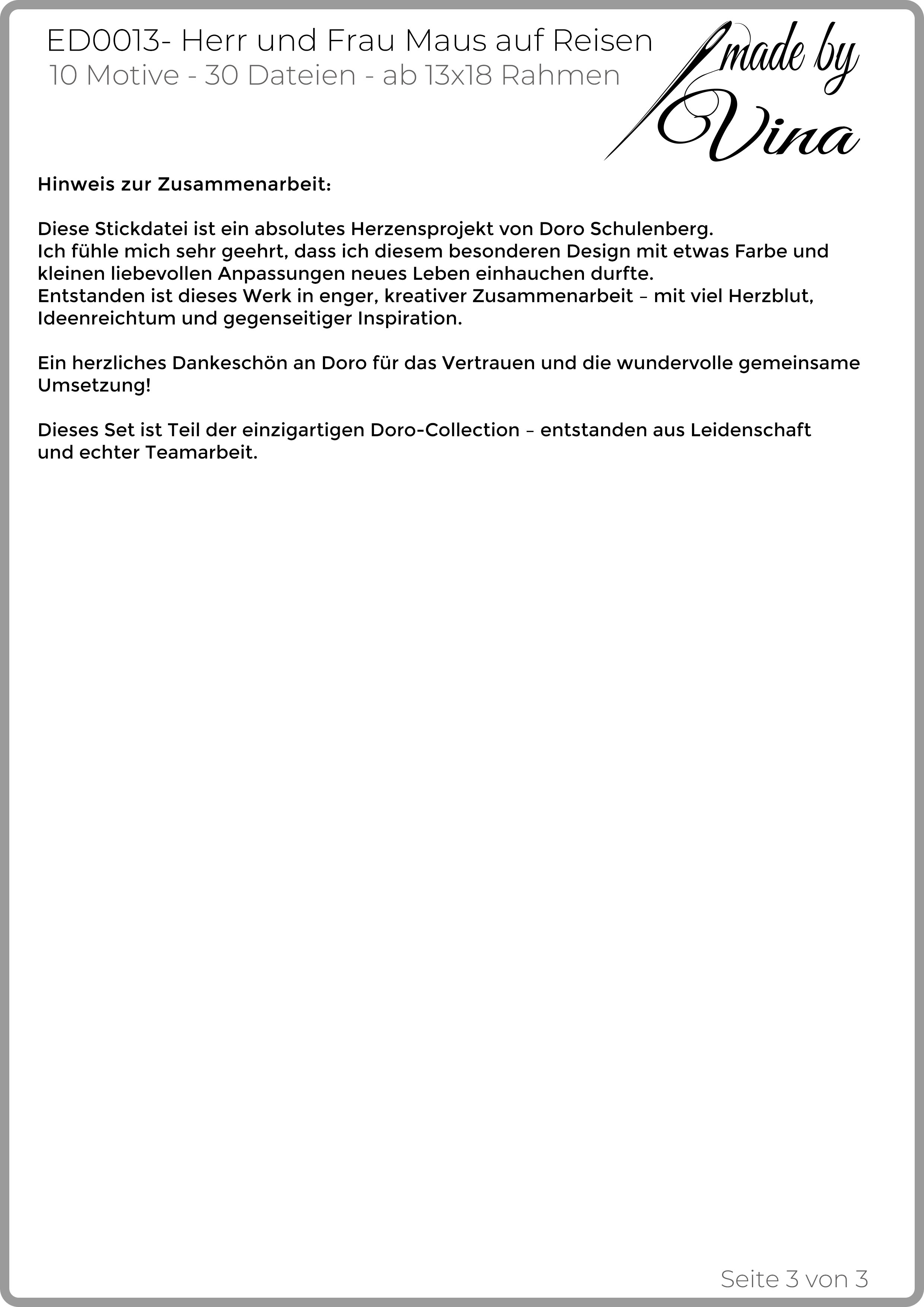 Zwei kleine Weltenbummler in einem Paket! Dieses Sparset vereint ED0011 „Herr Maus auf Reisen“ und ED0012 „Frau Maus auf Reisen“. Detaillierte Skizzen-Looks, farbige Varianten und Schriftzüge machen die Motive zu charmanten Begleitern für Kissen, Taschen, Buchhüllen, Mäppchen & Reise-Accessoires.Dieses Stickdatei-Set entstand in enger Zusammenarbeit mit Doro Schulenberg. Ihre kreativen Ideen und liebevoll digitalisierten Entwürfe verschmelzen hier mit meiner Erfahrung in der Stickdatei-Erstellung zu einem harmonischen Ganzen. Herzlichen Dank an Doro für diese tolle Umsetzung! Das Set ist Teil der Doro-Collection.