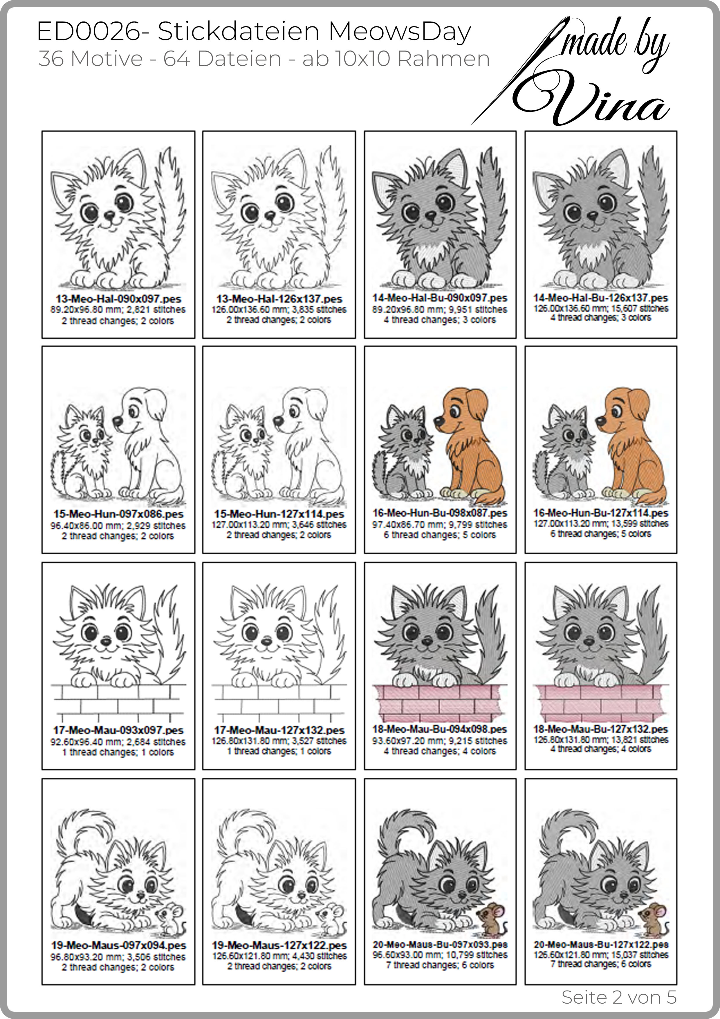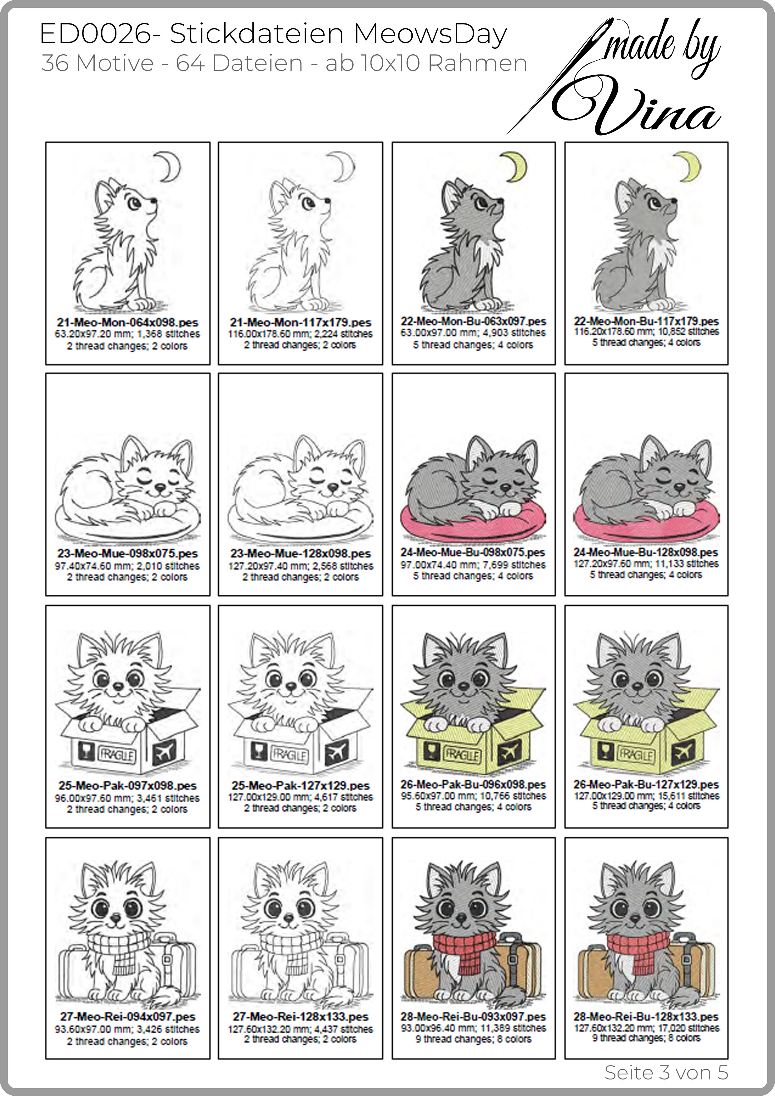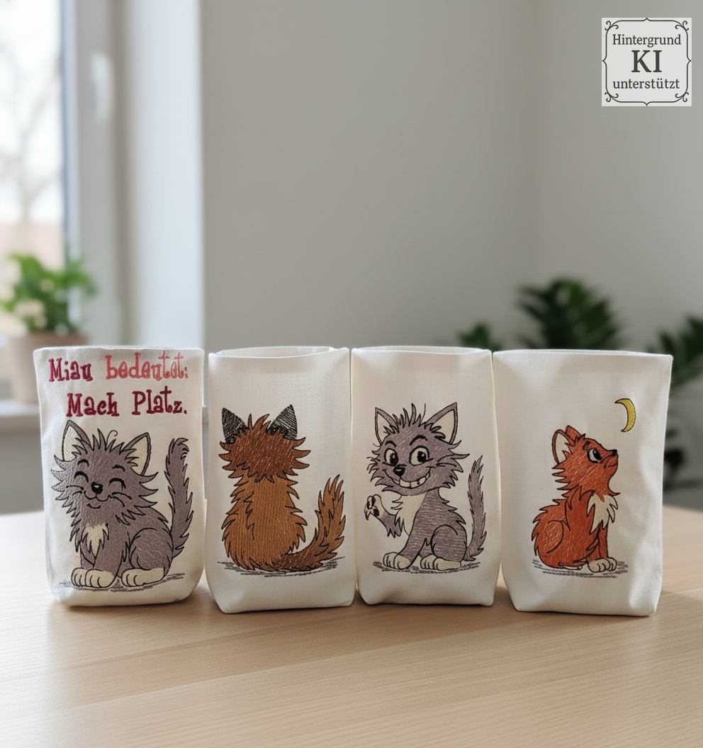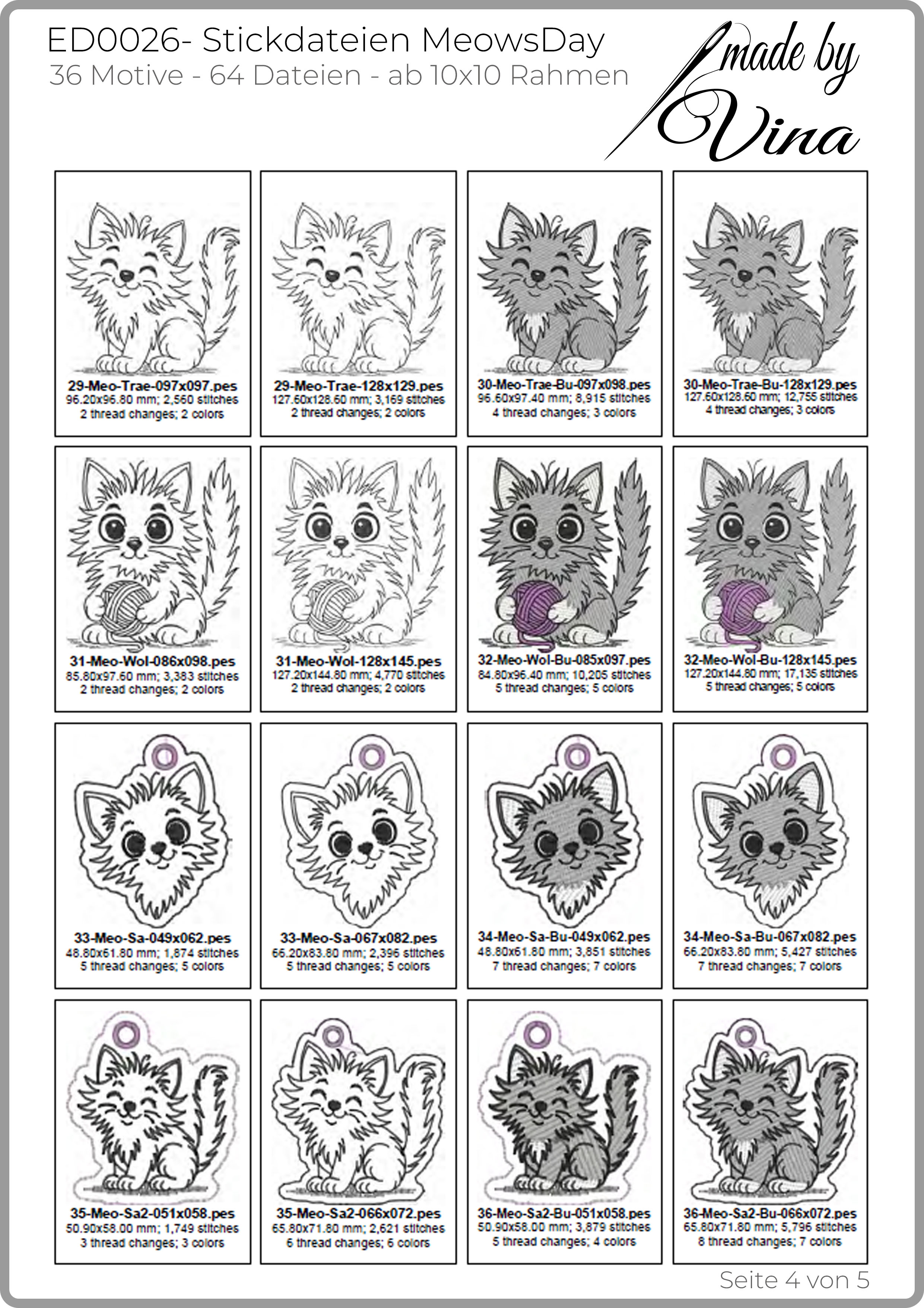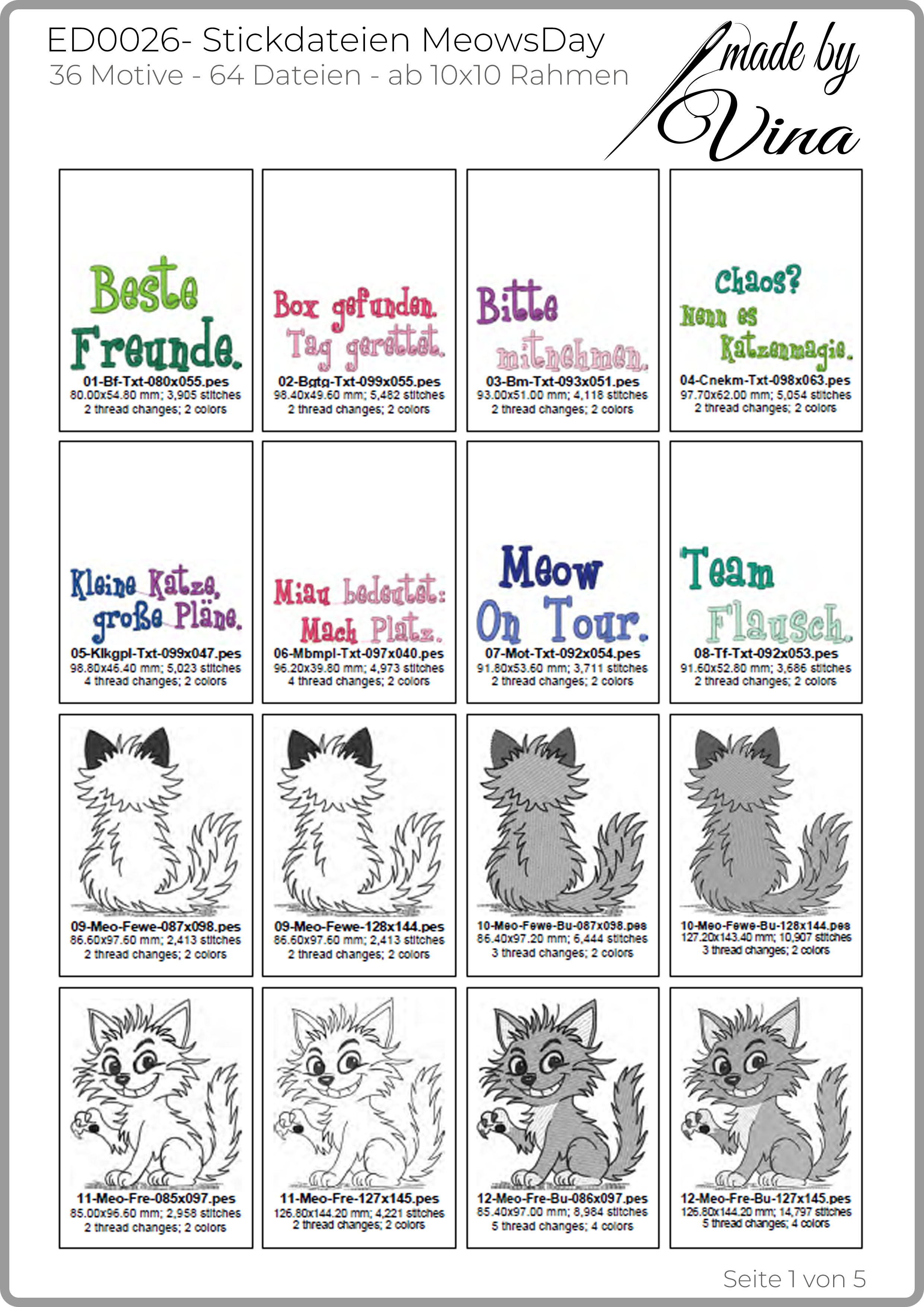 MeowsDay vereint viele Katzenmotive, passende Sprüche und kleine ITH-Anhänger in einem großen Set. Einige Motive sind im Shabby-Stil gearbeitet. Bei diesem Stil ist die Füllung bewusst nicht komplett deckend. Kleine Lücken, eine leicht unregelmäßige Fläche und eine weiche Used-Optik gehören dazu und sind gewollt. Dadurch wirkt das Motiv etwas ruhiger und weniger „perfekt“, ohne dass die Konturen davon betroffen sind. Das Set ist in enger Zusammenarbeit mit Doro Schulenberg entstanden und zeigt den typischen MeowsDay-Ausdruck, der sich auf Lichtsäcken, Taschen, Deko und Geschenkideen gut umsetzen lässt. Alle Dateien laufen sauber und bleiben trotz der Vielzahl gut überschaubar.