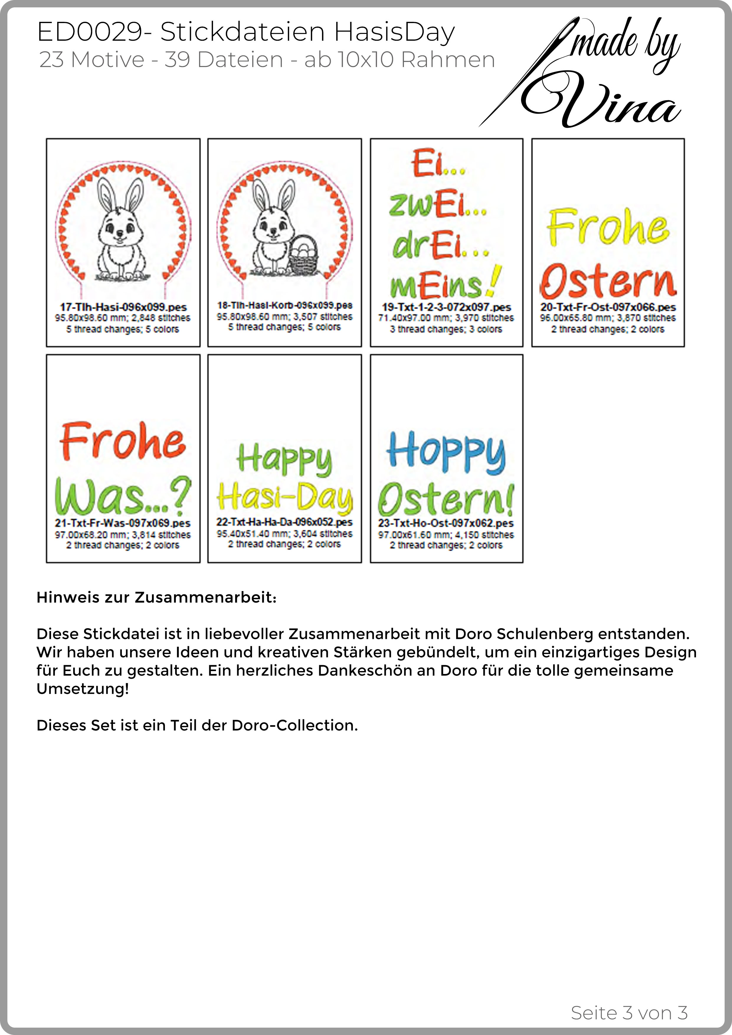 Solltest du Probleme mit der Nutzung in deinem Stickprogramm feststellen, zögere nicht, dich mit mir in Verbindung zu setzen. Gerne prüfe ich die Kompatibilität für dein Programm und versuche, eine passende Lösung anzubieten. Bitte habe jedoch Verständnis dafür, dass ich für die Programm-Kompatibilität keine Gewähr übernehmen kann.