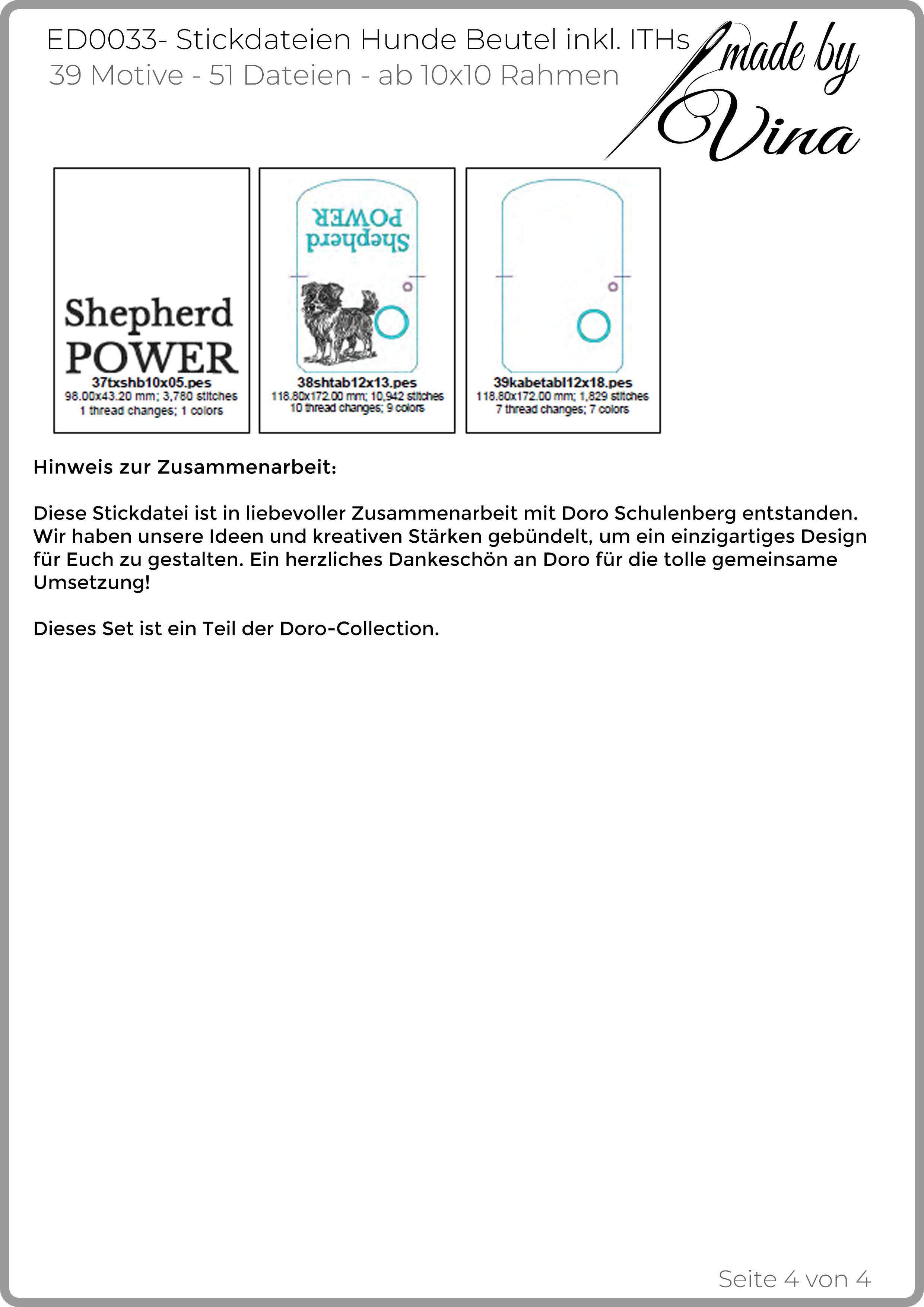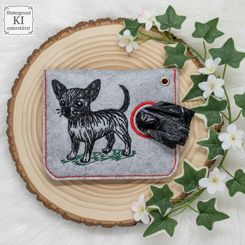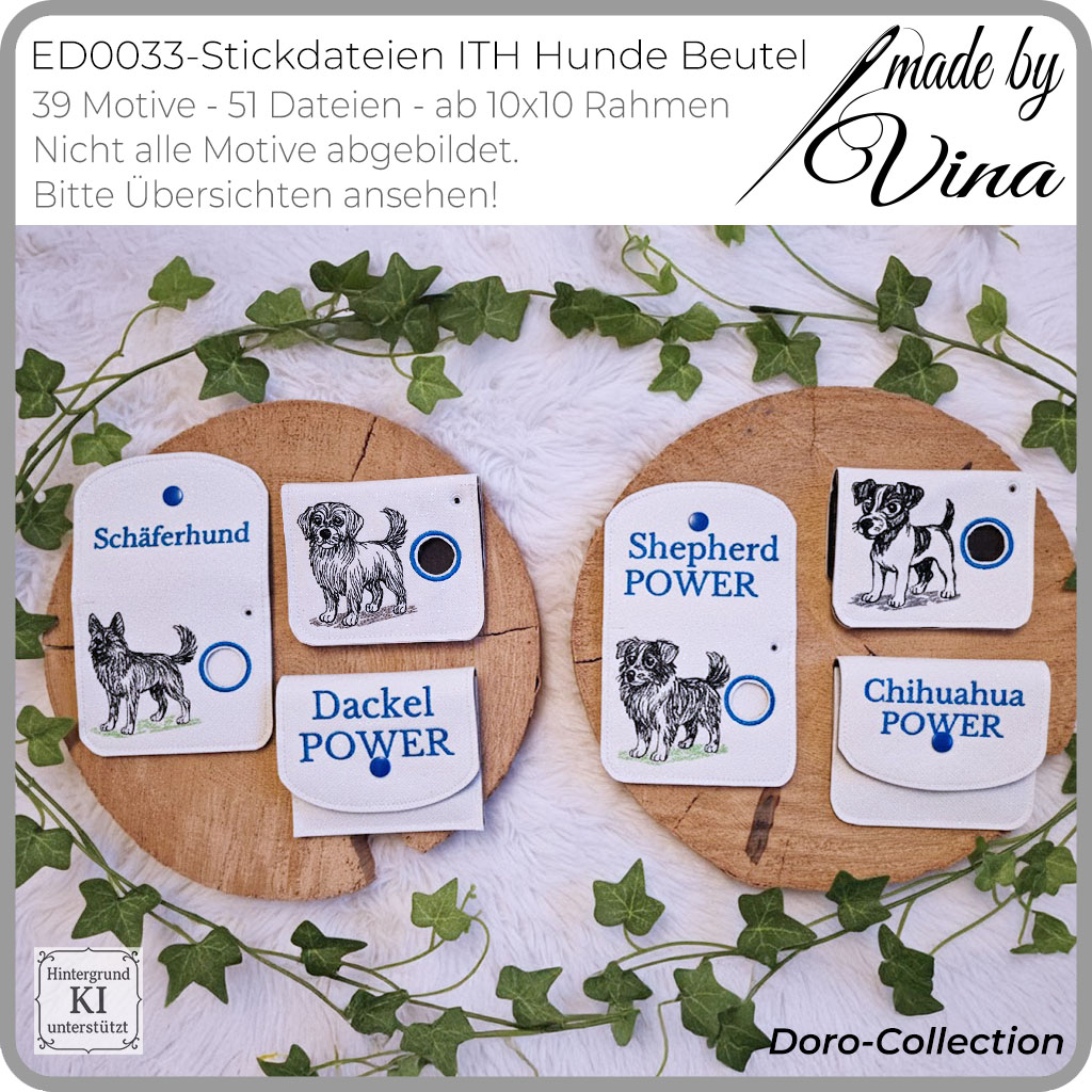 Dieses Set wurde speziell für praktische ITH-Beutel und Taschen für Hundekotbeutel entwickelt. Die Beutel sind kompakt gehalten und für einzelne Kotbeutel gedacht – Rollen passen bewusst nicht hinein. Neben den ITH-Dateien enthält das Set die Hundeillustrationen und Schriftzüge auch als Einzelmotive. So lassen sich die Designs flexibel einsetzen, zum Beispiel für Hüllen von Tierausweisen, kleine Taschen oder andere Hundeaccessoires. Die Motive wirken am besten mit dunklem Garn auf hellem Untergrund, da die feinen Linien und Details so klar zur Geltung kommen. Ton-in-Ton oder helle Garne auf dunklem Stoff werden nicht empfohlen, da die Wirkung dabei verloren geht bzw. die Motive nicht zu erkennen sind. Das Set ist in liebevoller Zusammenarbeit mit Doro Schulenberg entstanden und Teil der Doro-Collection.